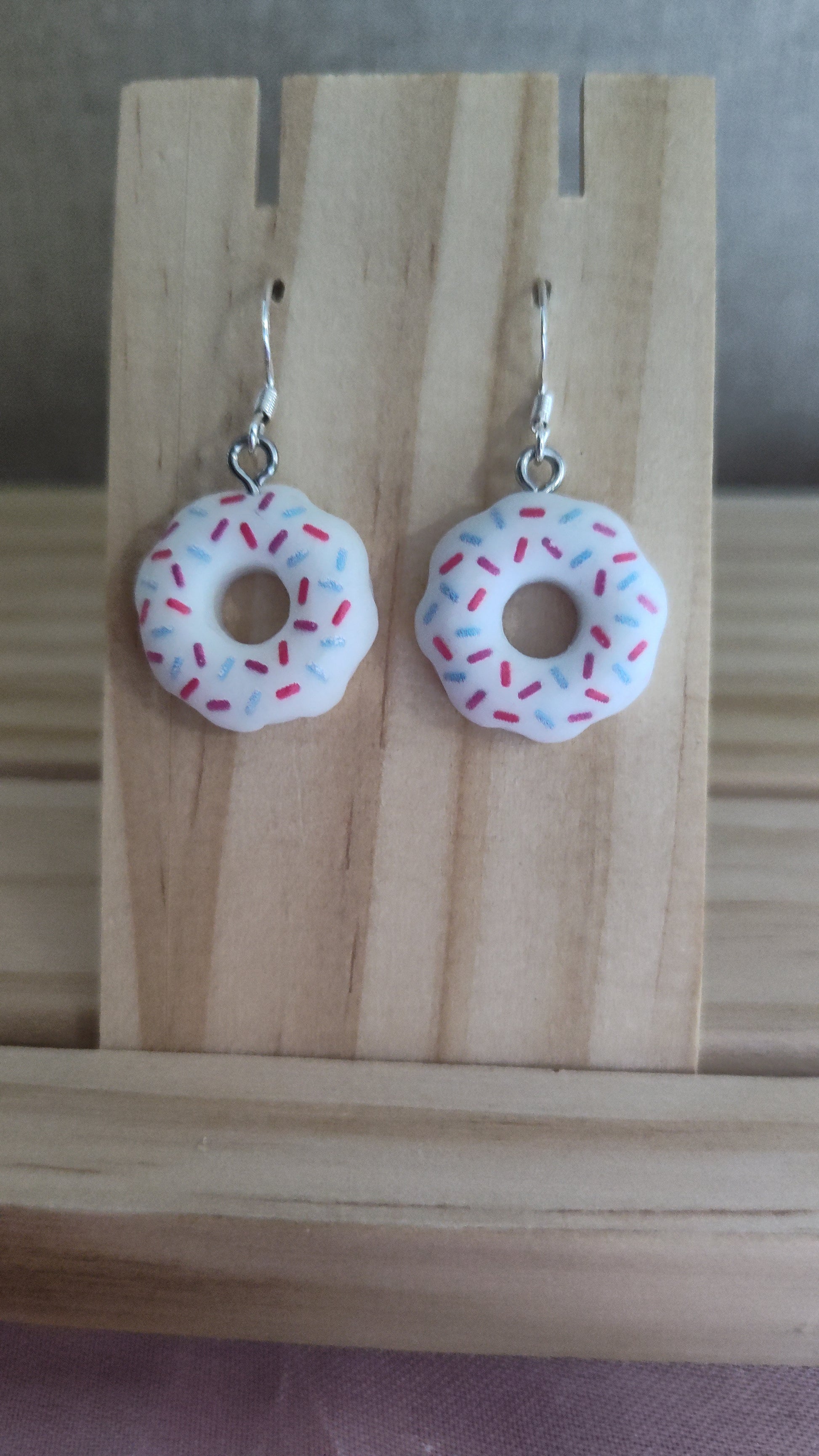 Cute and fun 3-D white donut earrings. Made with sterling silver plated hooks and hypoallergenic as well.