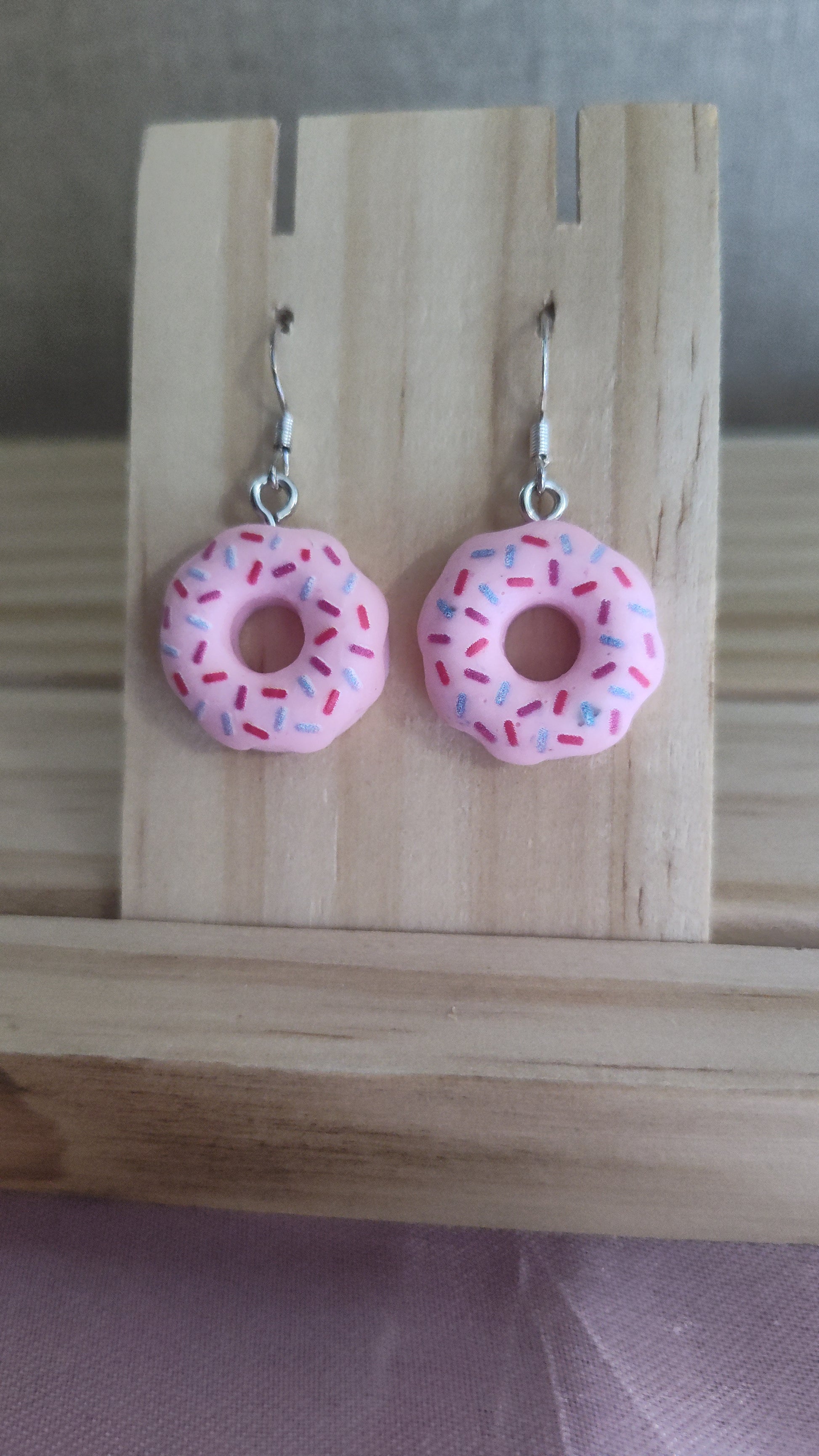 Cute and fun 3-D light pink donut earrings. Made with sterling silver plated hooks and hypoallergenic as well.