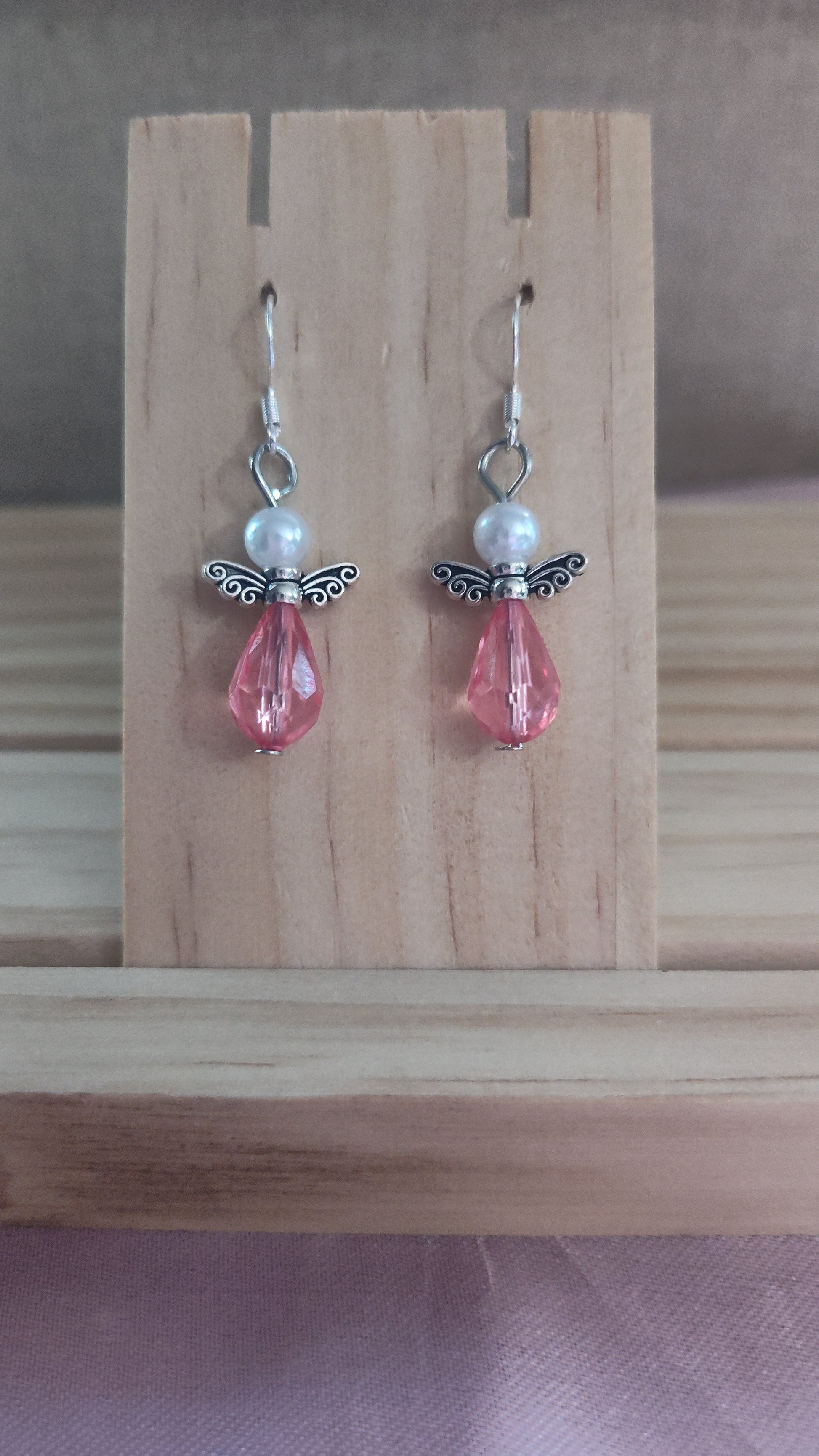 Beautiful silver and pink angel earrings. Made with sterling silver plated hooks and hypoallergenic as well.
