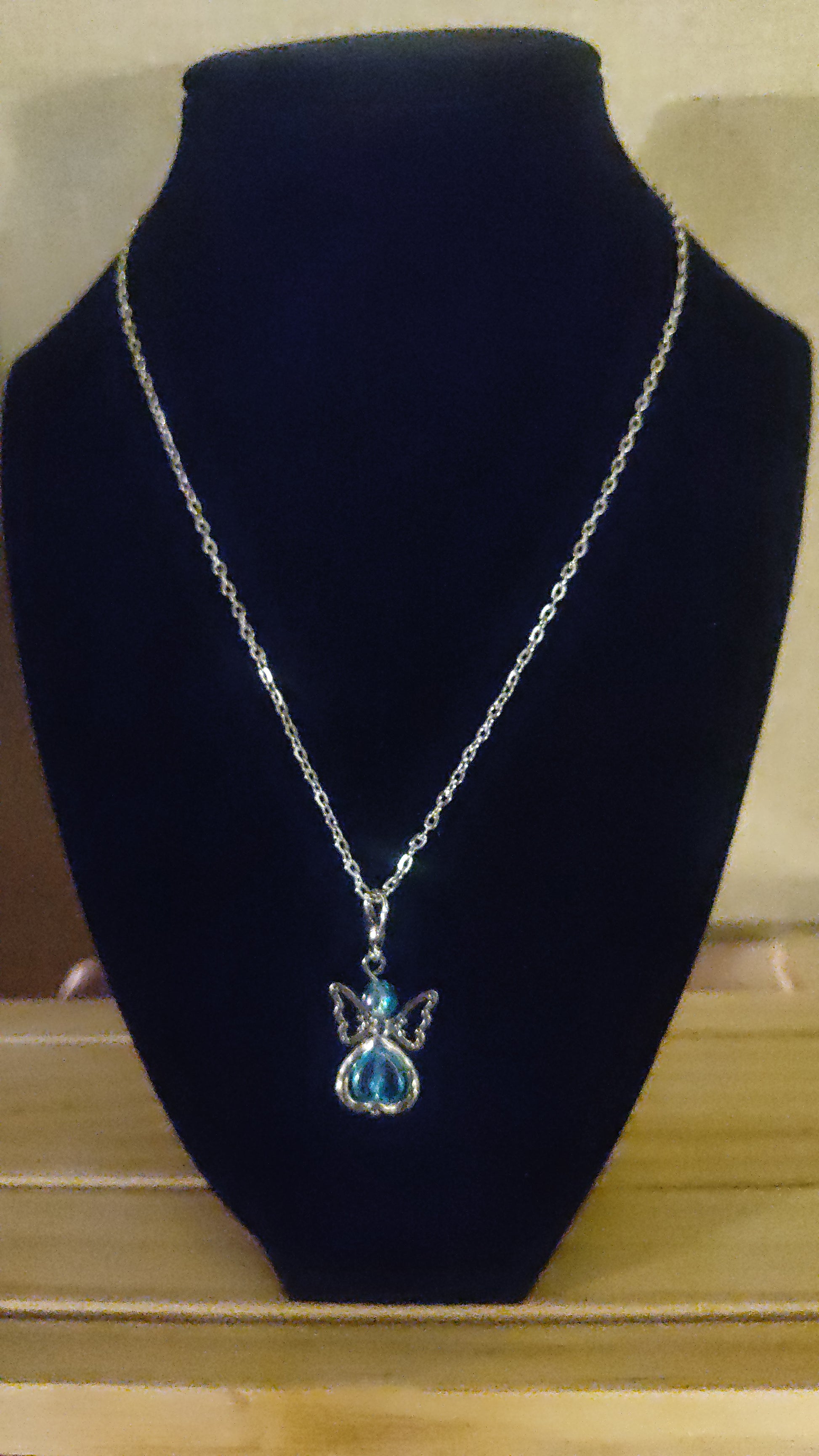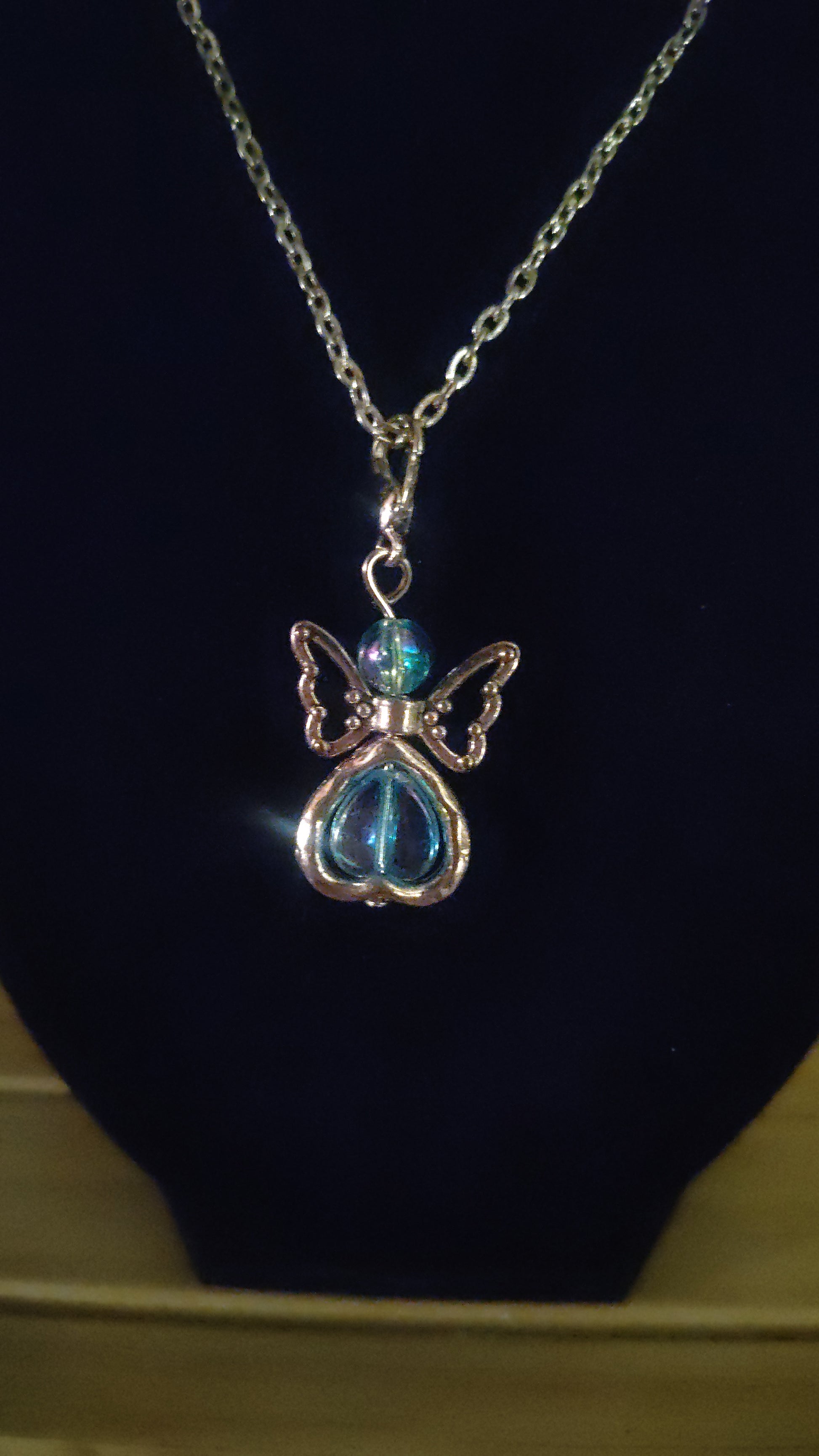 Beautiful silver and blue angel necklace.