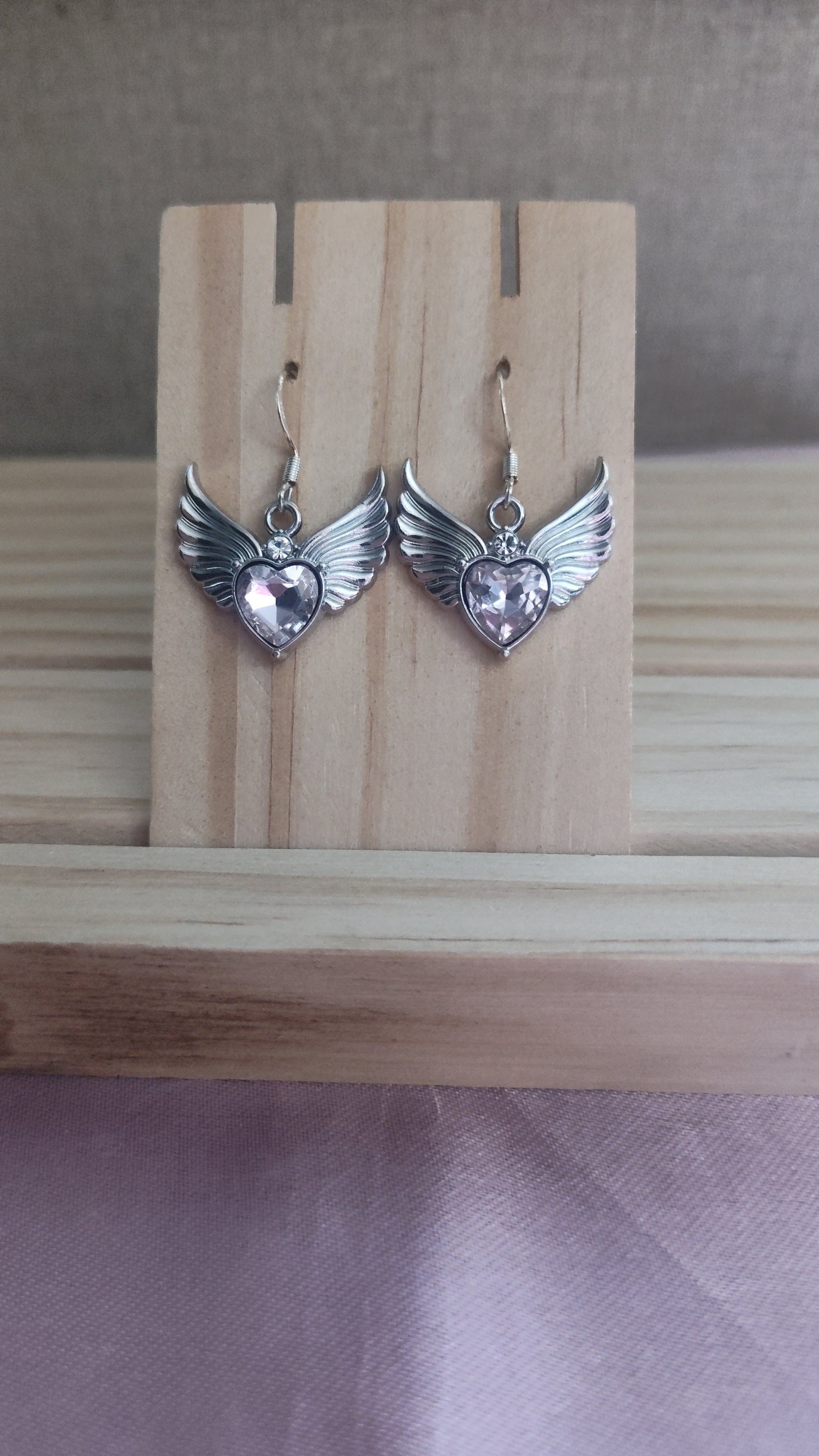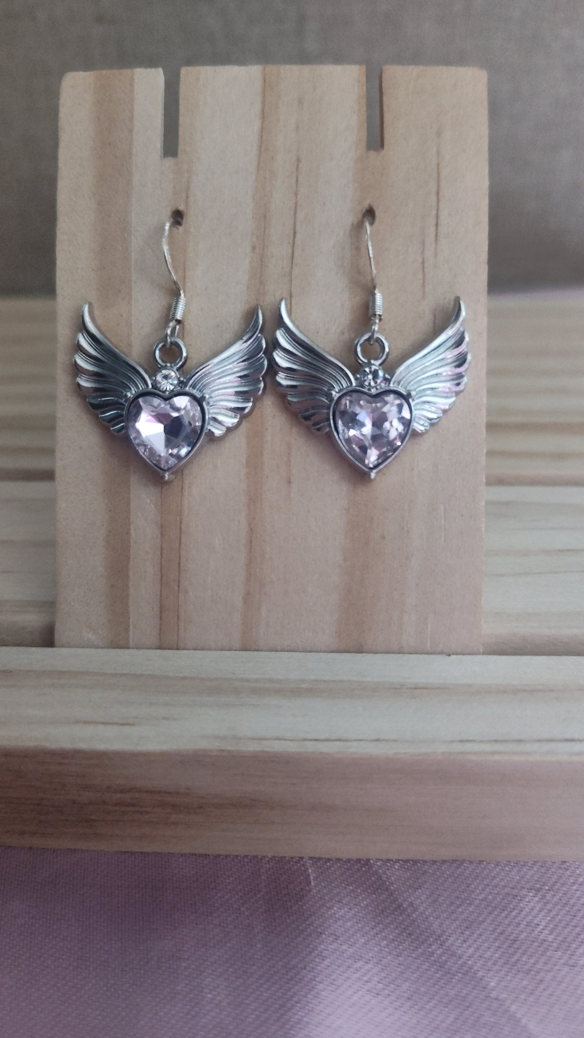 Beautiful silver Angel Wing Earrings with pink rhinestone. Made with sterling silver plated hooks and hypoallergenic as well.
