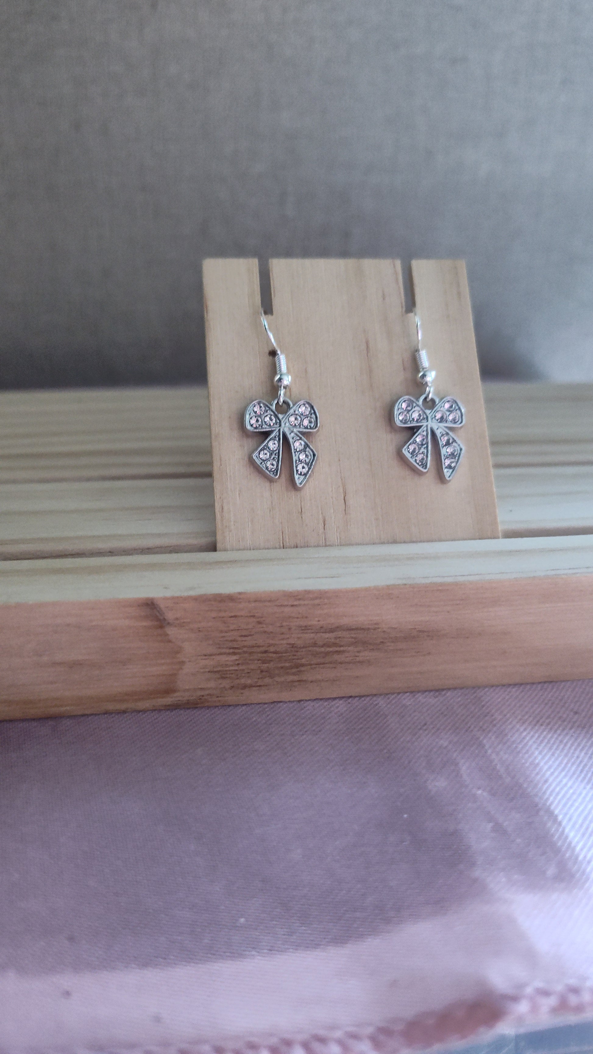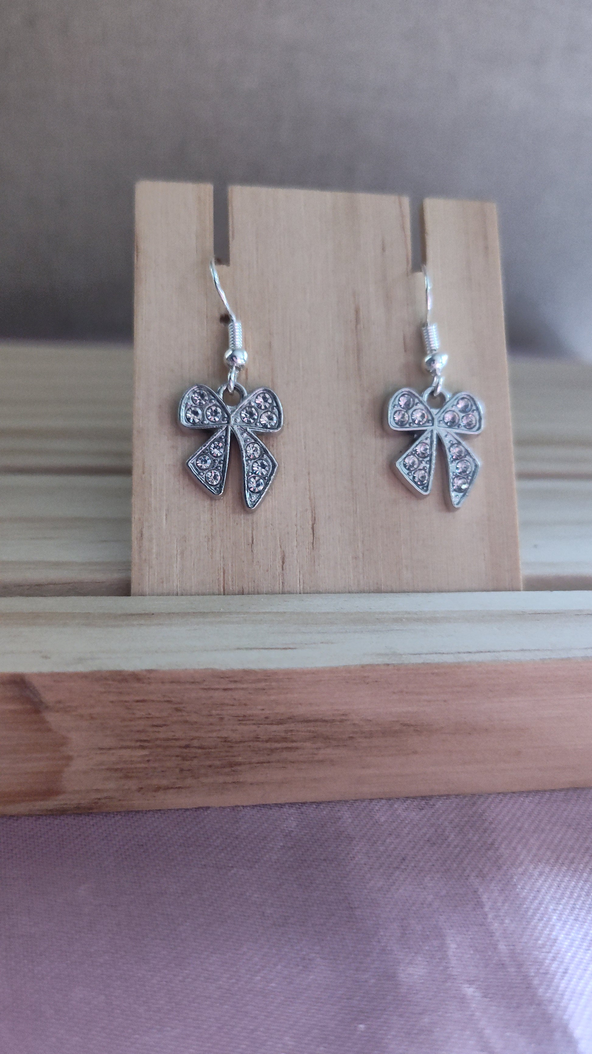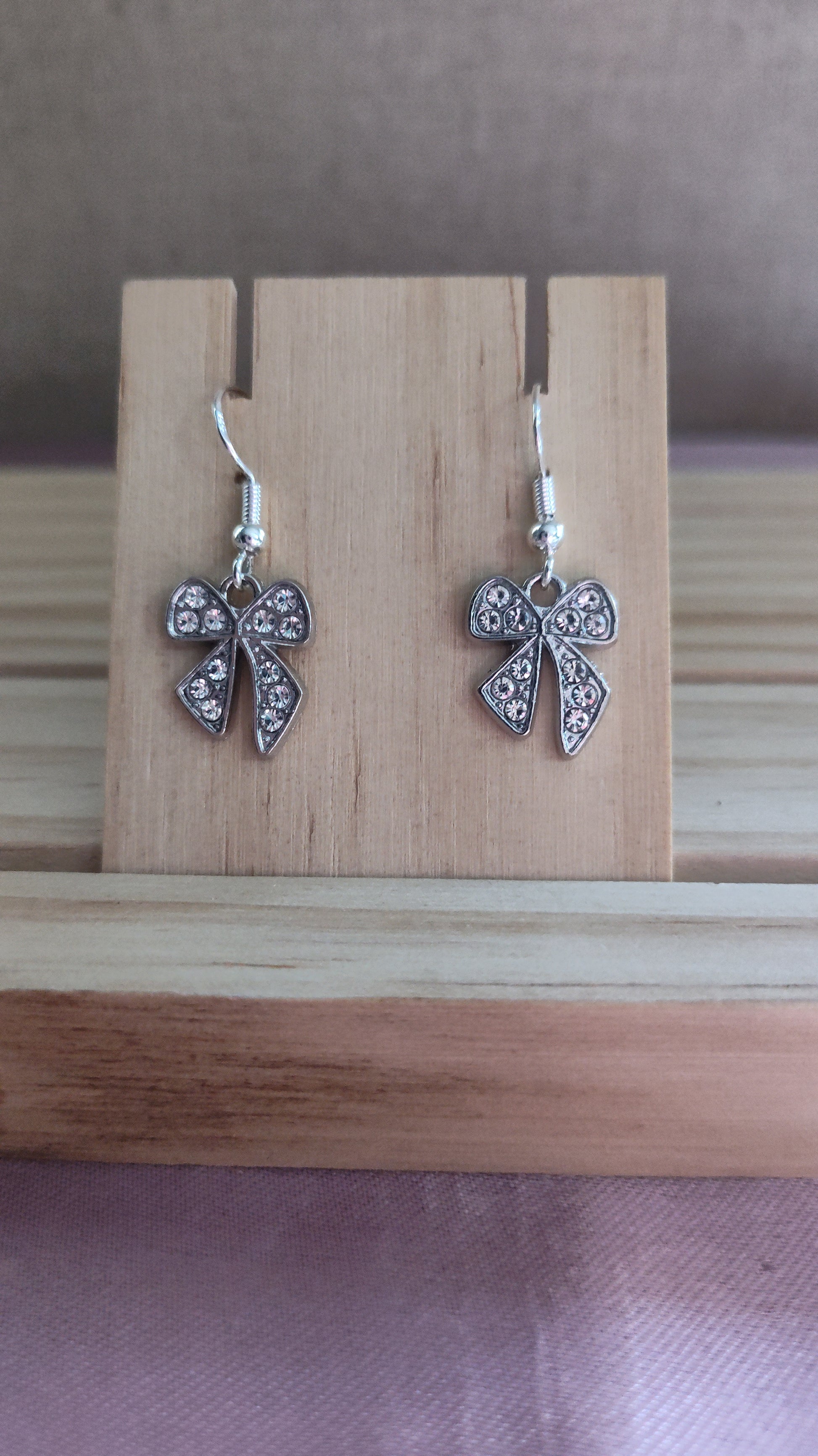 Cute silver bow earrings with rhinestones. Made with sterling silver plated hooks and hypoallergenic as well.