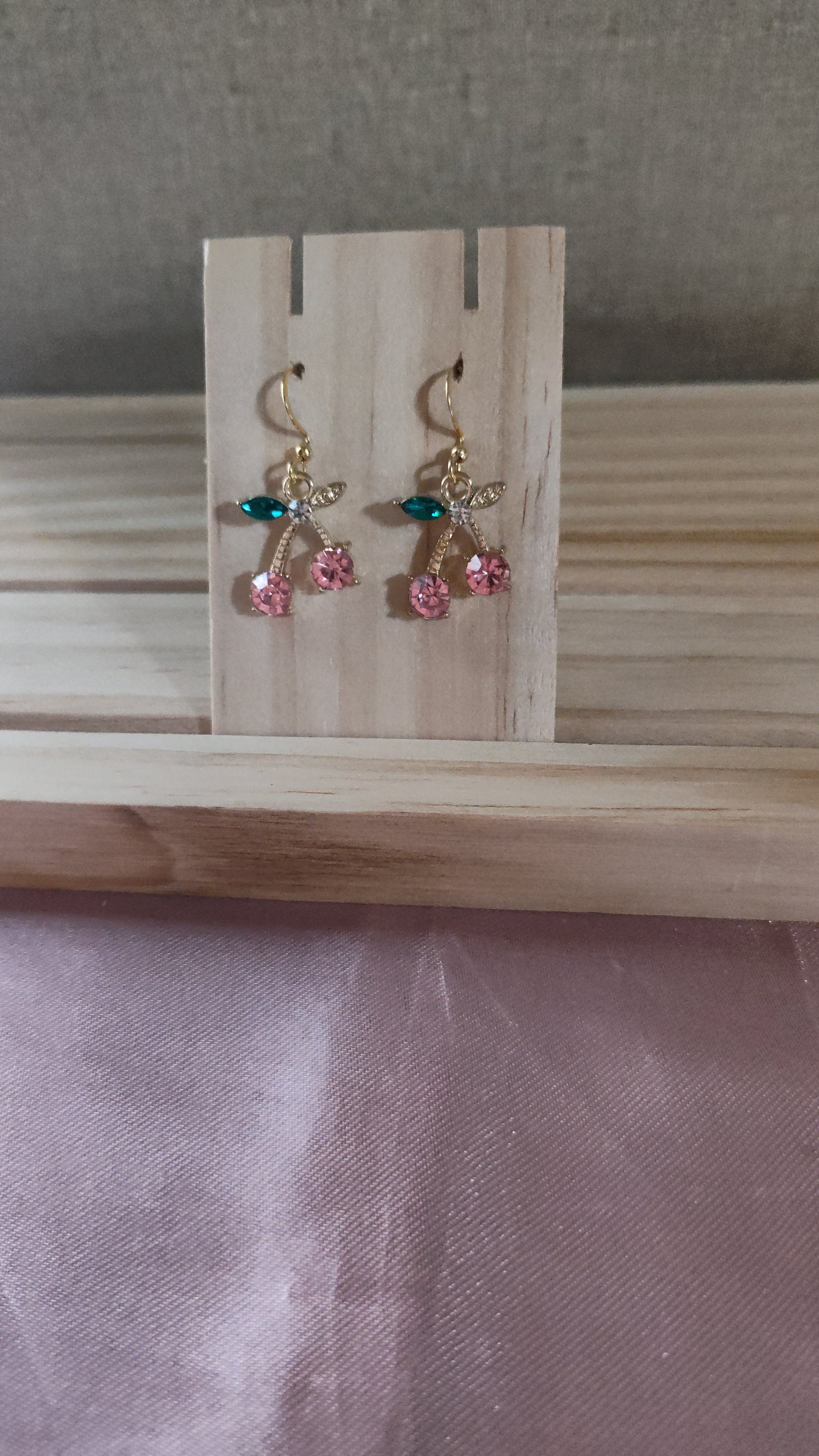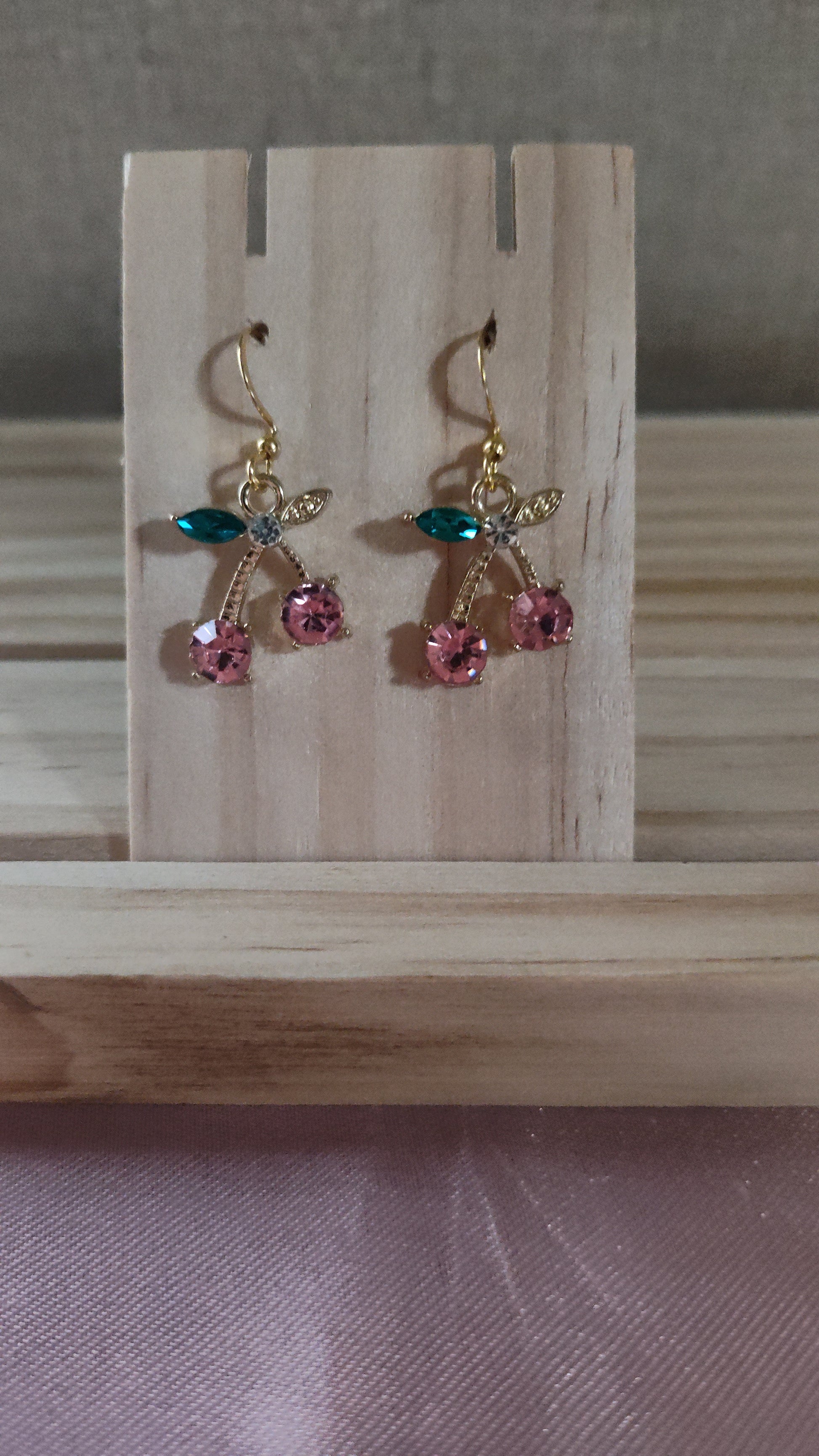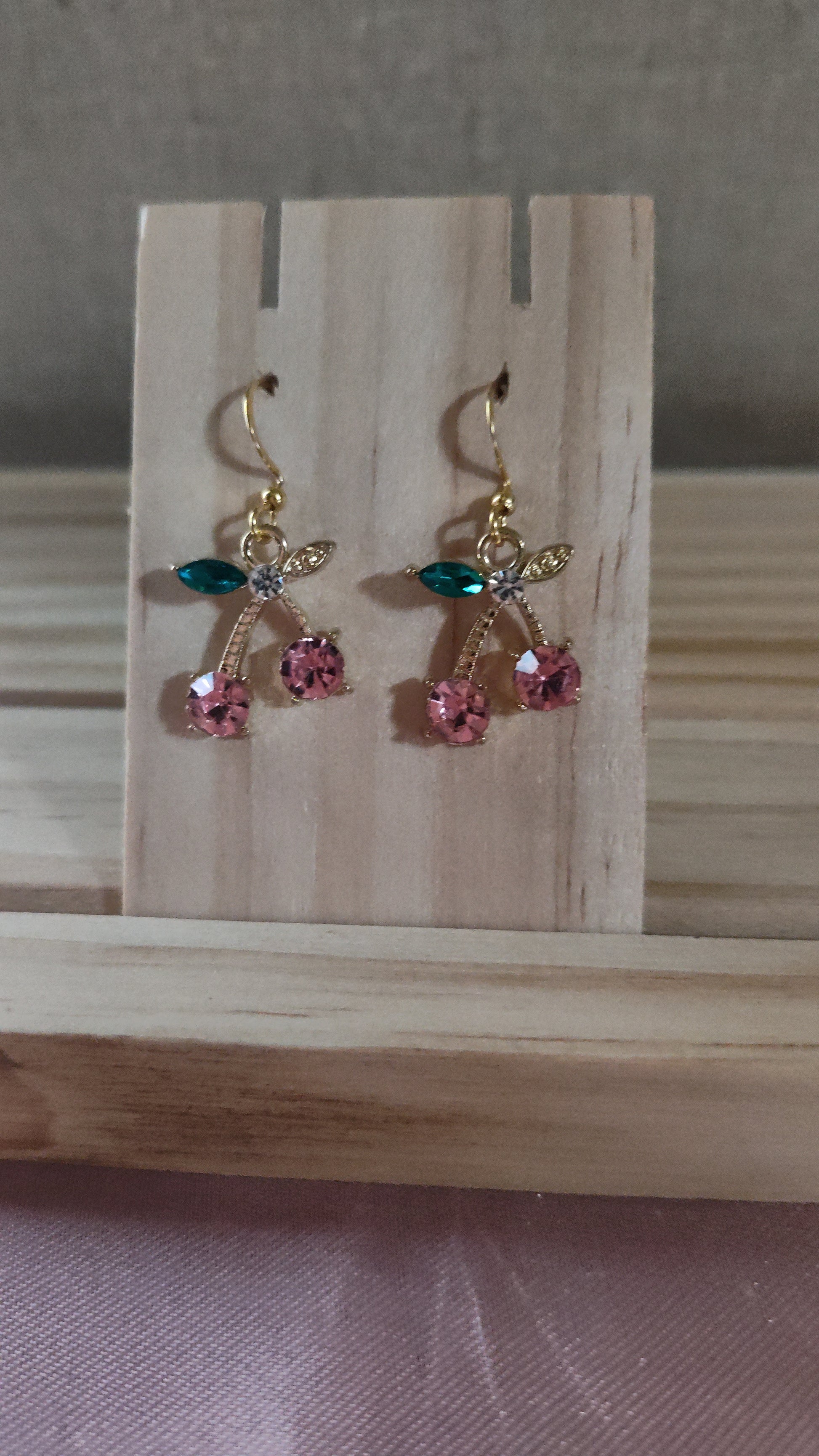 Beautiful cherry earrings with rhinestones. Made with 18k gold sterling silver plated hooks and hypoallergenic as well.