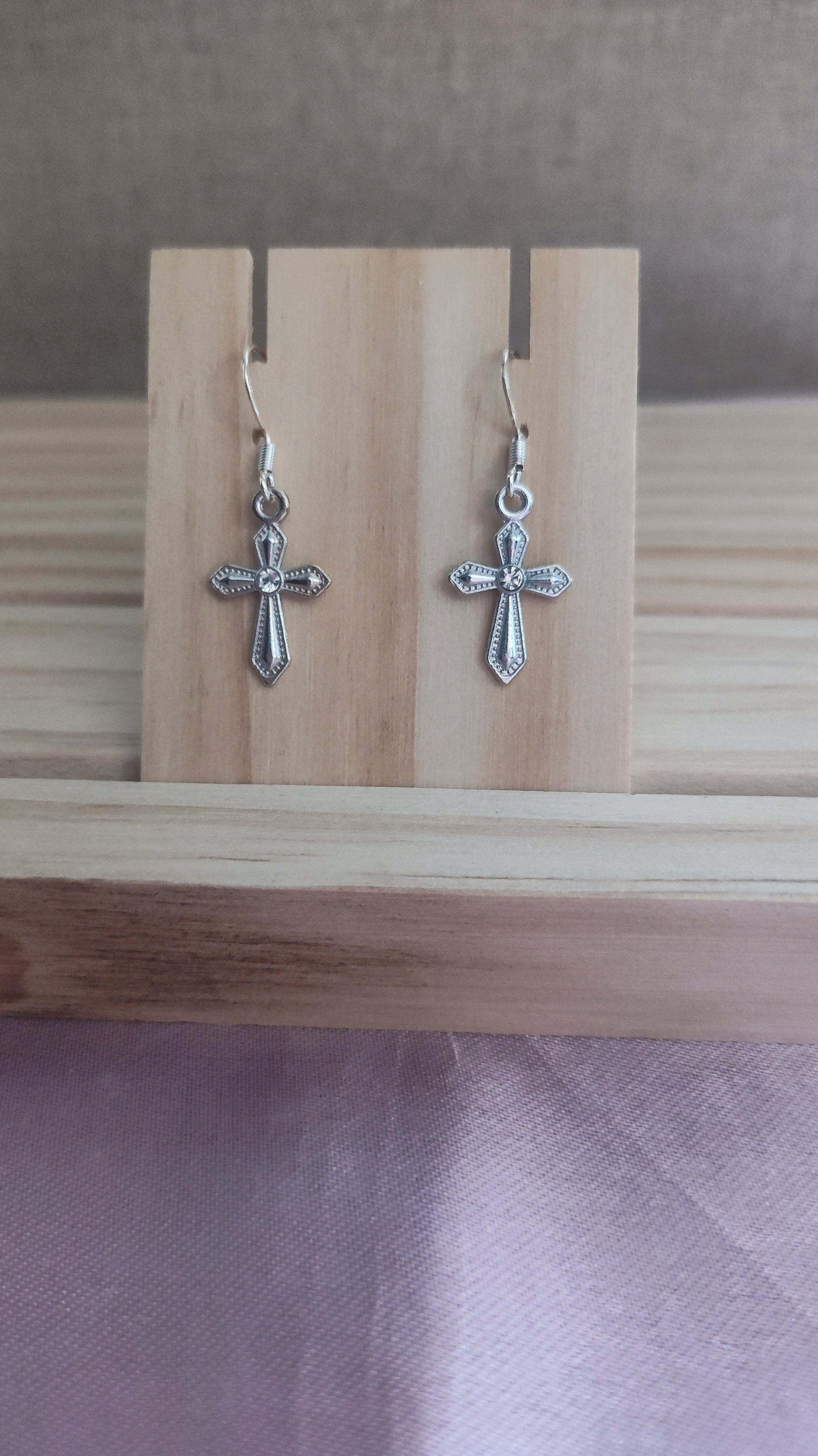 Small and dainty silver cross earrings with rhinestone. Made with sterling silver plated hooks and hypoallergenic as well.