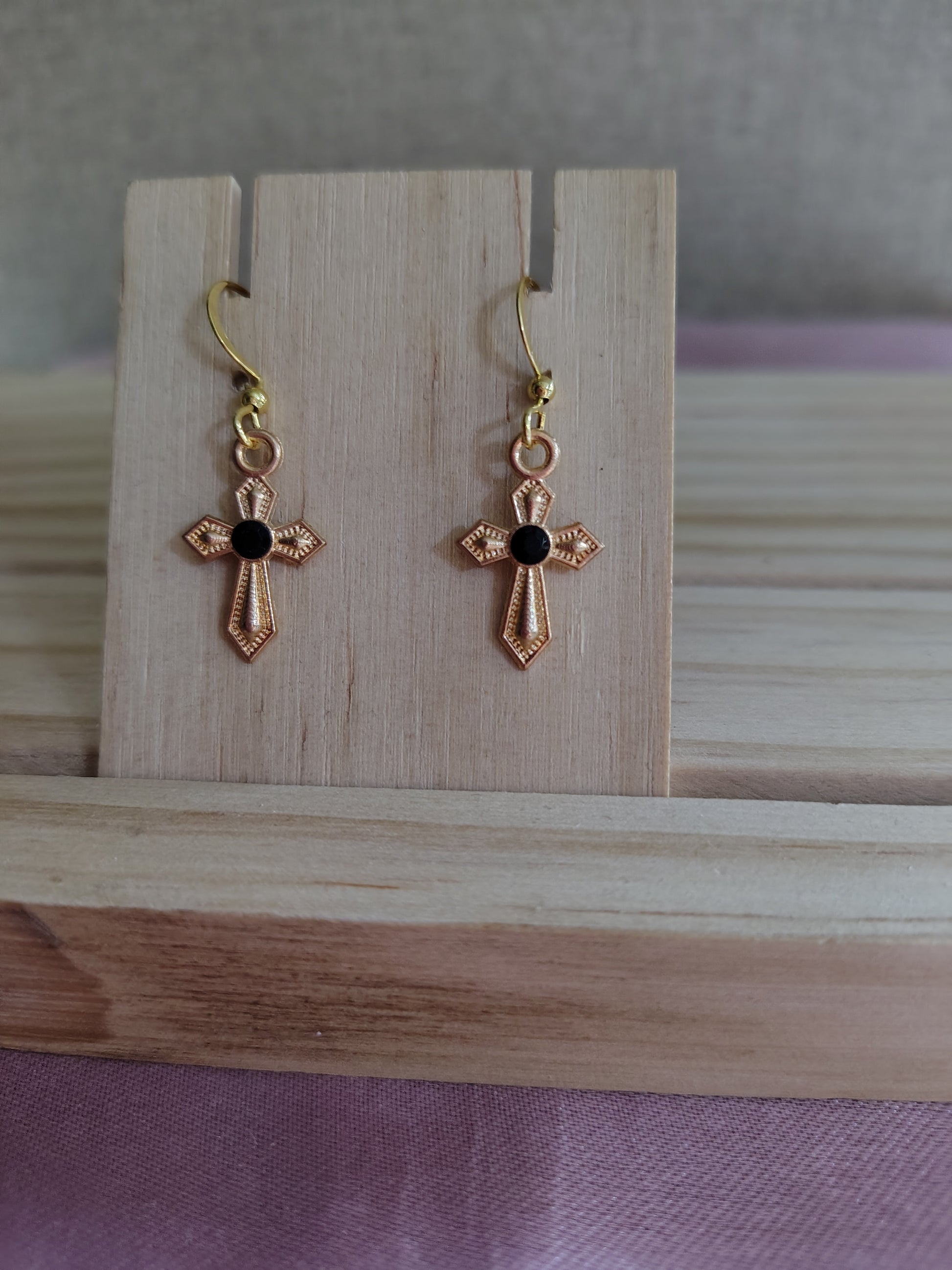 Beautiful XS gold cross with black rhinestone earrings. Made with 18k gold plated hooks and hypoallergenic as well.