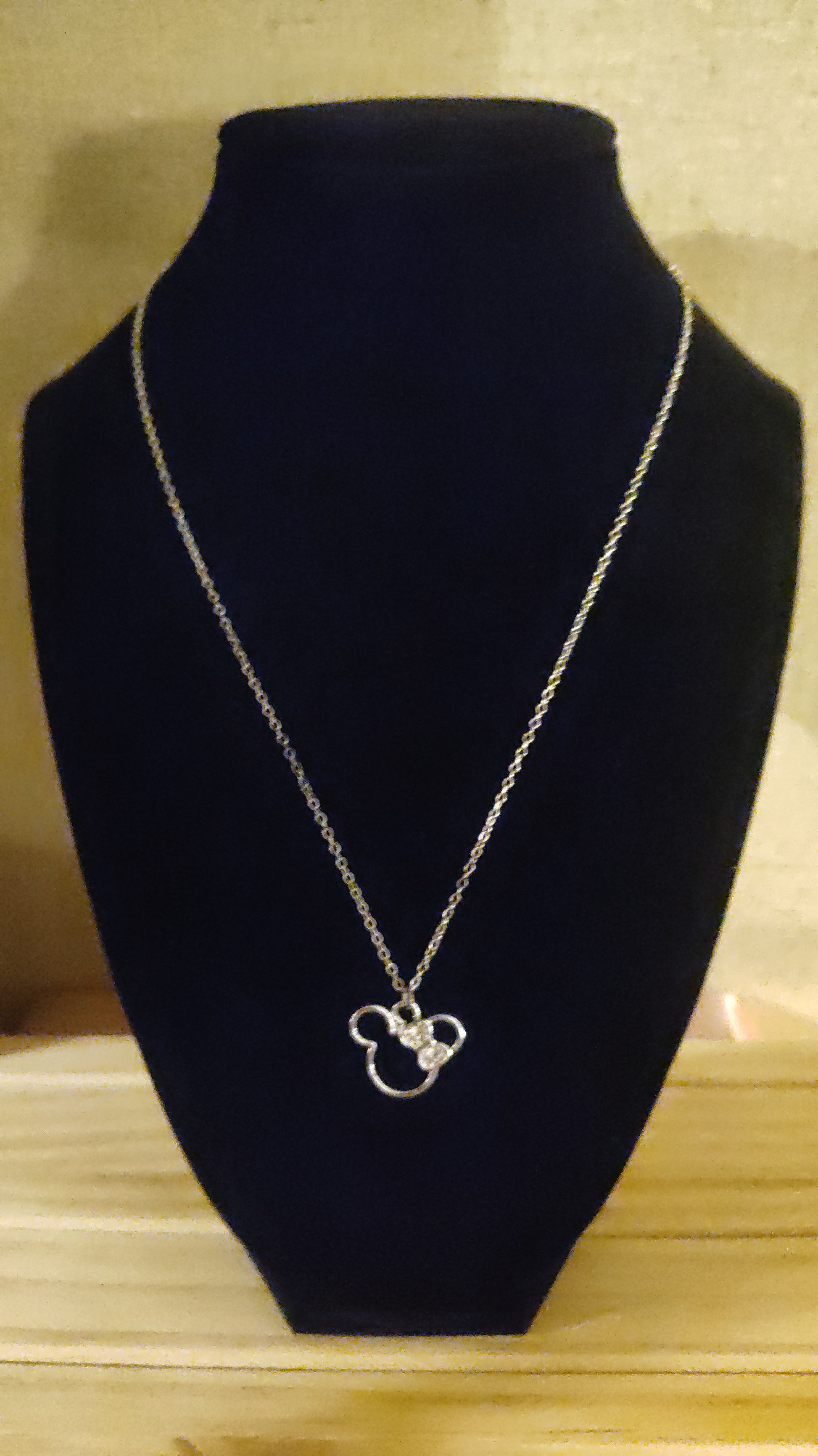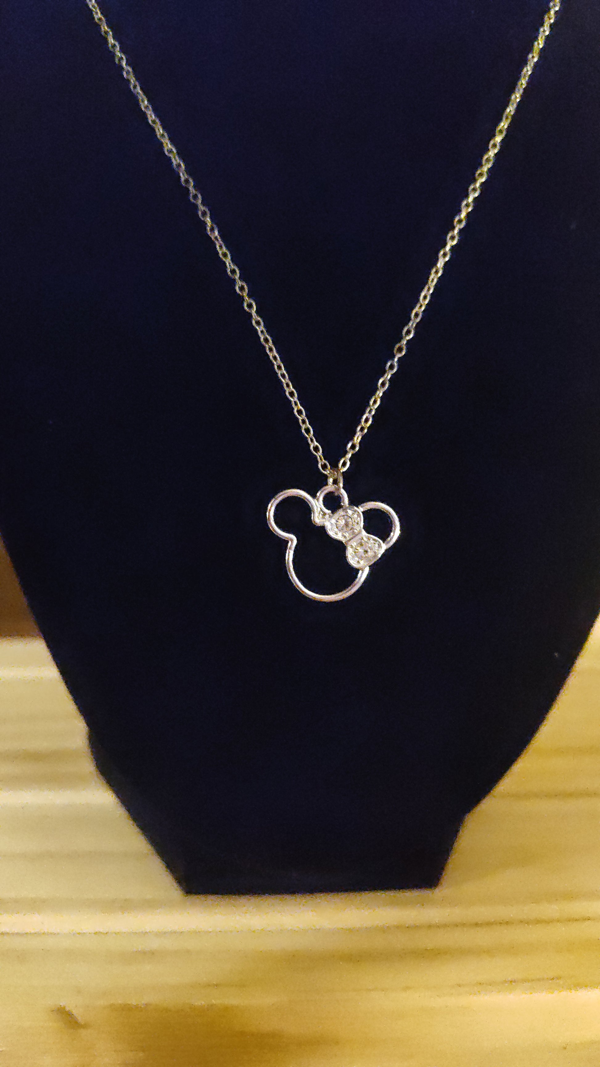 Beautiful silver Minnie Mouse necklace with bow and rhinestones.
