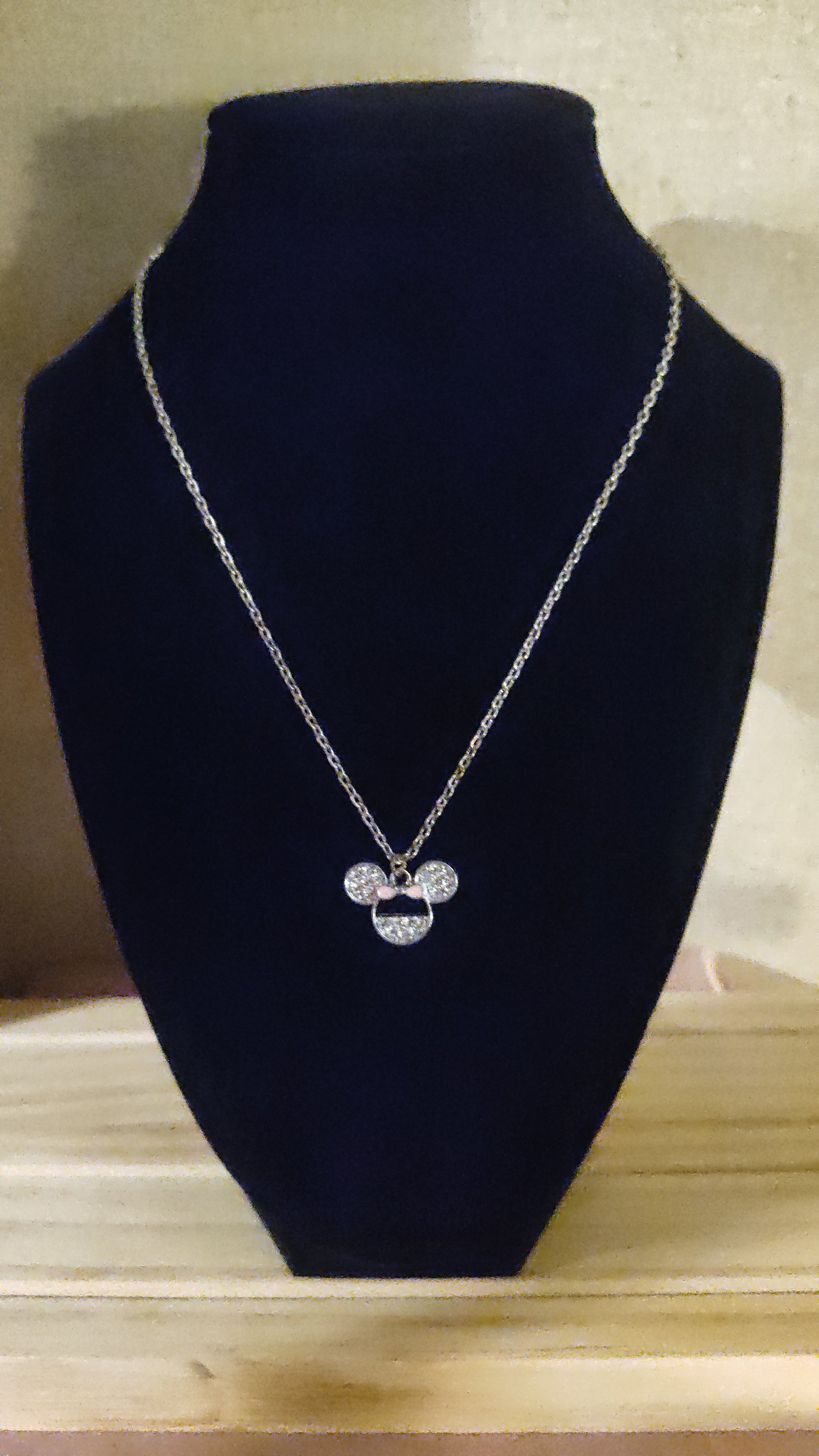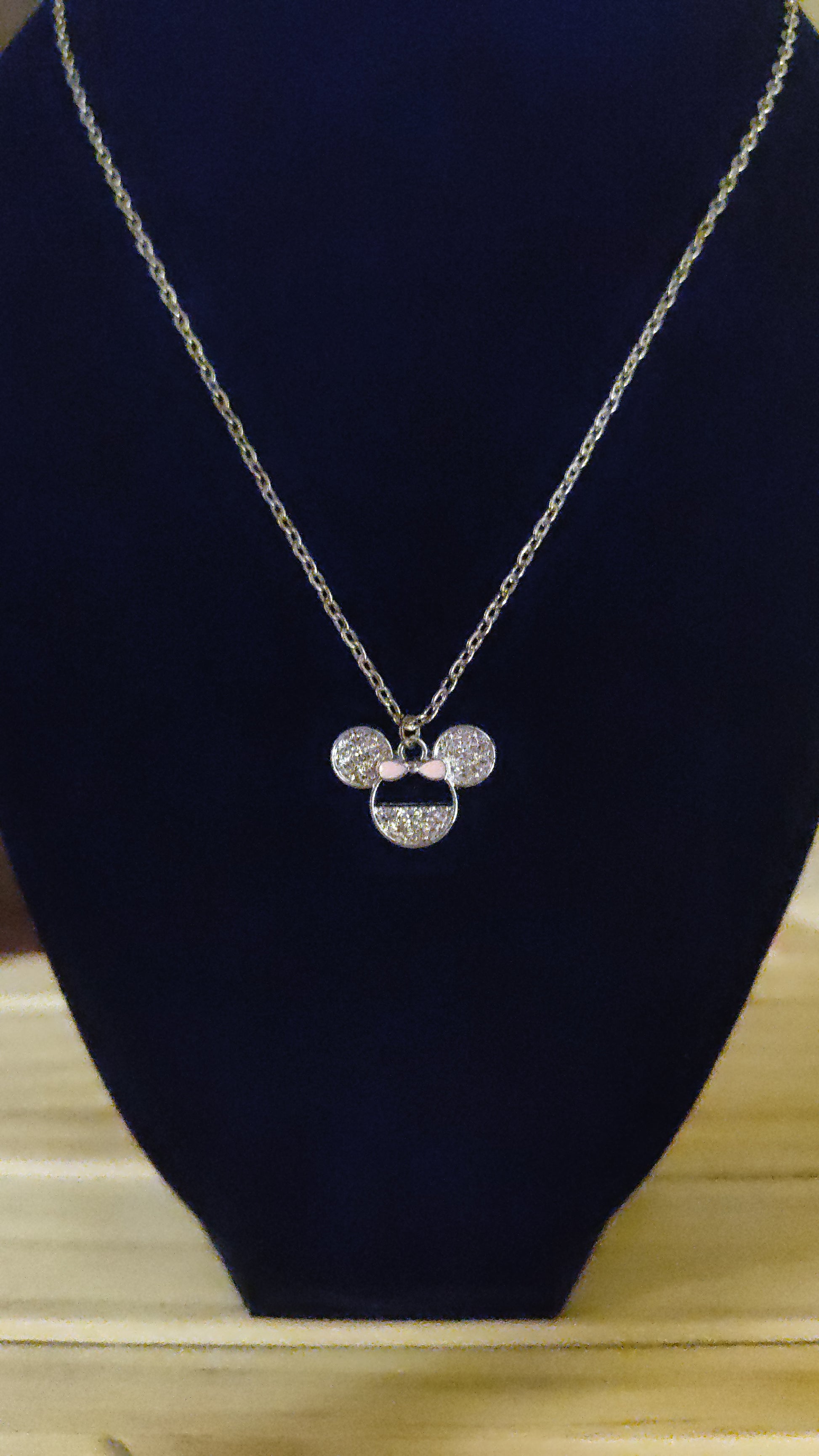 Beautiful silver Minnie Mouse necklace with pink bow and rhinestones.