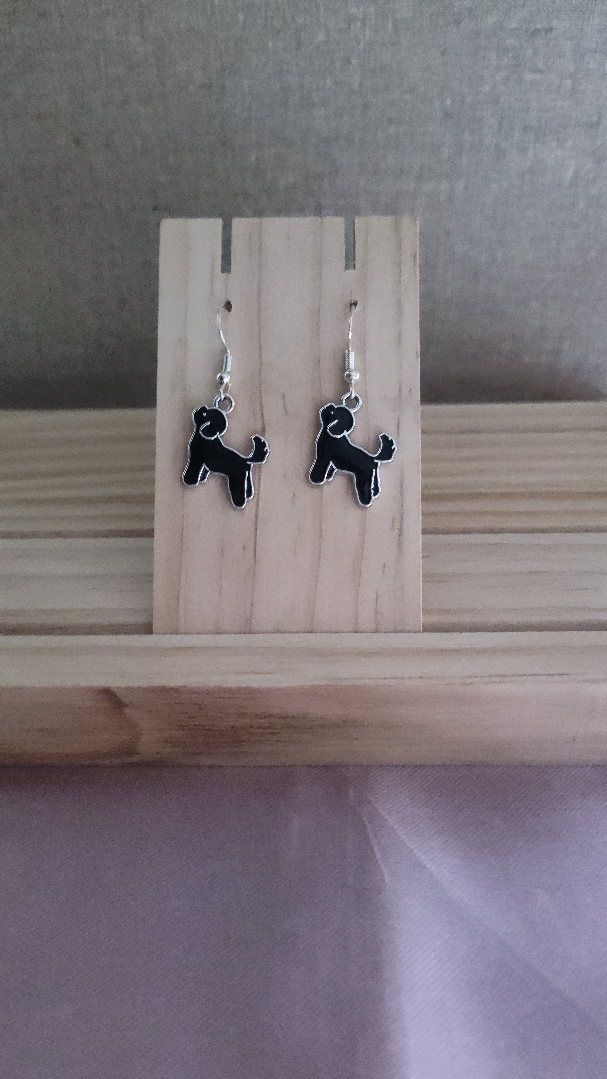 Cute black and silver dog earrings. Made with sterling silver plated hooks and hypoallergenic as well.