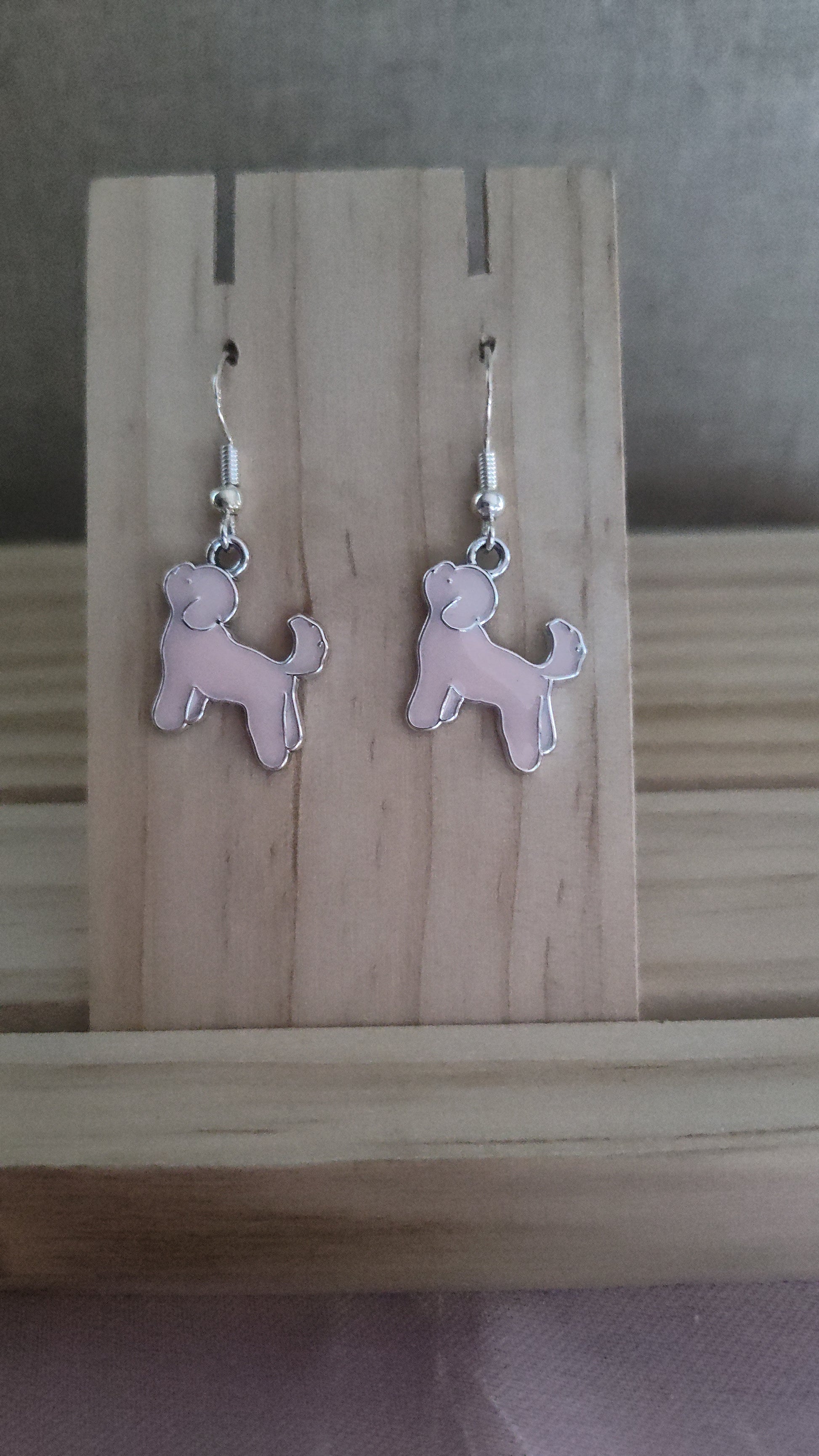 Cute pink and silver dog earrings. Made with sterling silver plated hooks and hypoallergenic as well.
