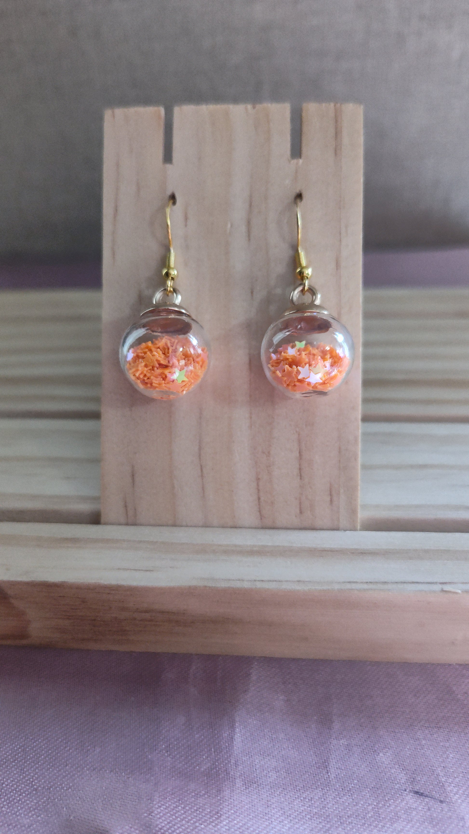Electric glass ball earrings filled with bright orange stars. Made with 18k gold sterling silver plated hooks and hypoallergenic as well.