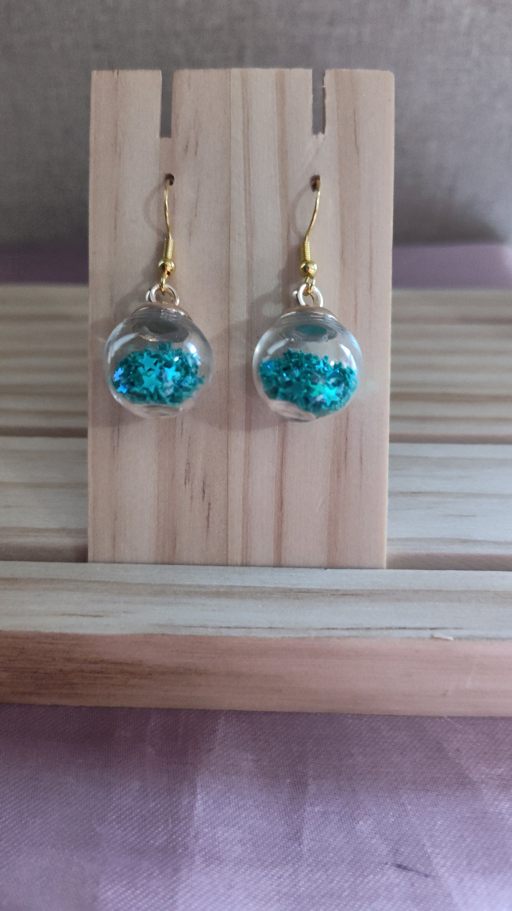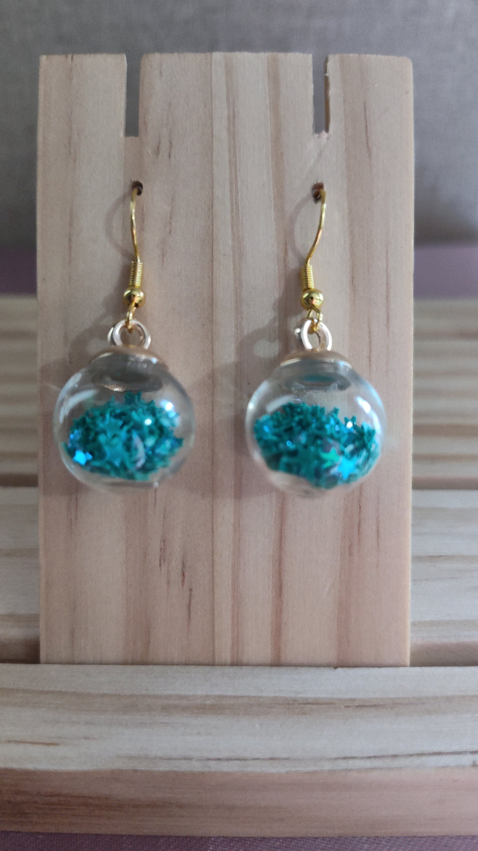 Beautiful glass balls filled with mini dark green stars earrings. Made with 18k gold sterling silver plated hooks and hypoallergenic as well.