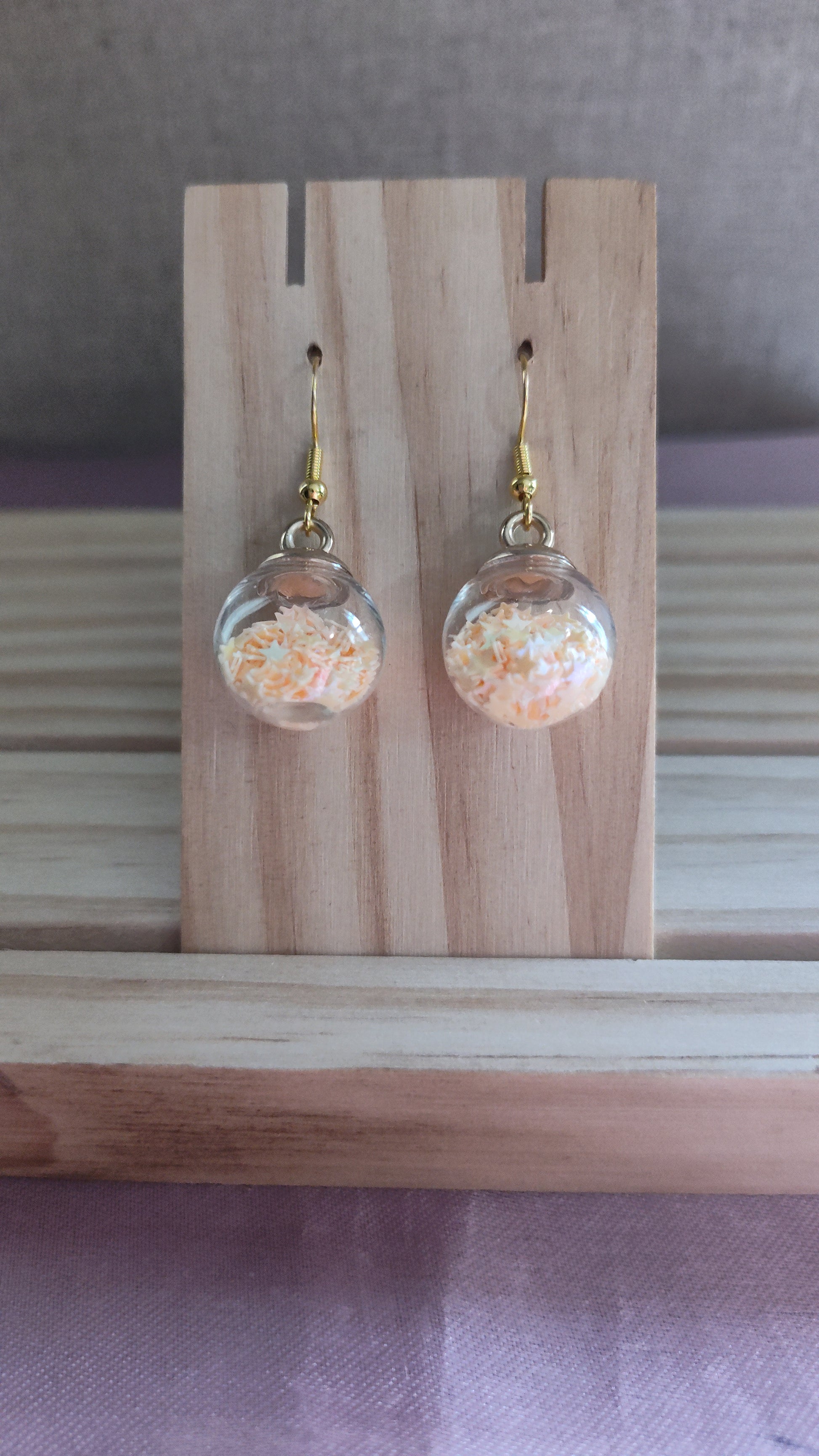 Beautiful glass balls filled with mini peach colored stars. Made with 18k gold sterling silver plated hooks and hypoallergenic as well.