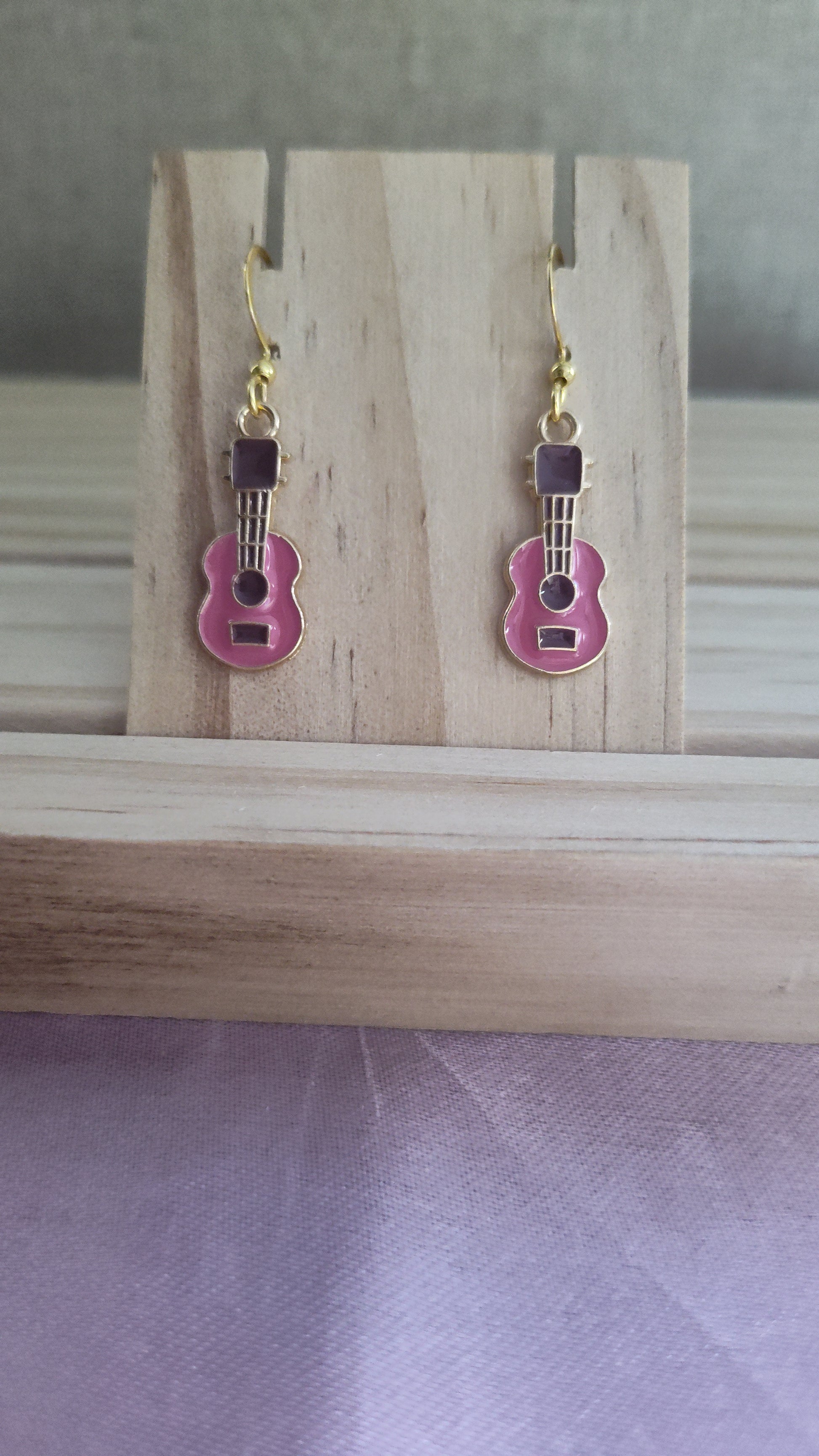 Cute XS pink guitar earrings. Made with 18k gold sterling silver plated hooks and hypoallergenic as well.