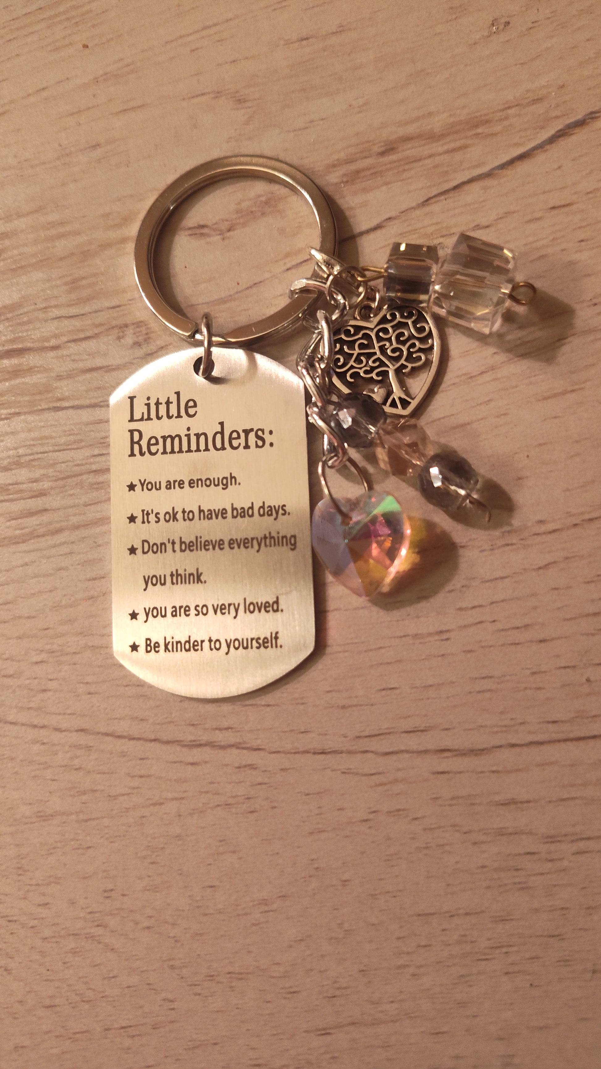 Beautiful handmade inspirational small keychain with charms and beads added to it.