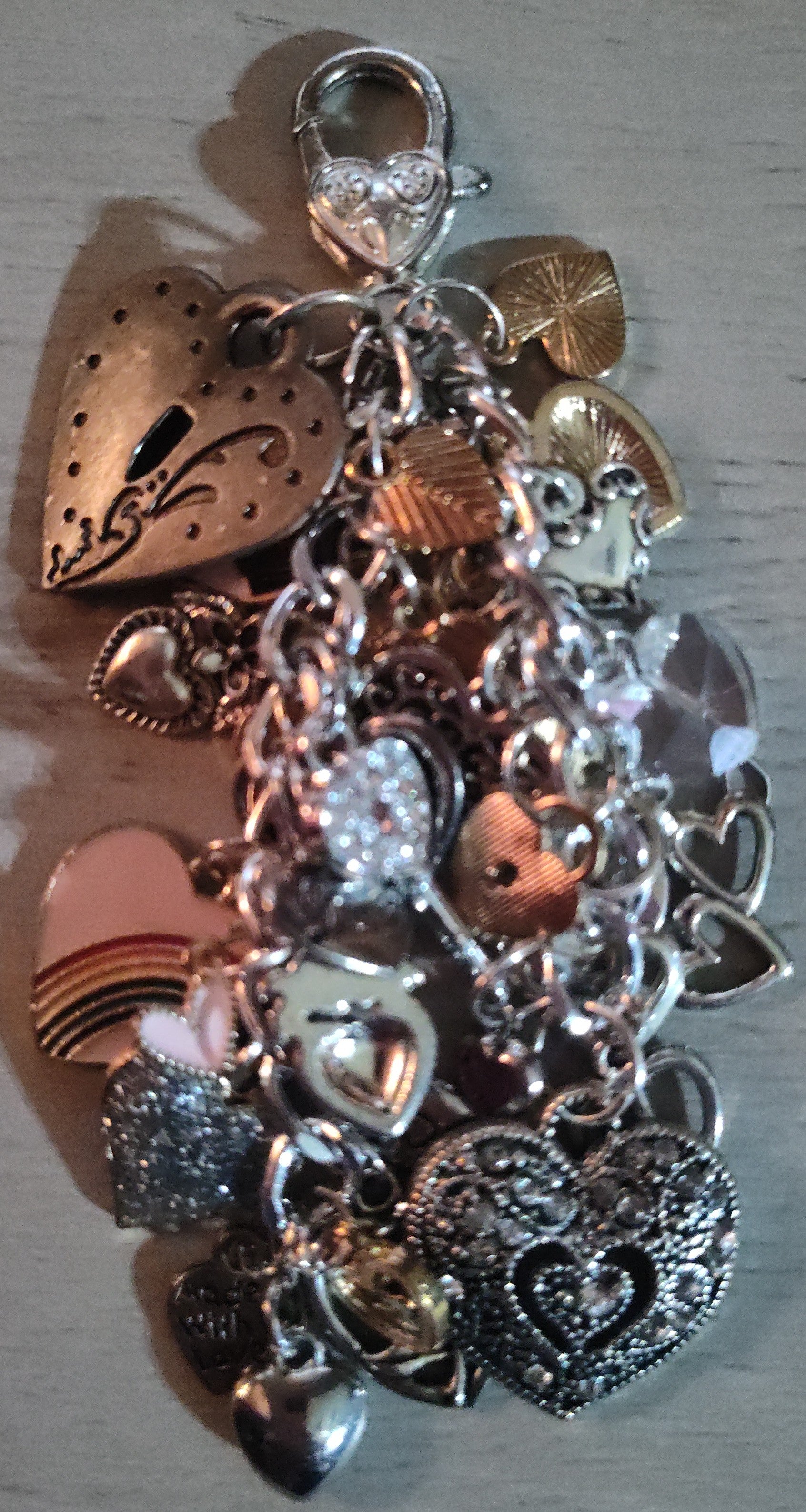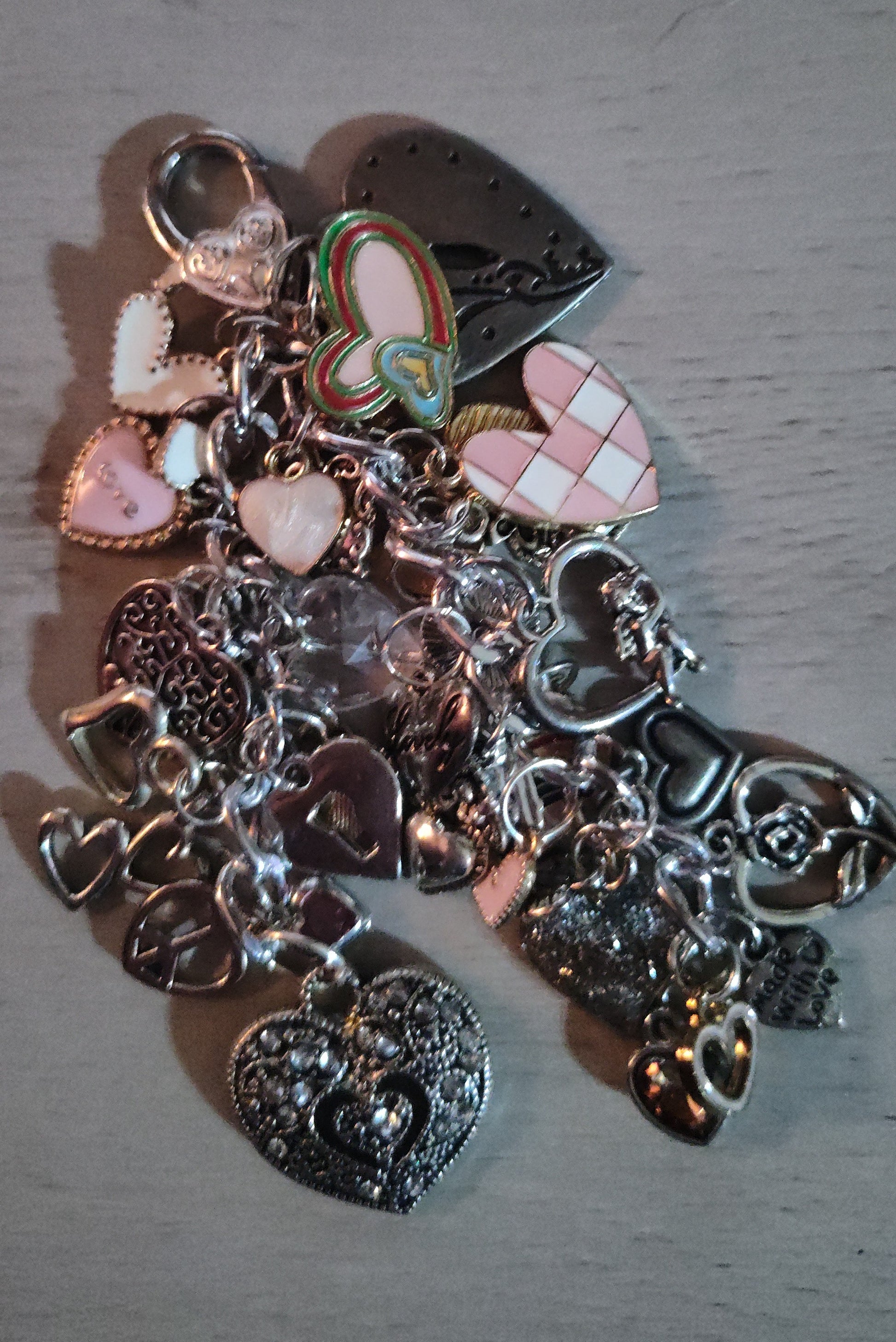 Super cute and fun handmade chunky heart keychain or bag bling with a mix of different heart charms.