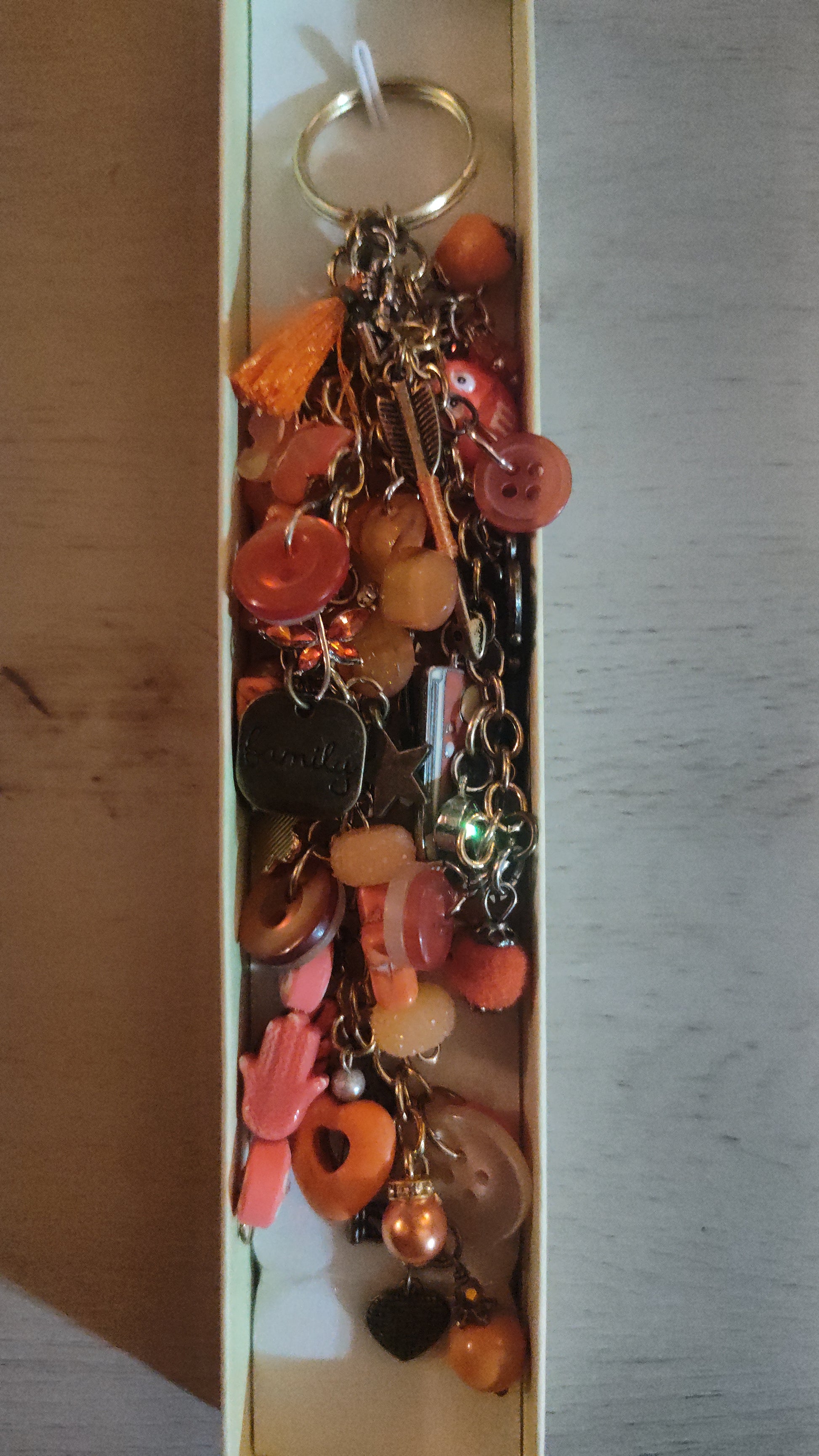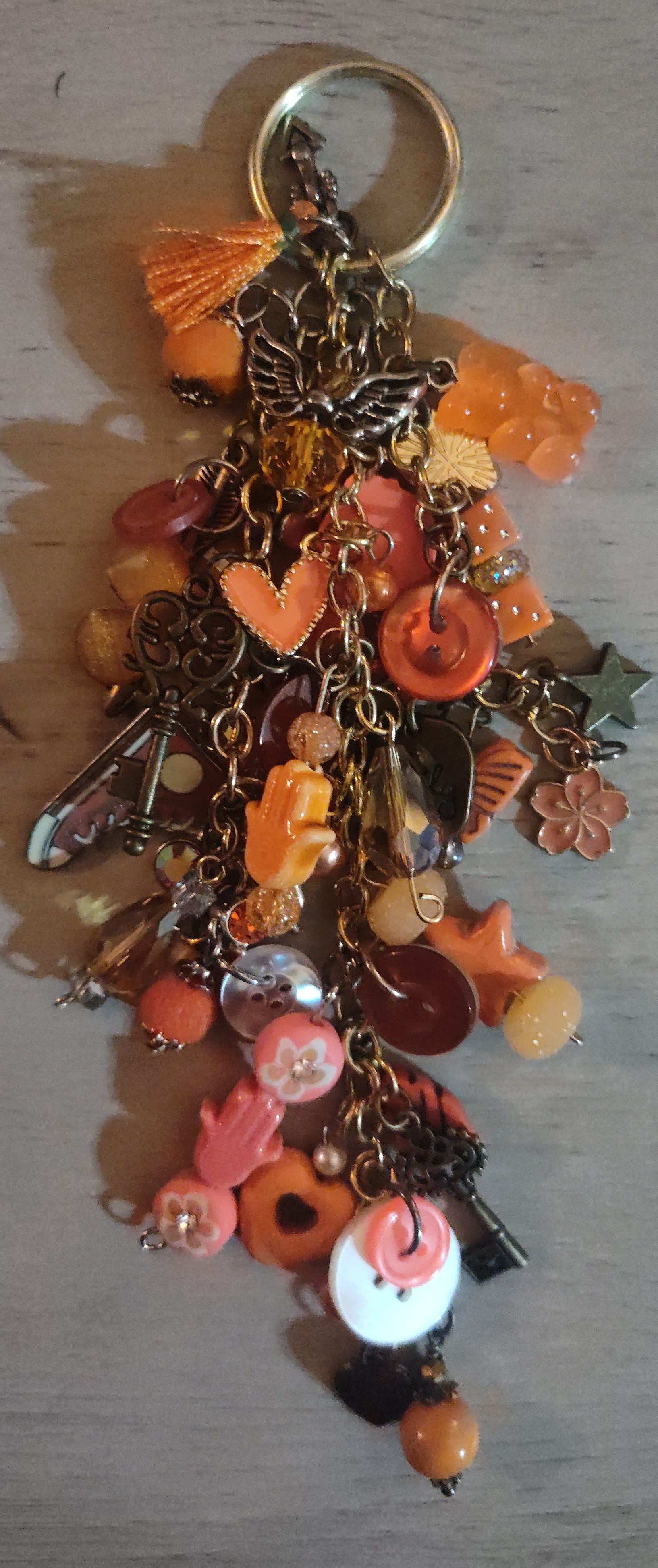 Beautiful and girly fun handmade chunky orange keychain or bag bling with a mix of different girly and fun charms and beads.