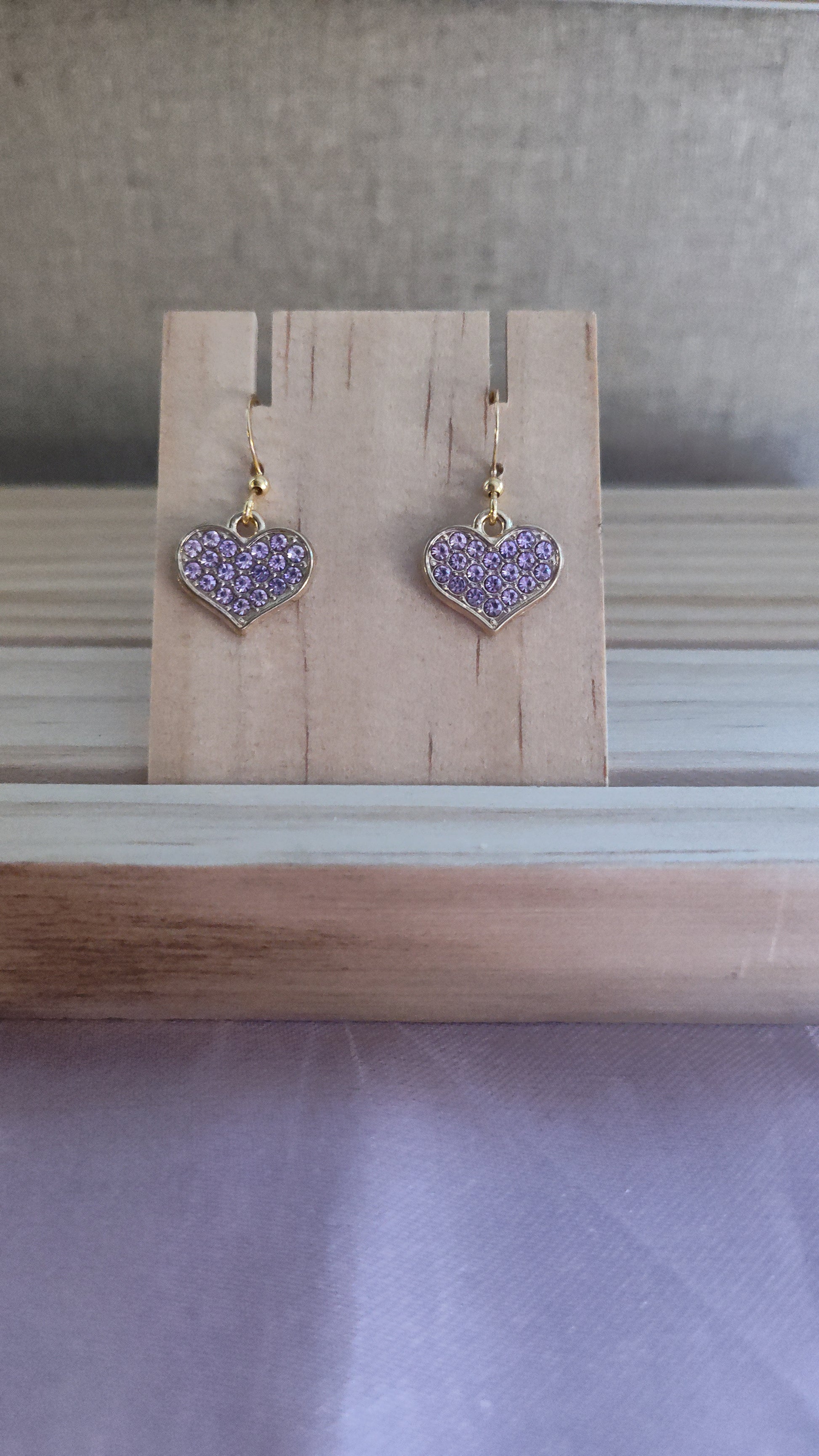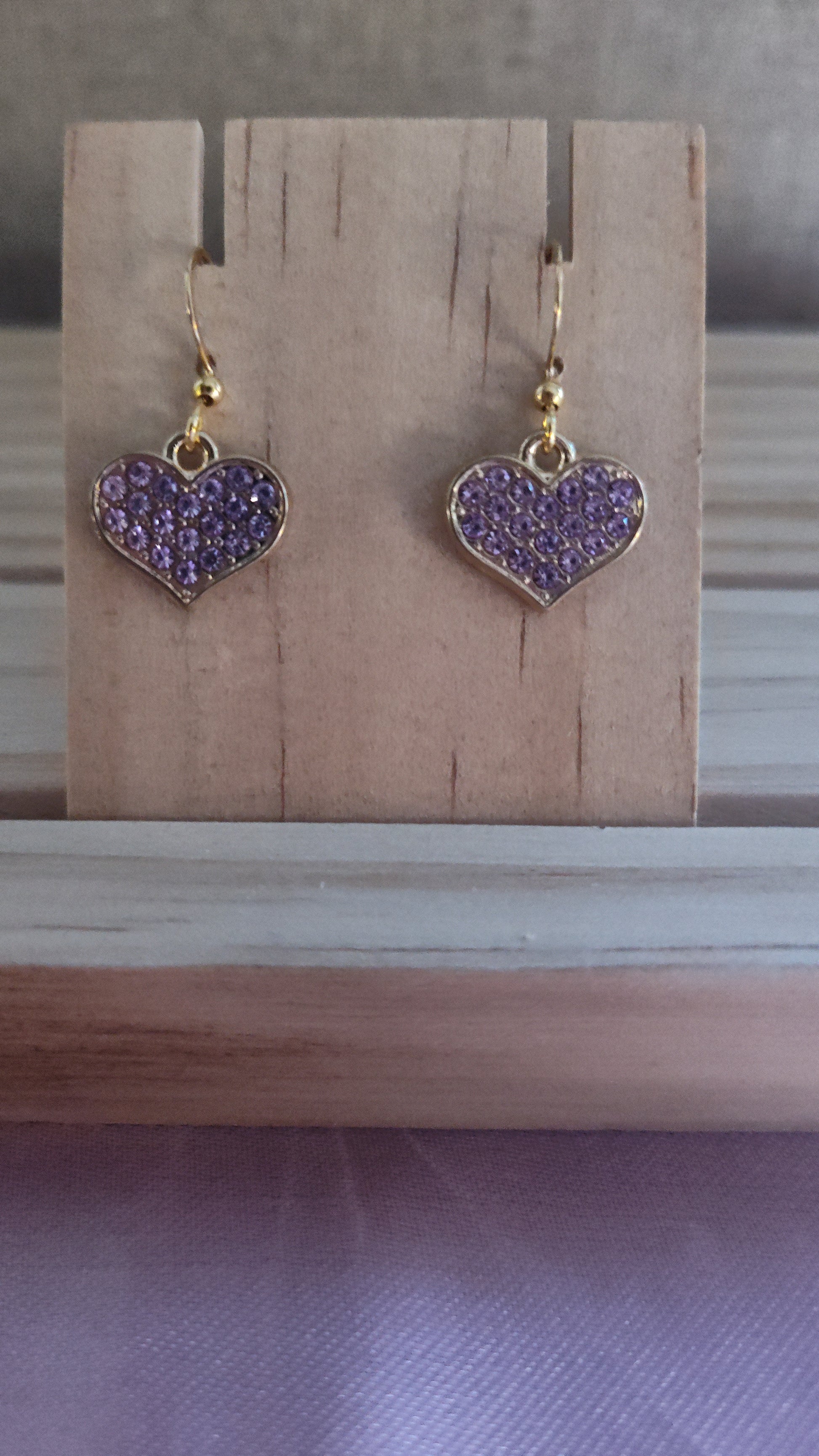 Beautiful gold and purple rhinestone heart earrings. Made with 18k gold sterling silver plated hooks and hypoallergenic as well.
