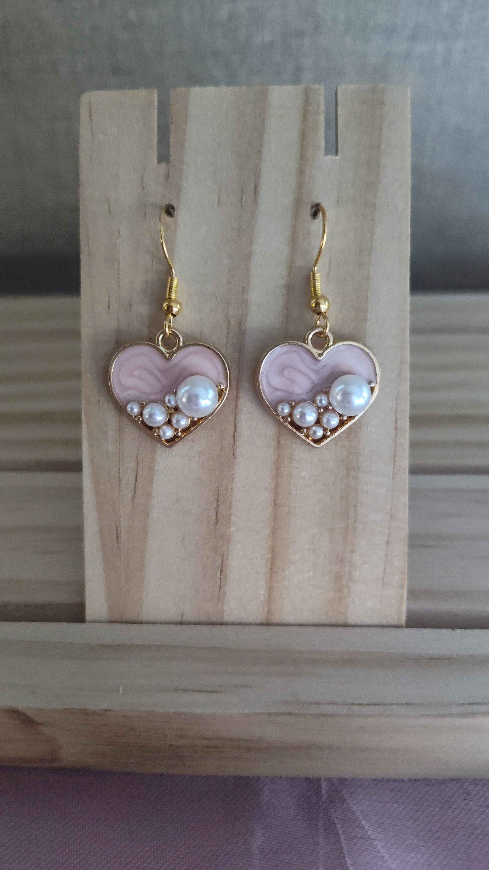 Beautiful and elegant gold and pink heart earrings with pearls. Made with 18k gold sterling silver plated hooks and hypoallergenic as well.