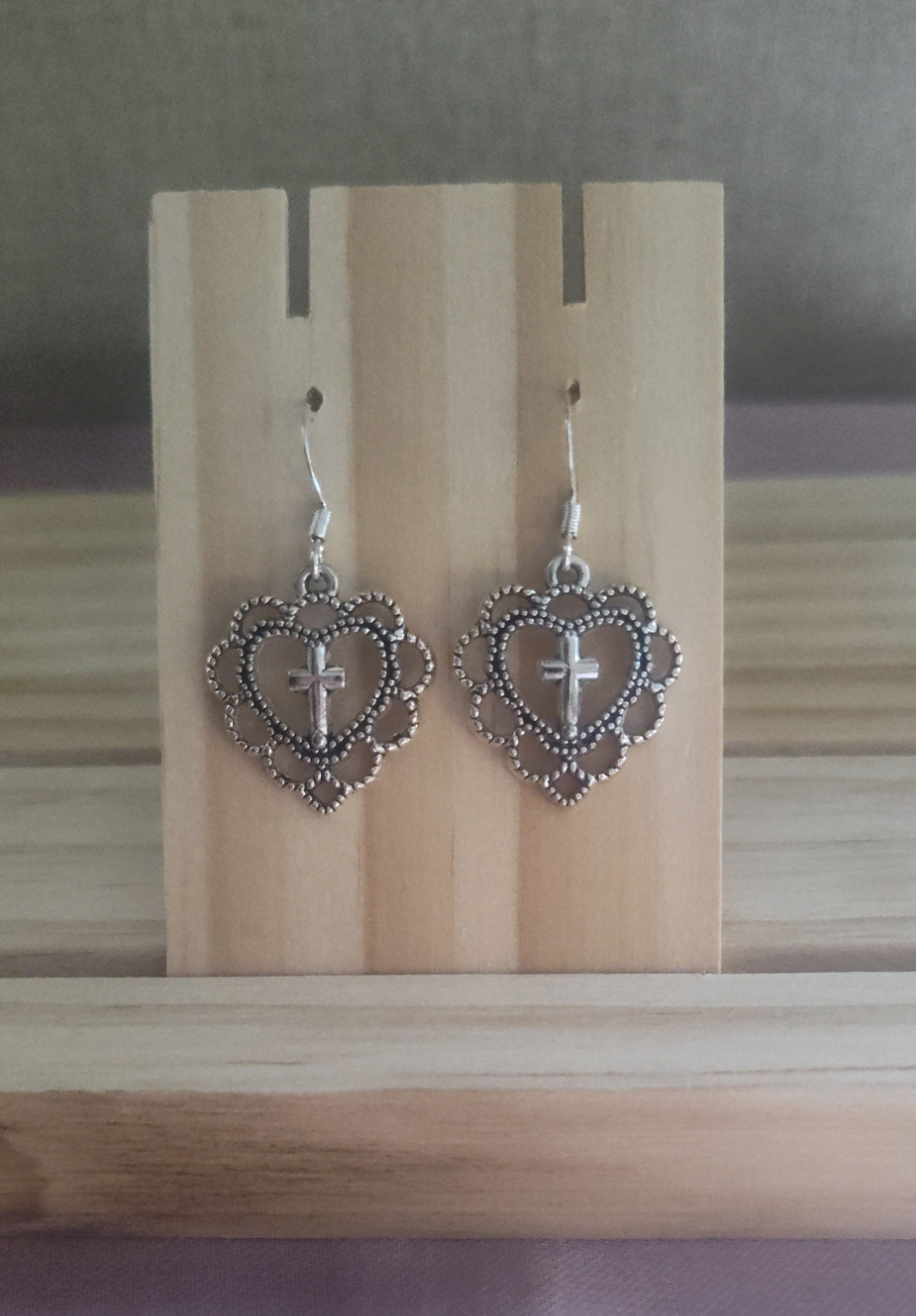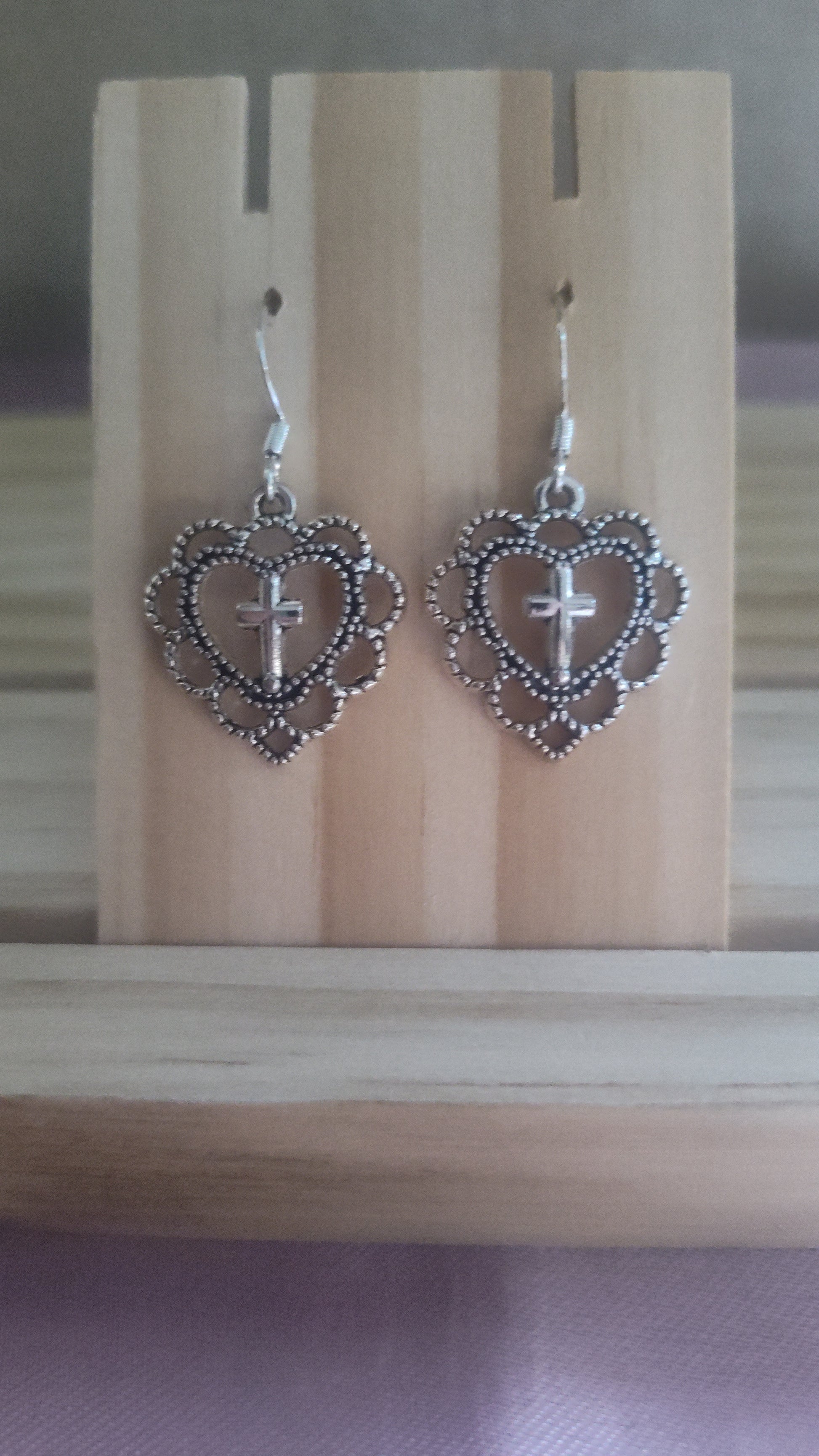 Beautiful heart earrings with cross, made with sterling silver plated hooks and hypoallergenic as well.