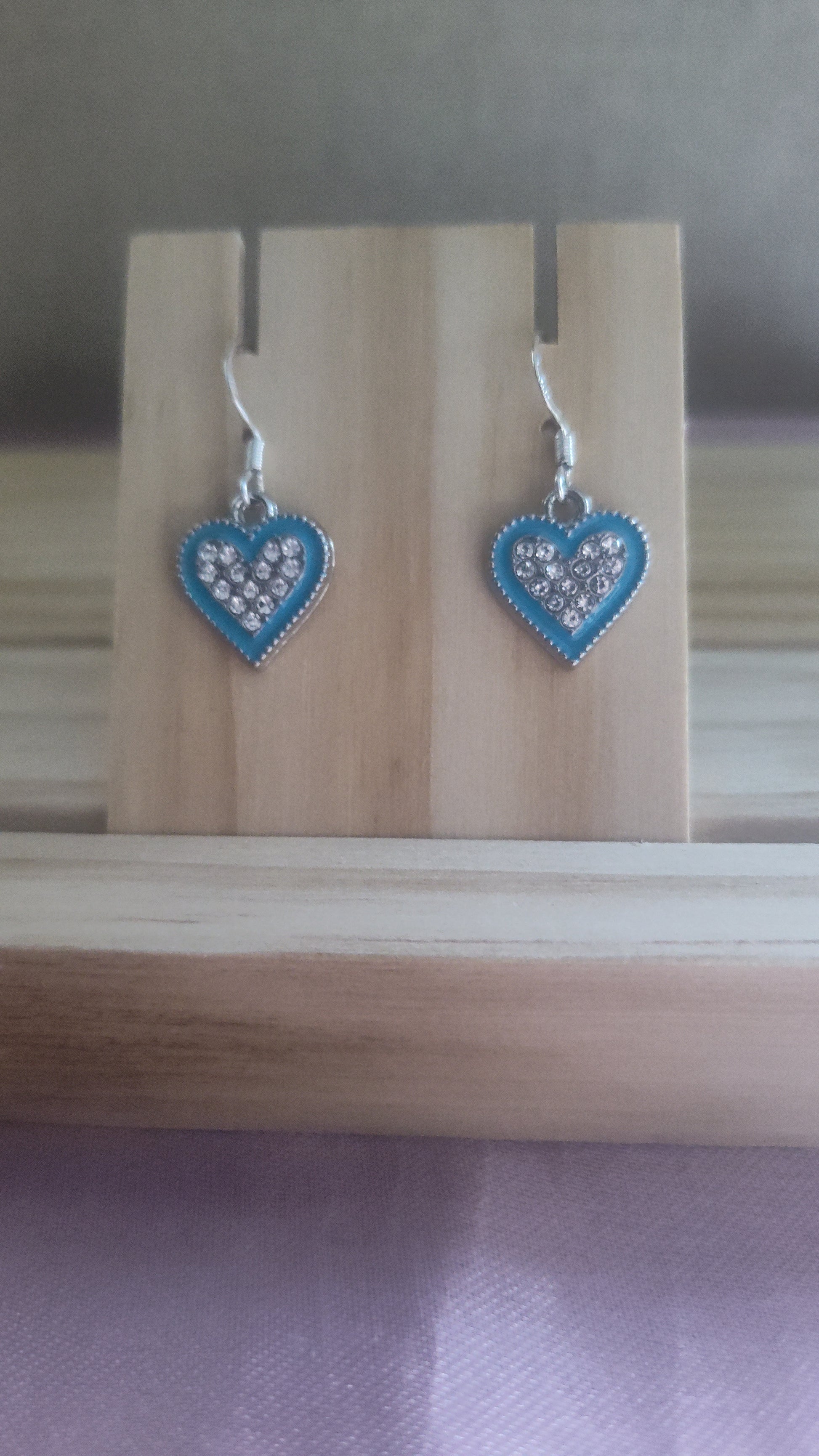 Beautiful blue heart earrings with rhinestones. Made with sterling silver plated hooks and hypoallergenic as well.