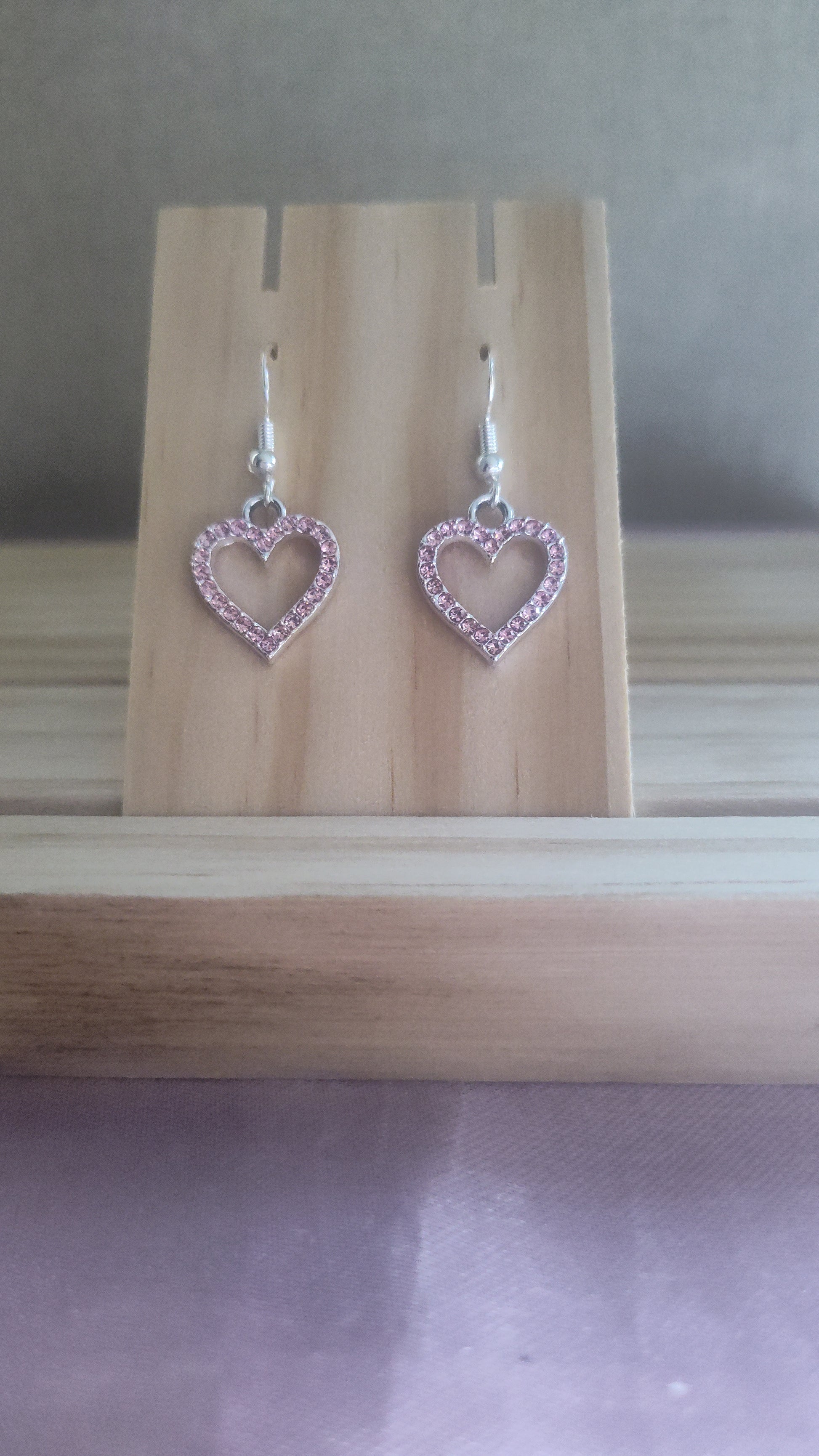 Beautiful heart earrings with pink rhinestones. Made with sterling silver plated hooks and hypoallergenic as well.