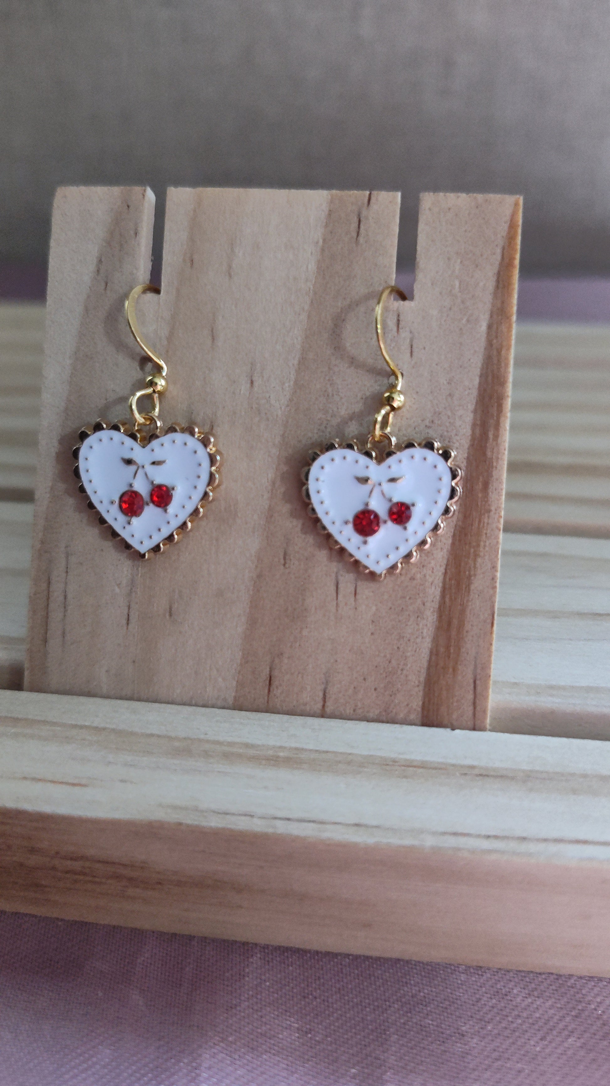 Beautiful gold and white heart earrings with cherries and rhinestone. Made with 18k gold sterling silver plated hooks and hypoallergenic as well.