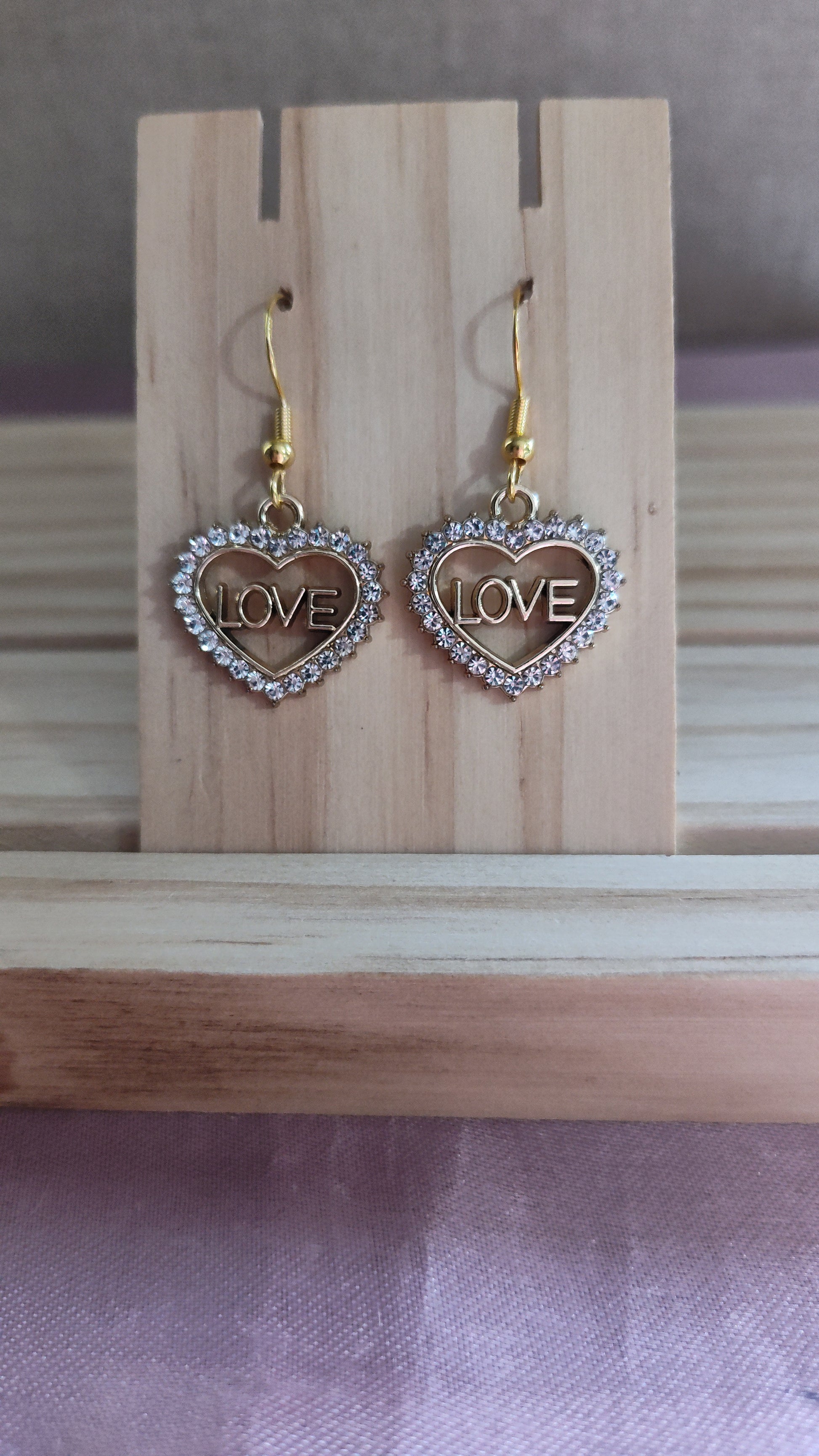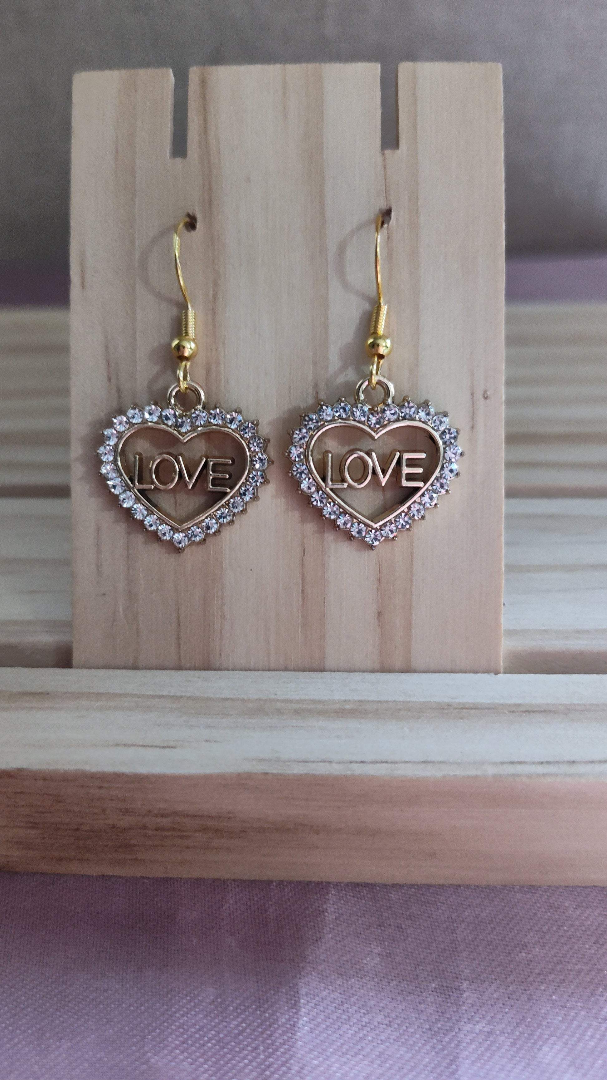 Beautiful gold heart earrings with rhinestones and the word LOVE. Made with 18k gold sterling silver plated hooks and hypoallergenic as well.