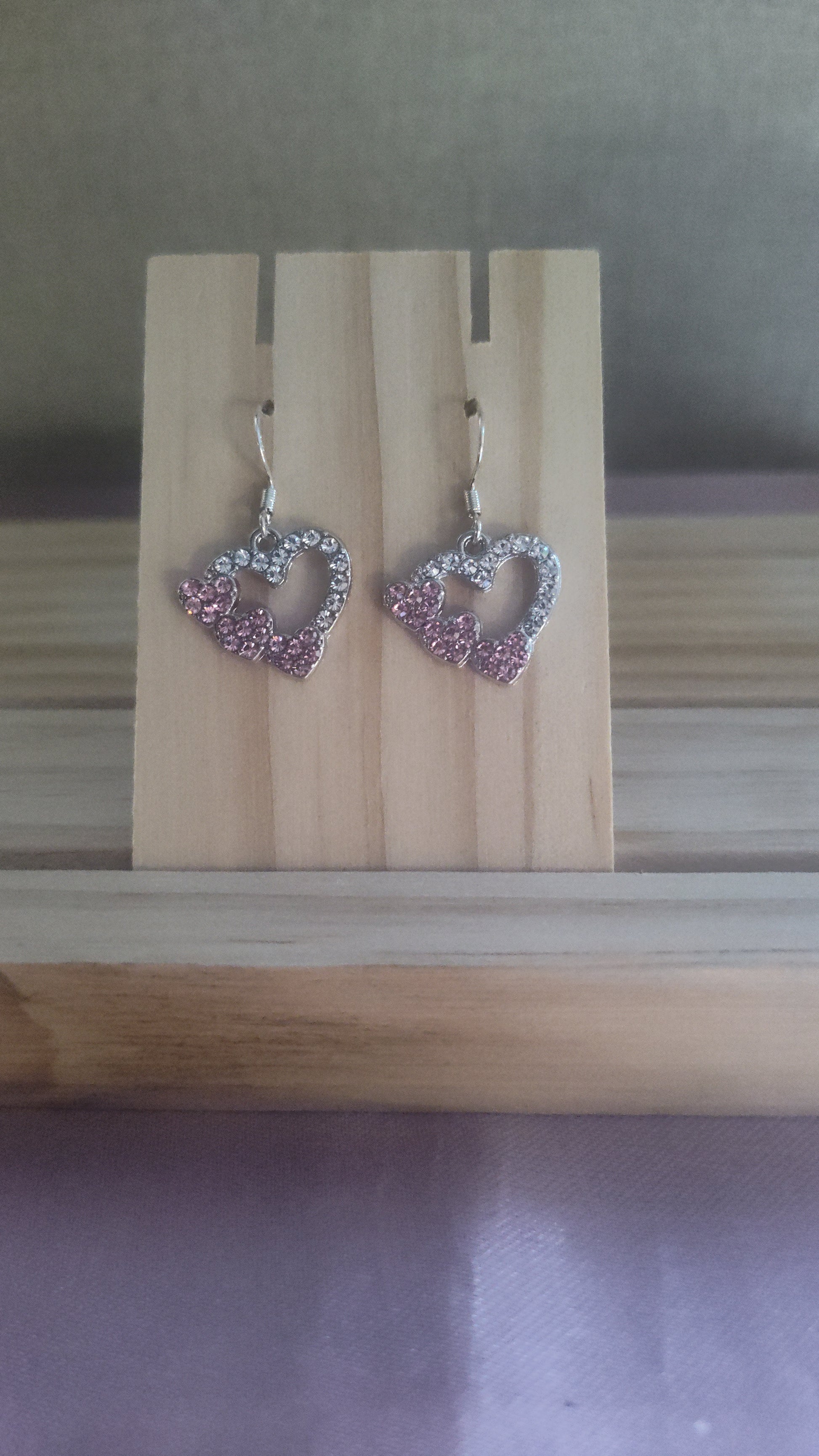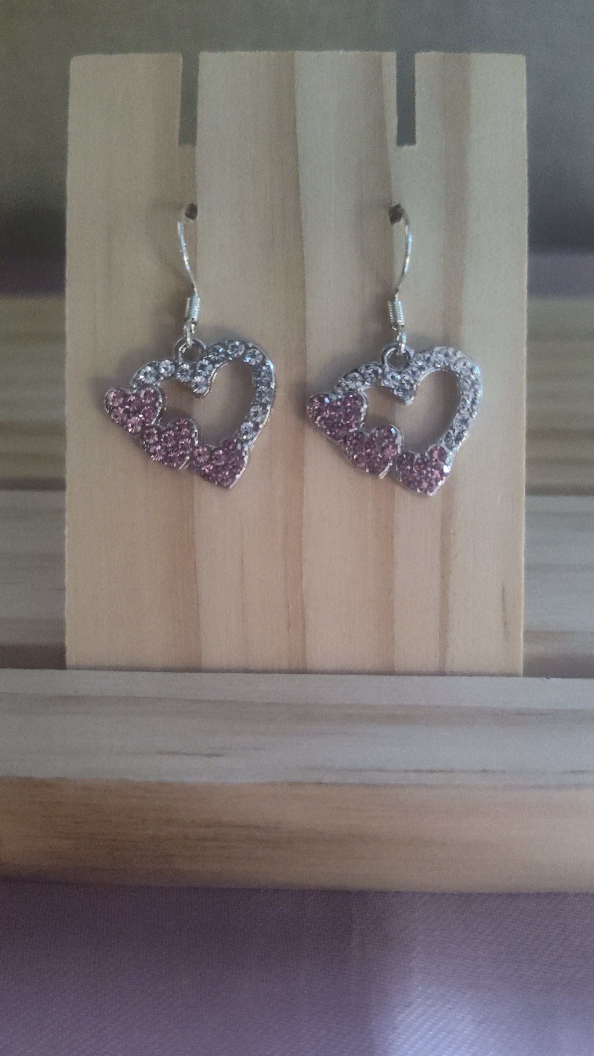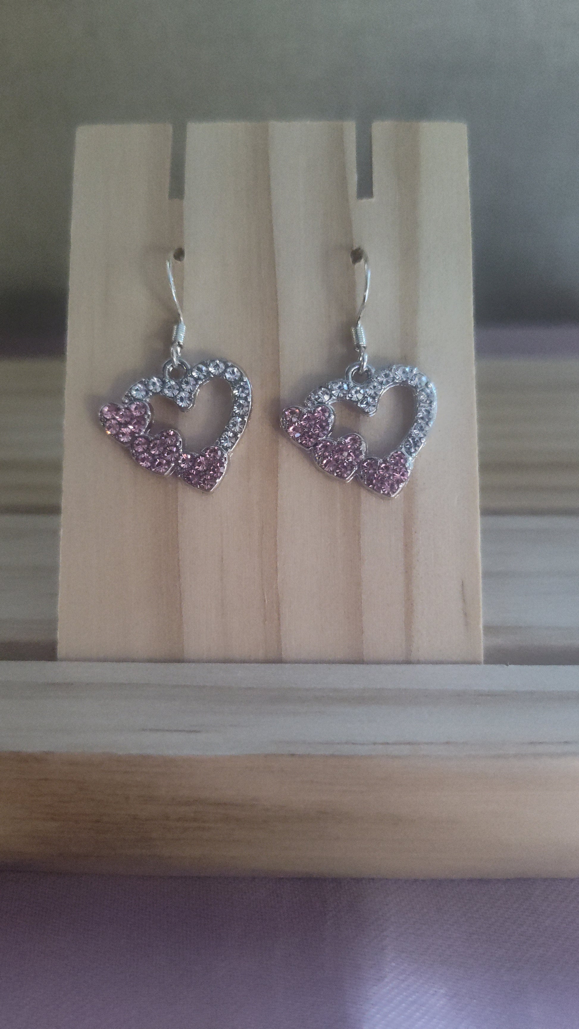 Beautiful and elegant silver and pink heart earrings with rhinestones. Made with sterling silver plated hooks and hypoallergenic as well.