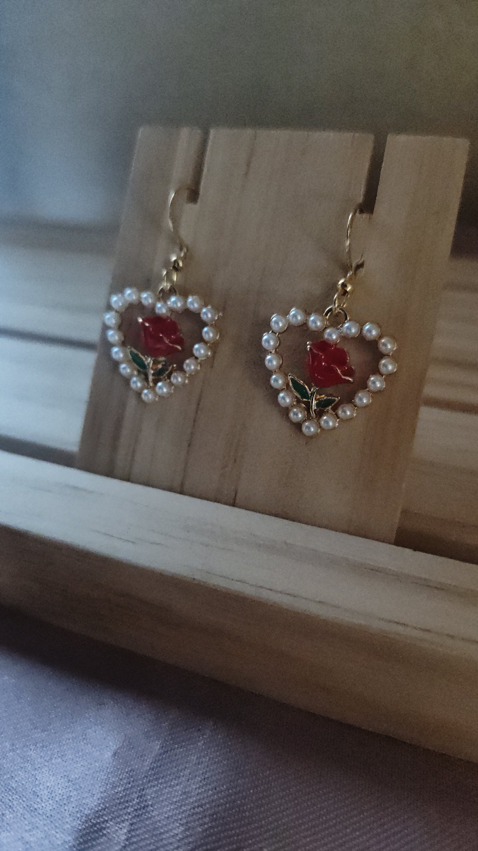 Beautiful gold heart with red rose and mini pearls earrings. Made with 18k gold plated hooks and hypoallergenic as well.