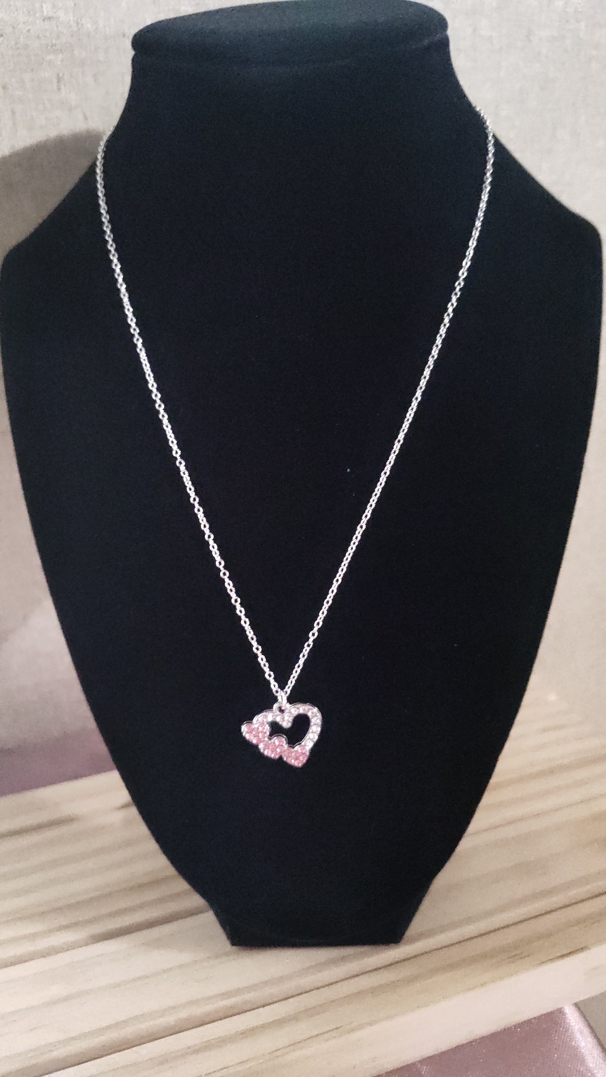 Beautiful silver heart necklace with pink rhinestones.