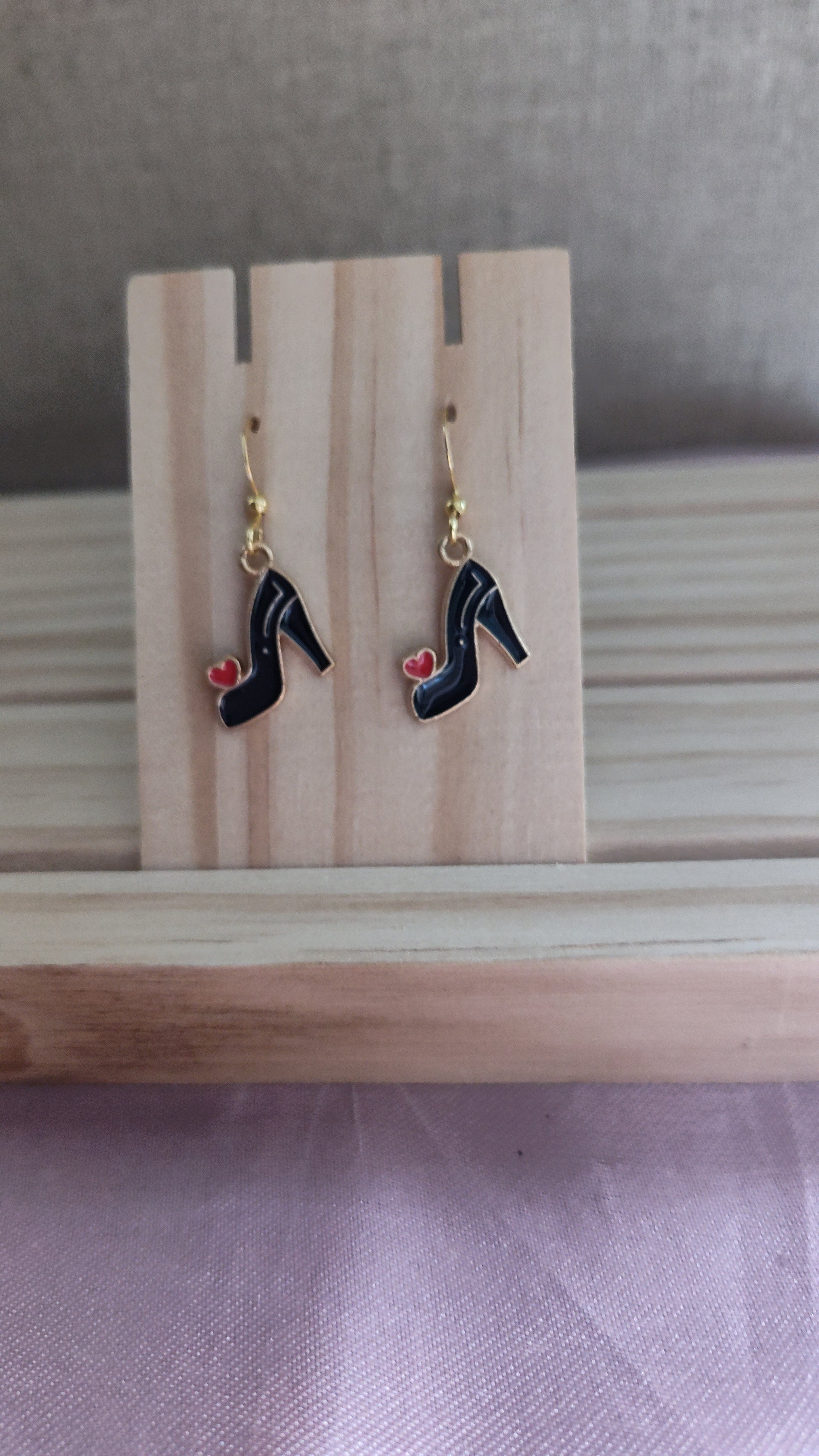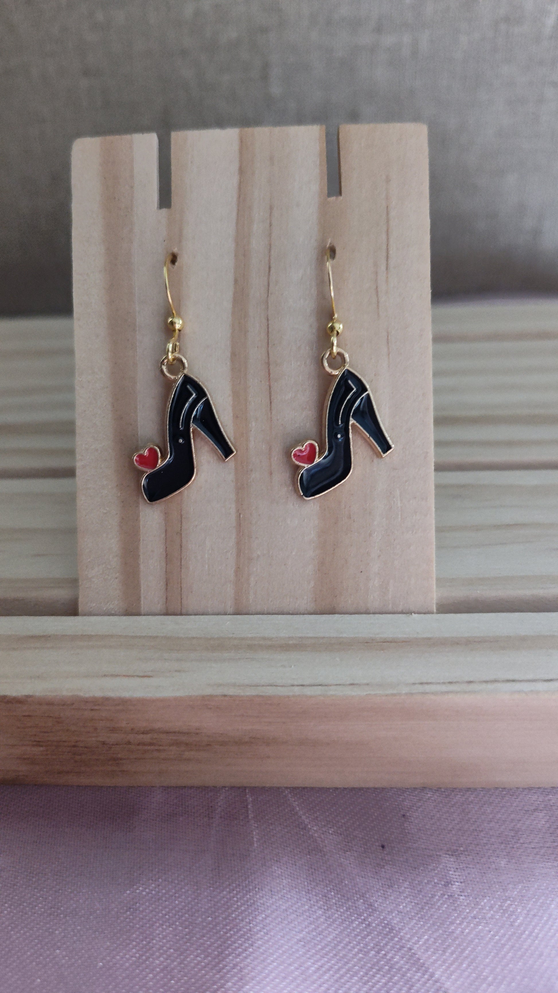 Cute black high heel earrings with red heart. Made with 18k gold sterling silver plated hooks and hypoallergenic as well.