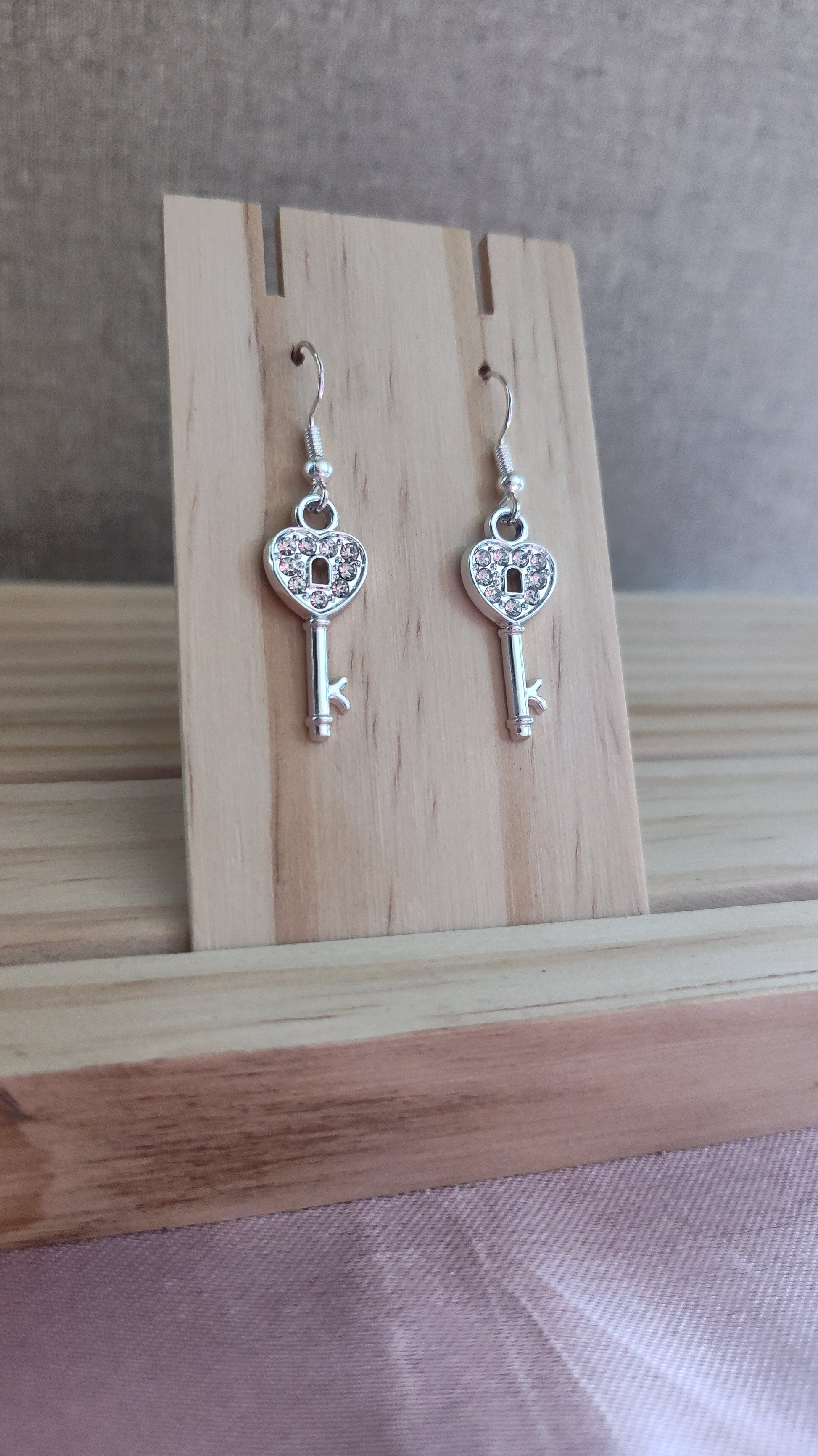 Beautiful silver key earrings with rhinestones. Made with sterling silver plated hooks and hypoallergenic as well.