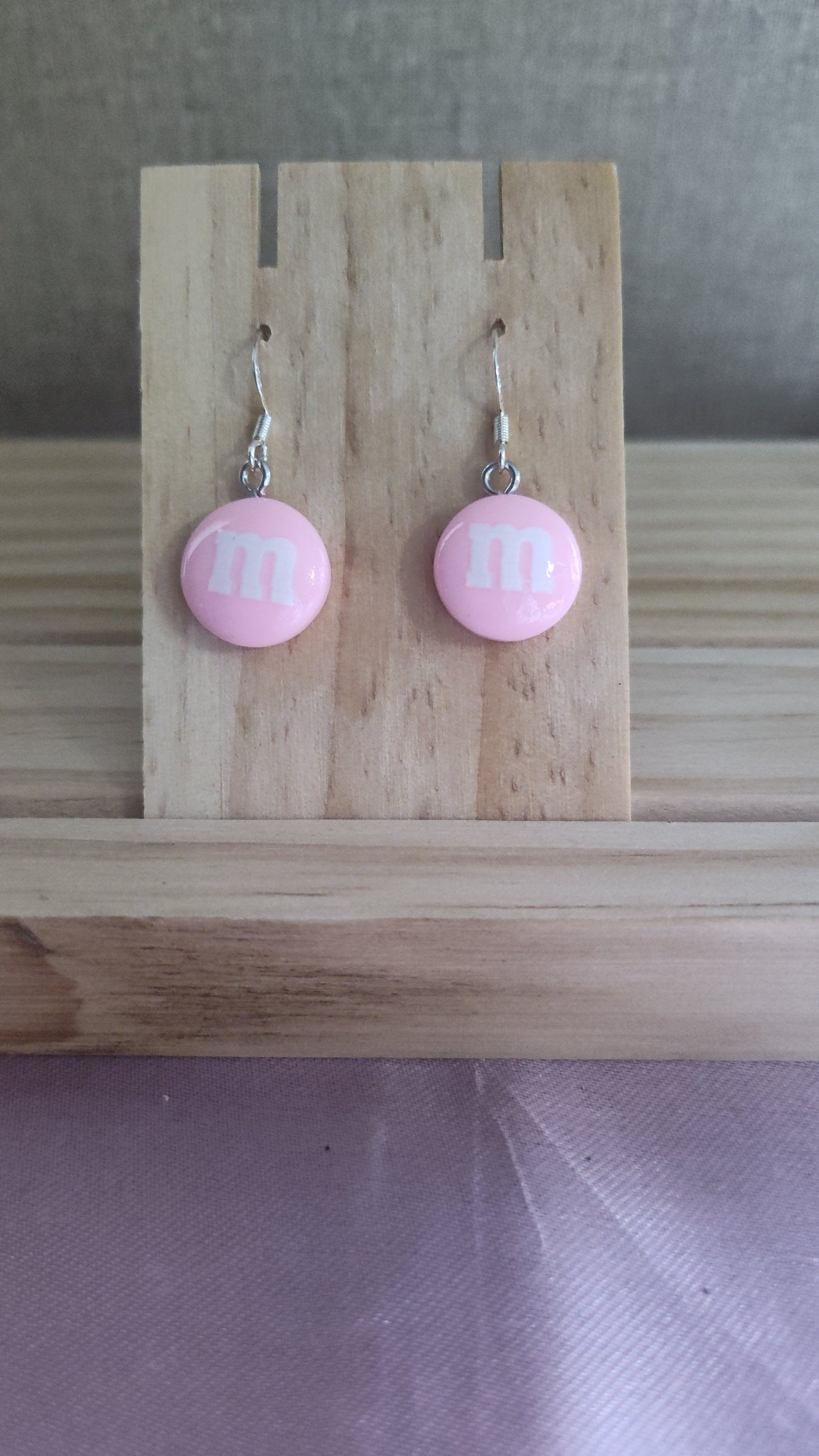 Cute light pink M&M earrings, perfect for candy lovers. Made with sterling silver plated hooks and hypoallergenic as well.