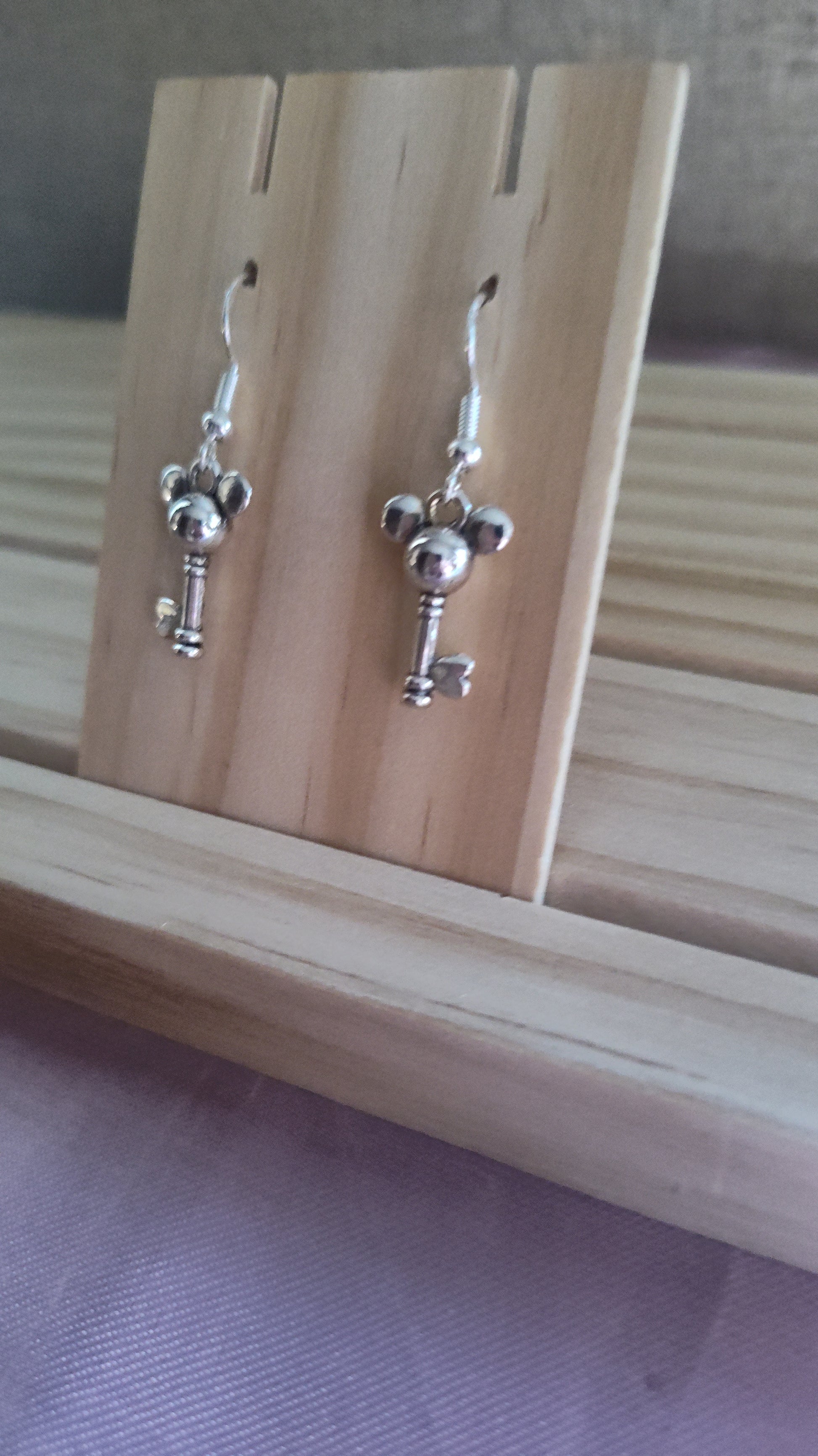 Cute XS silver Mickey Mouse Key Earrings. Made with sterling silver plated hooks and hypoallergenic as well.