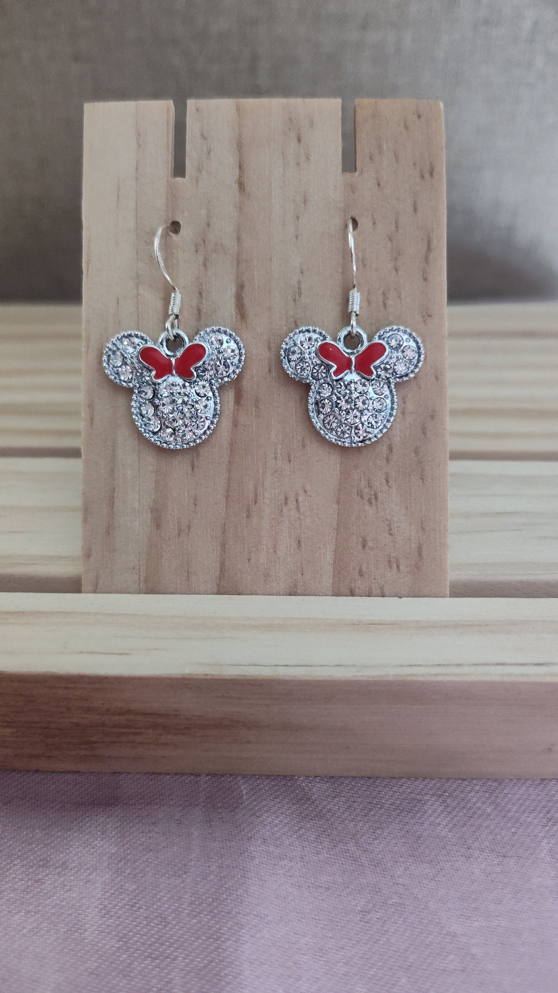 Beautiful silver Minnie Mouse earrings with rhinestones and a red bow. Made with sterling silver plated hooks and hypoallergenic as well.