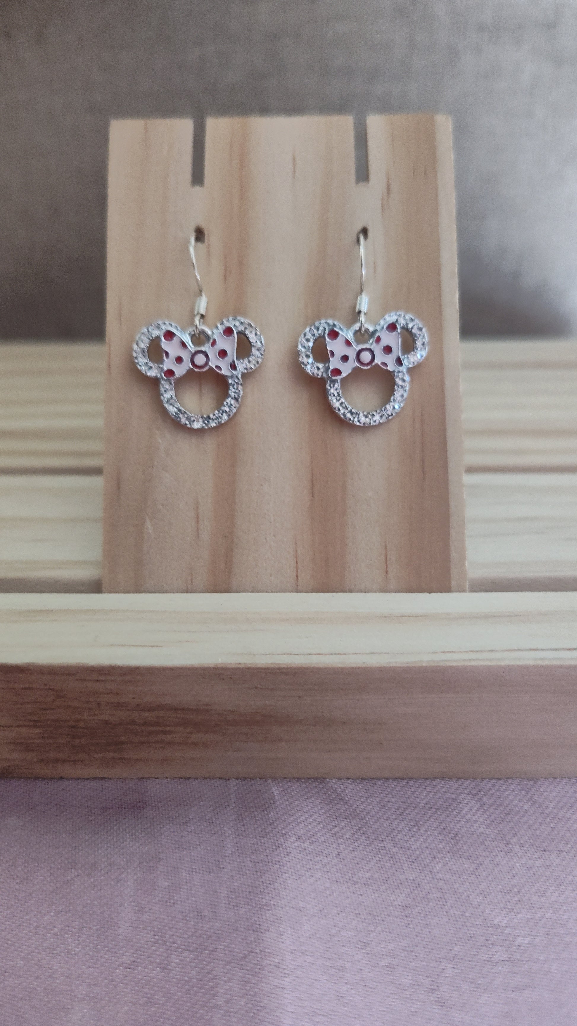 Beautiful silver Minnie Mouse Earrings with rhinestones and red & pink bow. Made with sterling silver plated hooks and hypoallergenic as well.