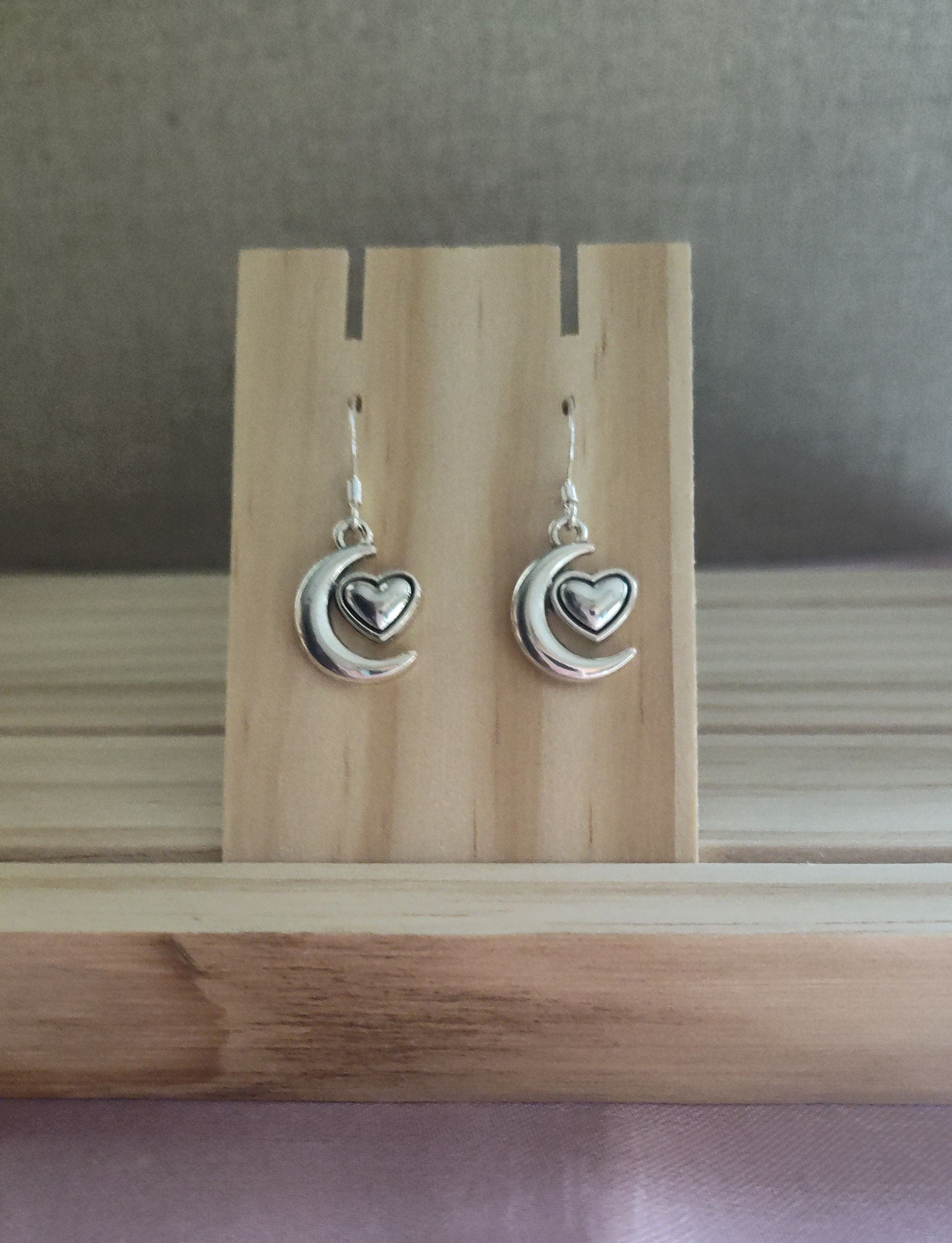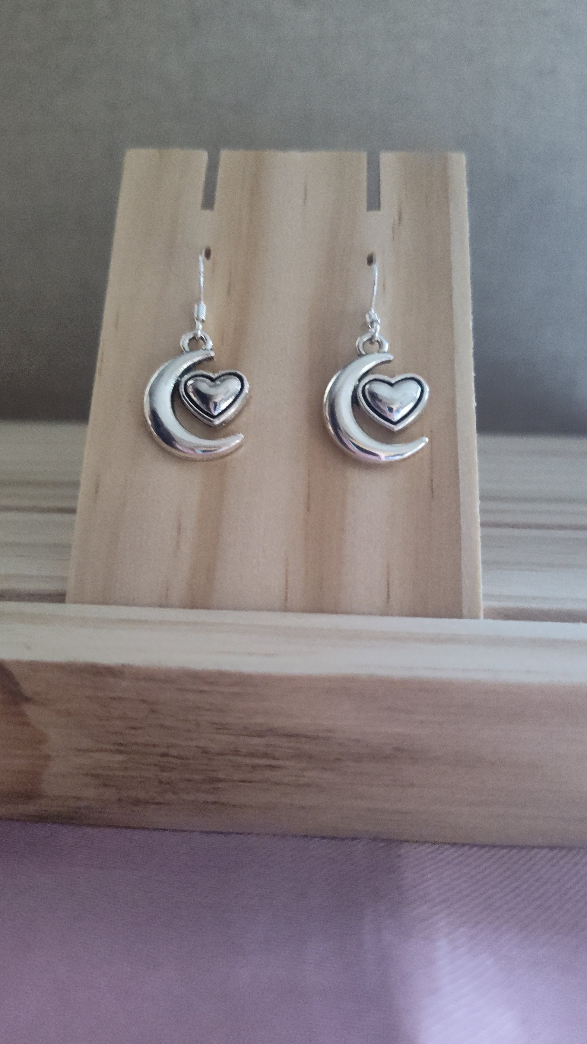 Silver moon earrings with heart, made with sterling silver plated hooks and hypoallergenic as well.