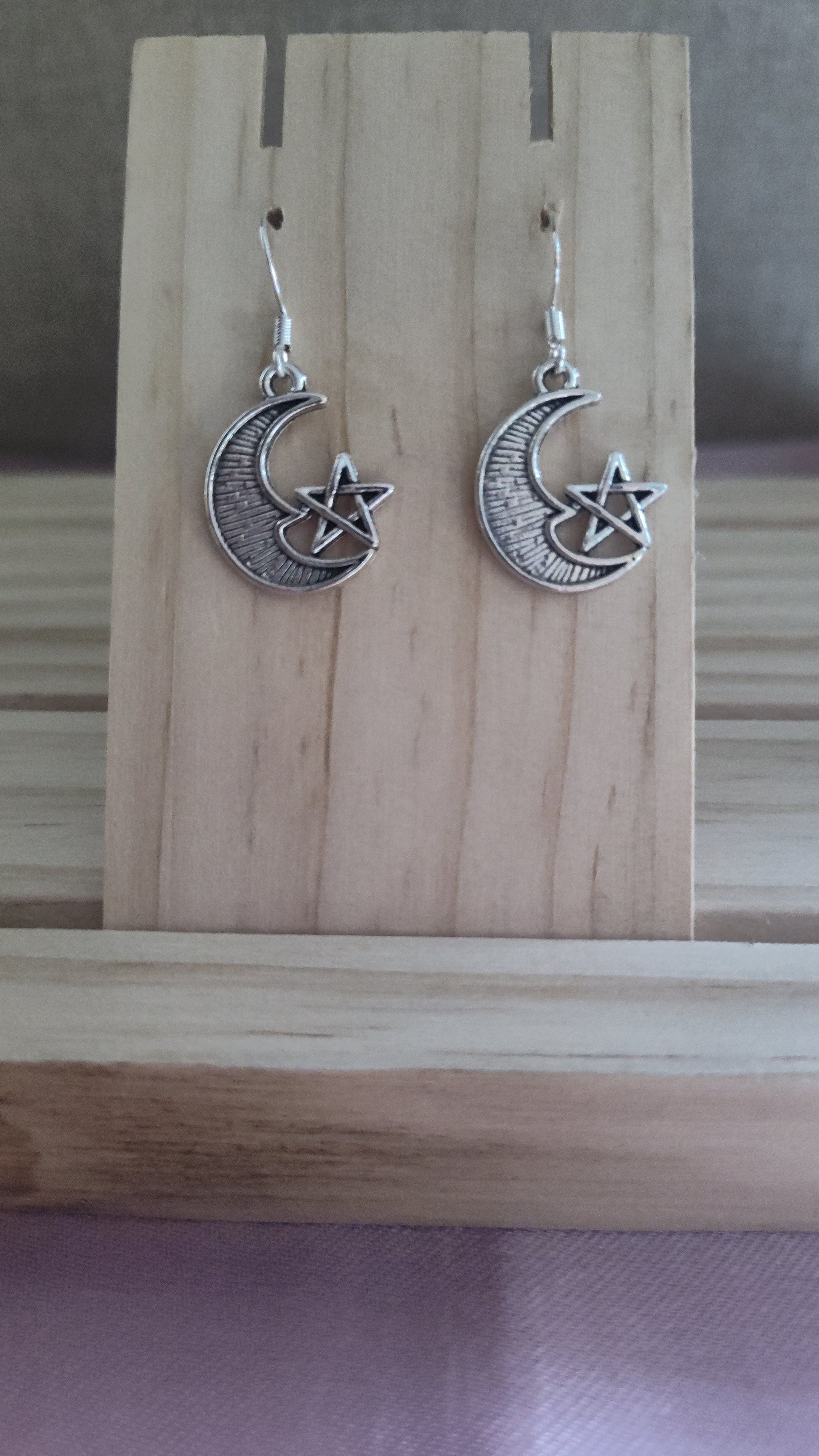 Silver moon earrings with star, made with sterling silver plated hooks and hypoallergenic as well.