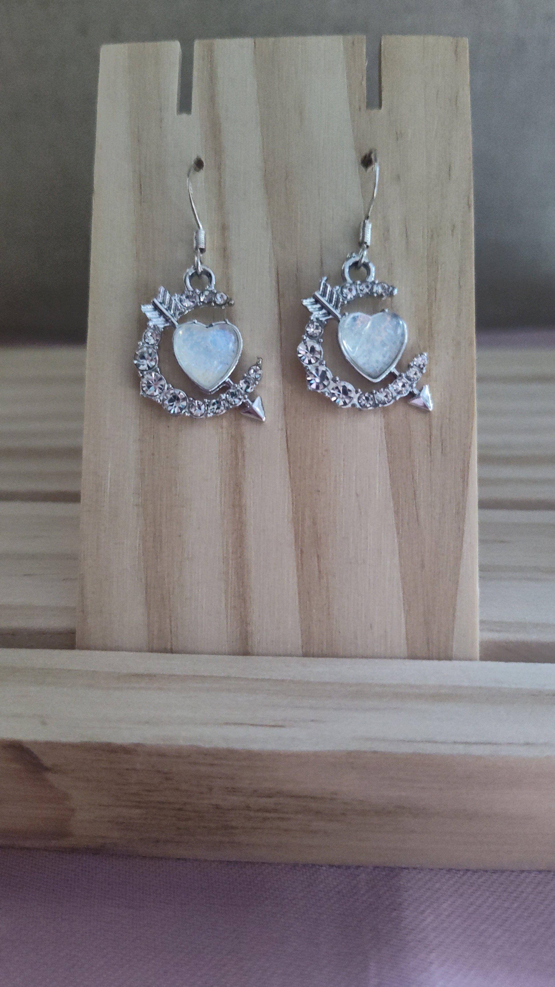 Beautiful silver moon earrings with heart and rhinestones. Made with sterling silver plated hooks and hypoallergenic as well.