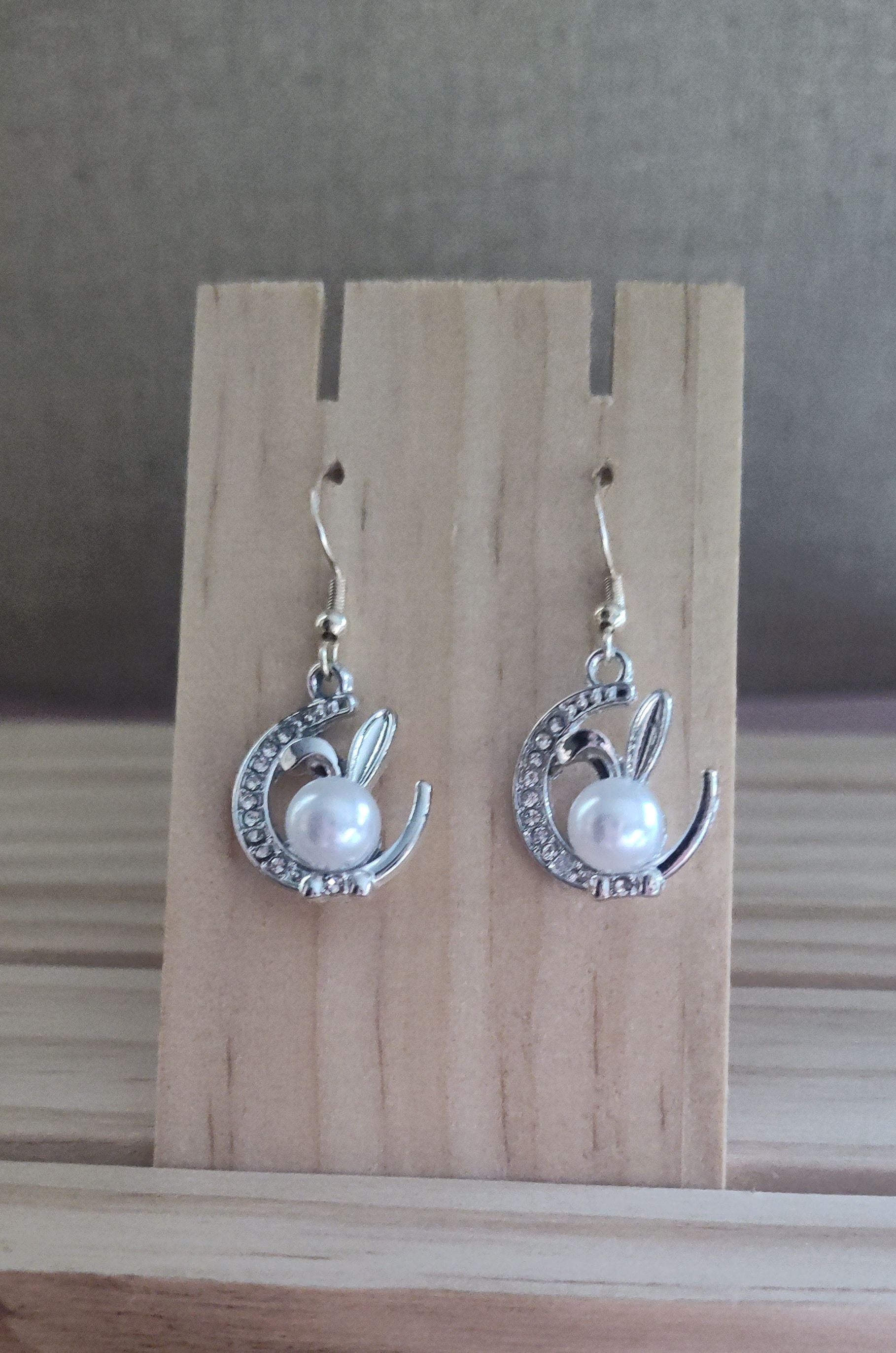 Beautiful silver moon earrings with bunny ears and pearls. Made with sterling silver plated hooks and hypoallergenic as well.