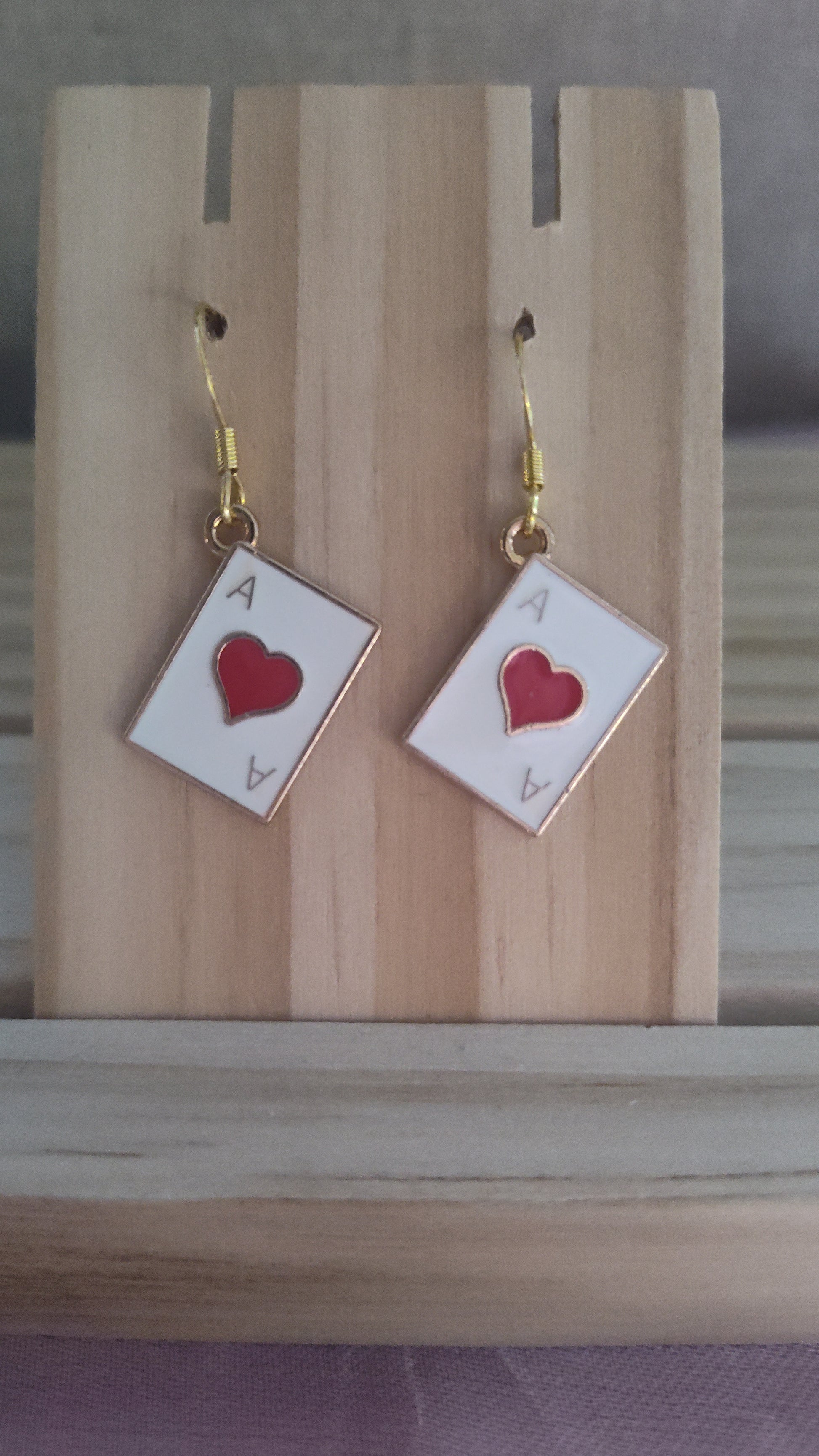 Large gold, red, & white poker card earrings. Made with 18k gold sterling silver plated hooks and hypoallergenic as well.