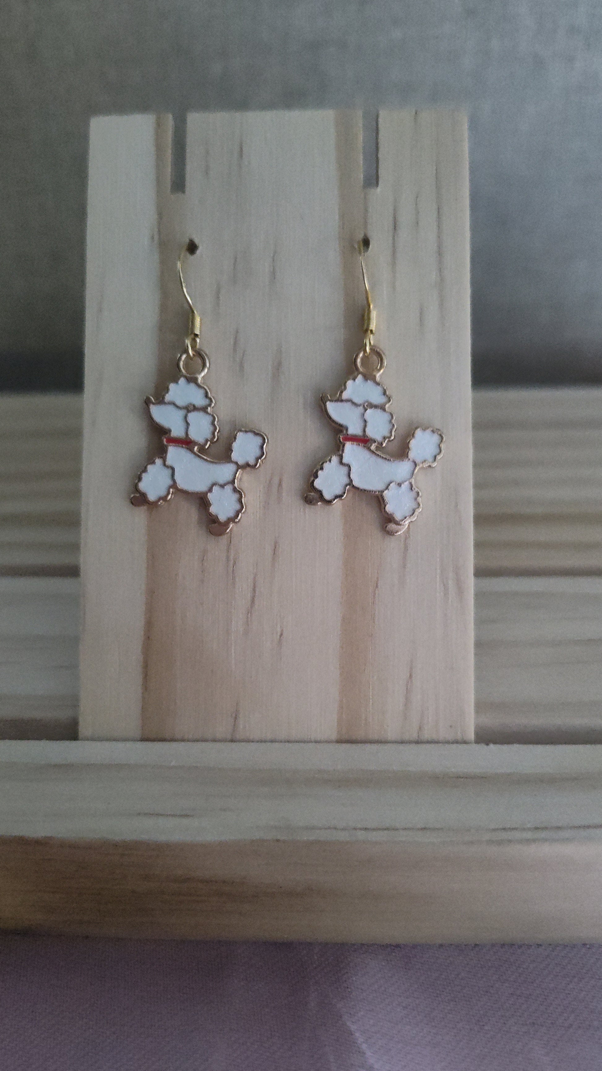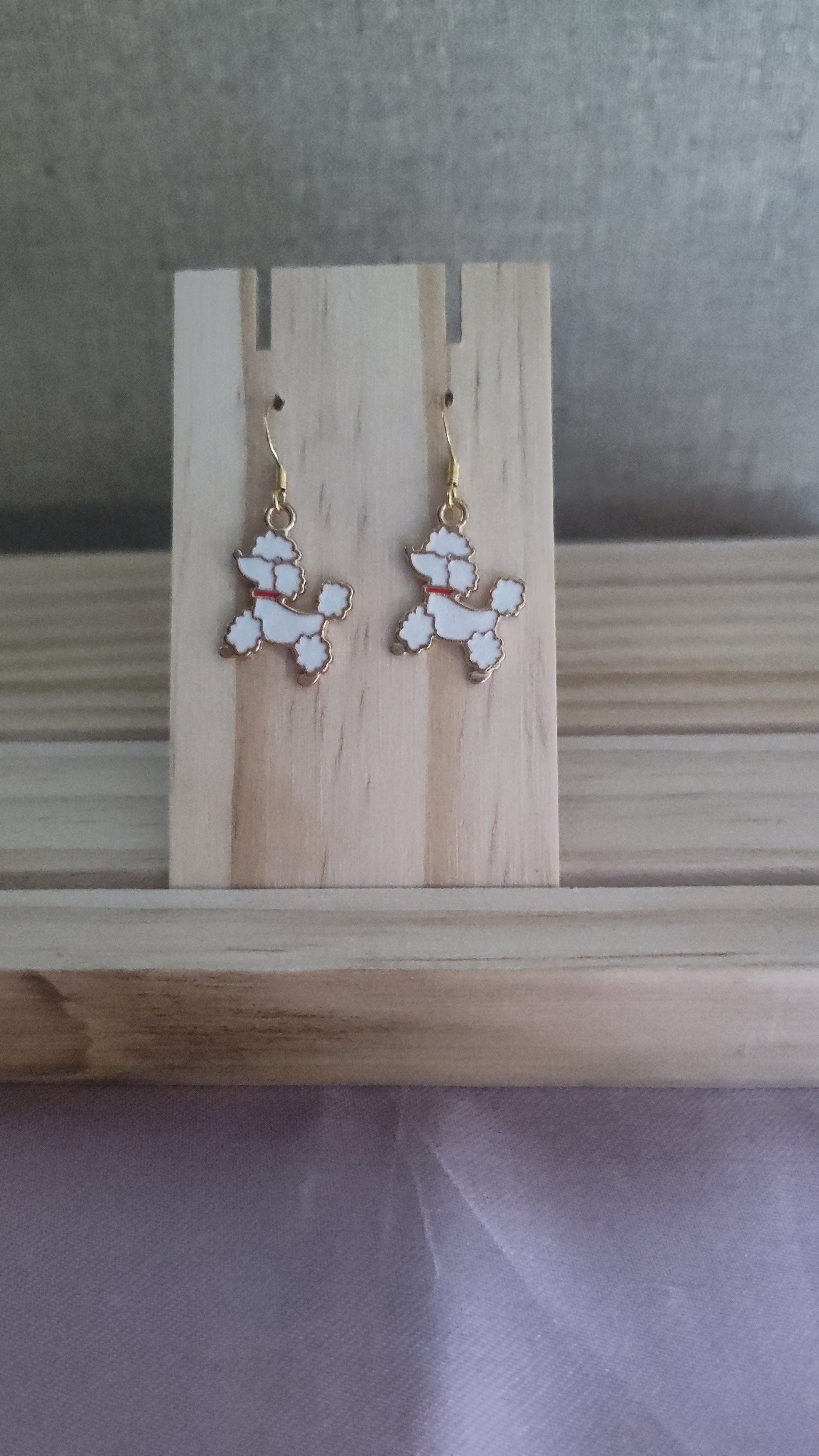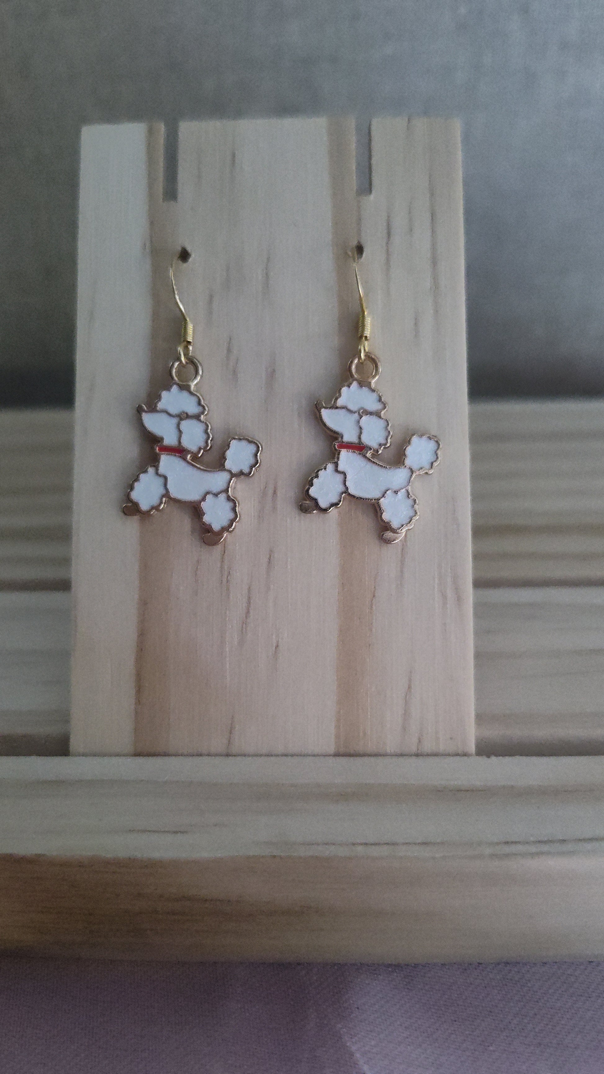 Adorable white and gold poodle dog earrings. Made with 18k gold sterling silver plated hooks and hypoallergenic as well.