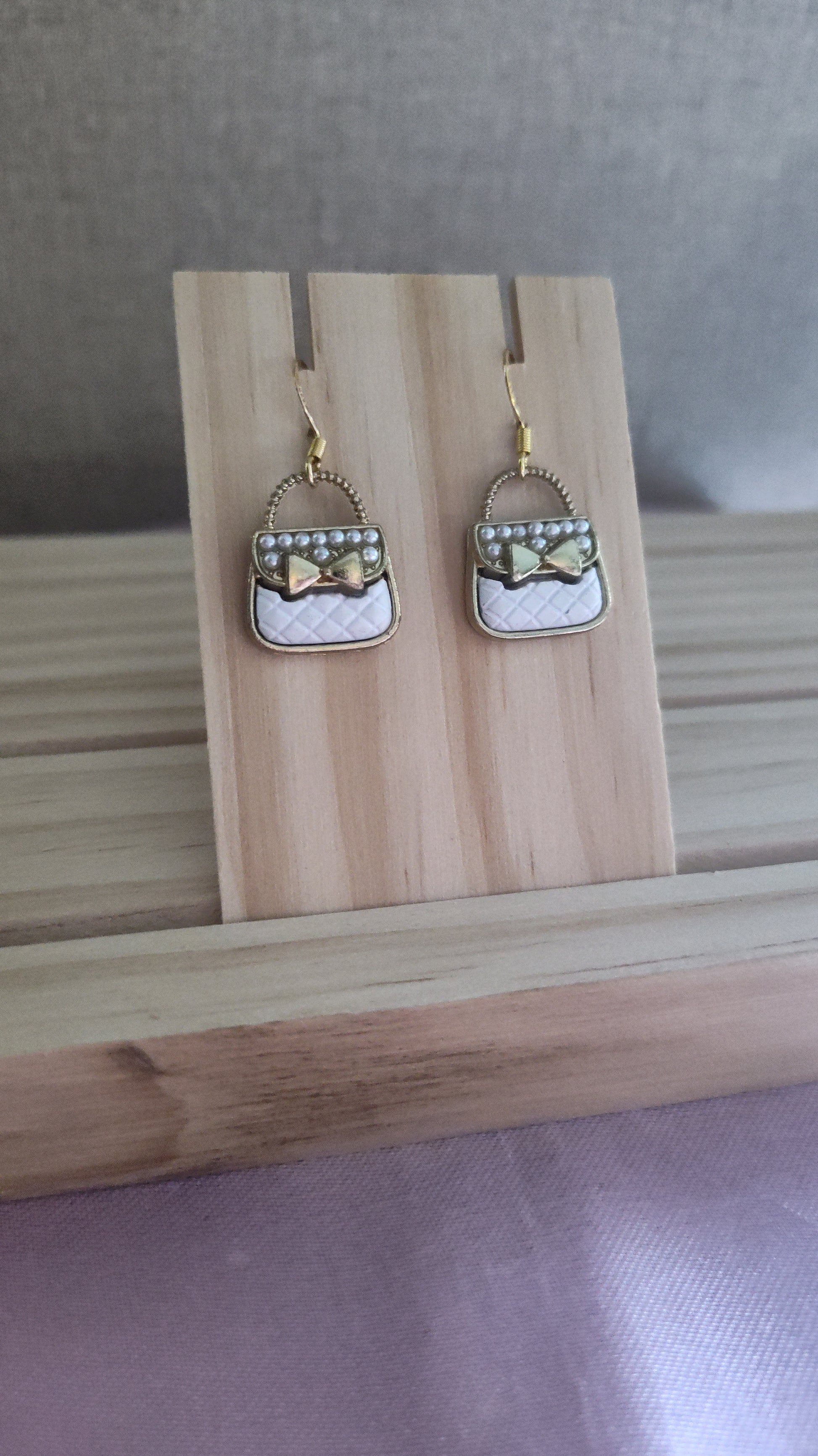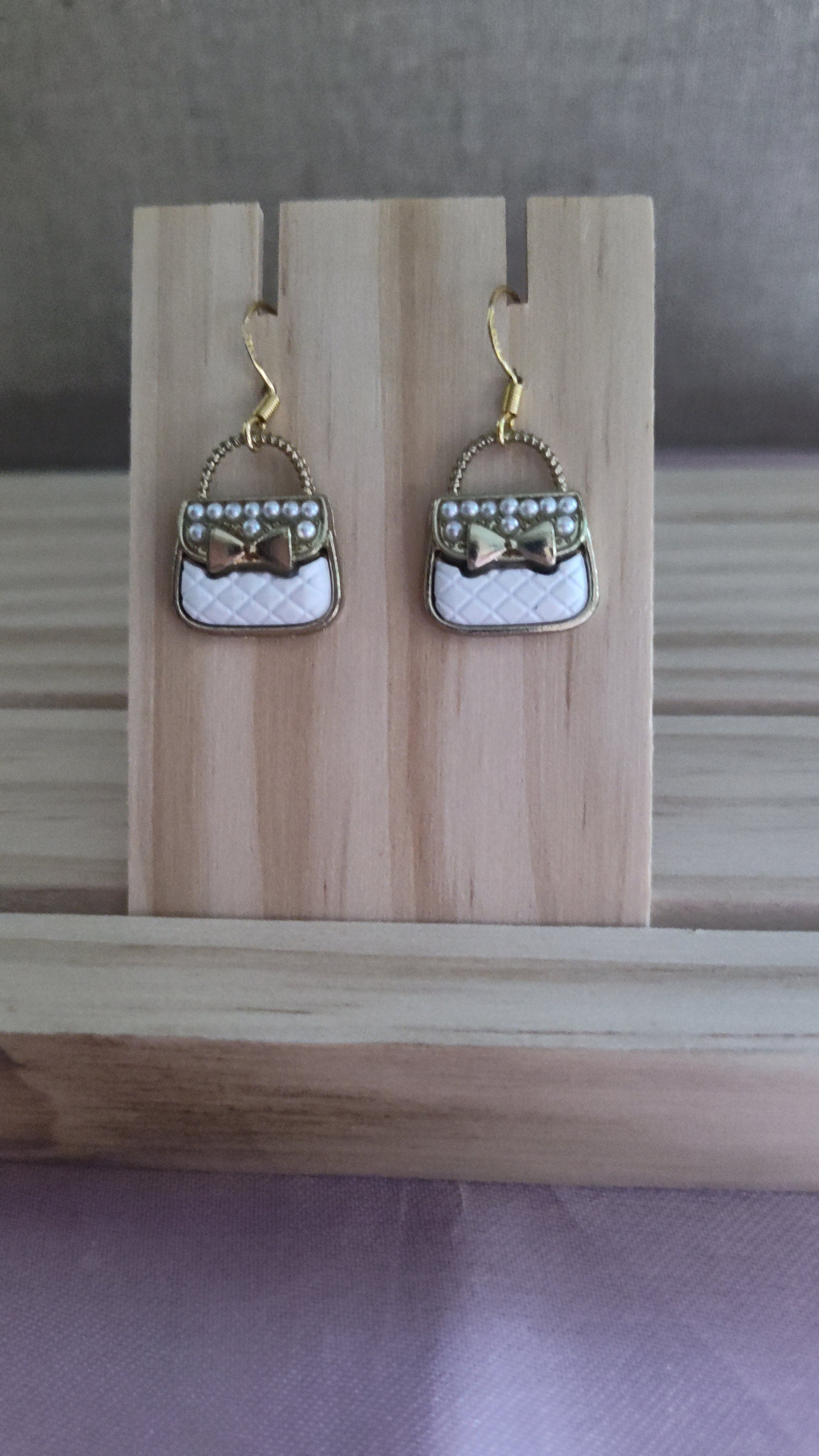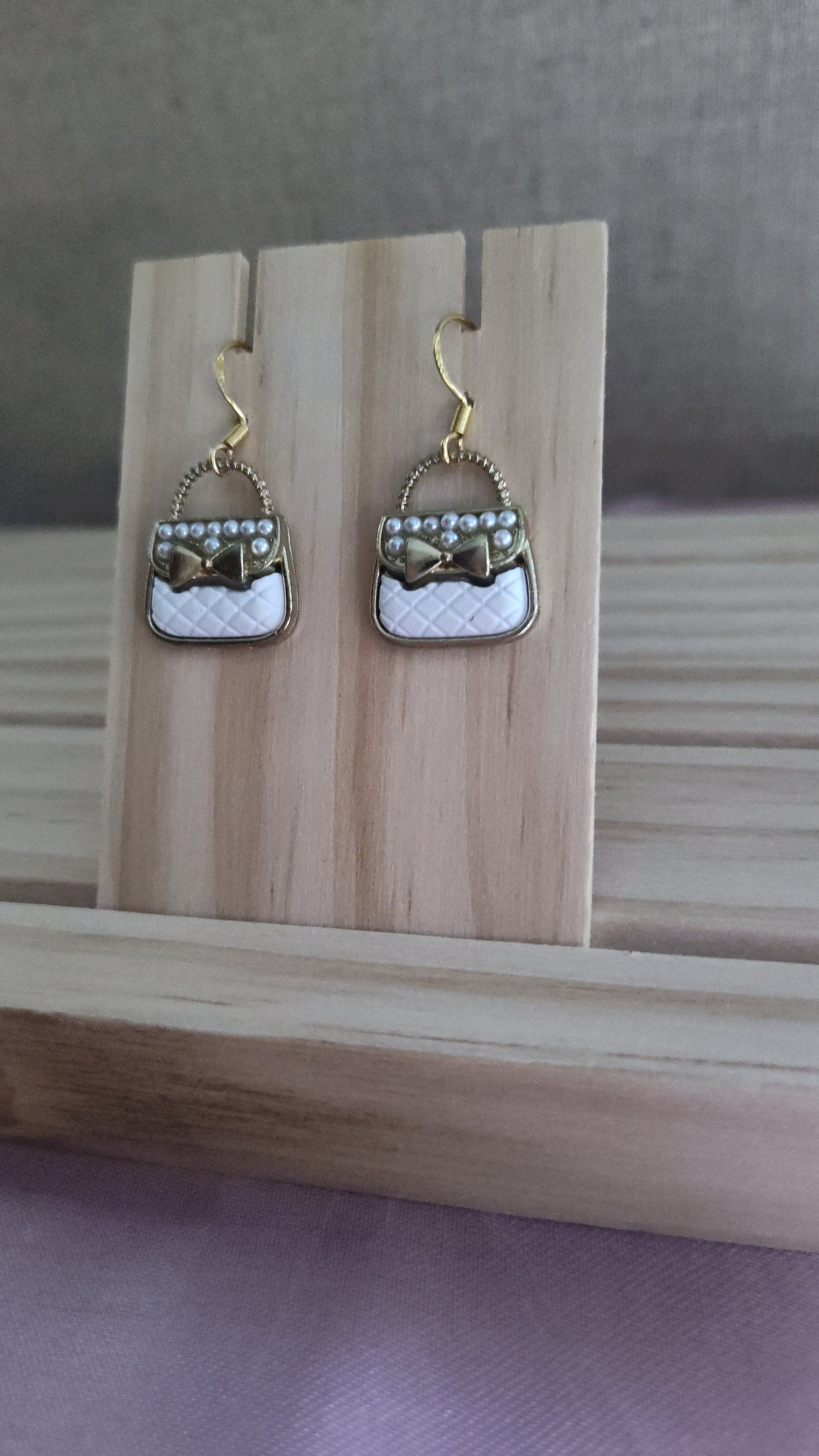 Adorable white and gold handbag earrings. Made with 18k gold sterling silver plated hooks and hypoallergenic as well.