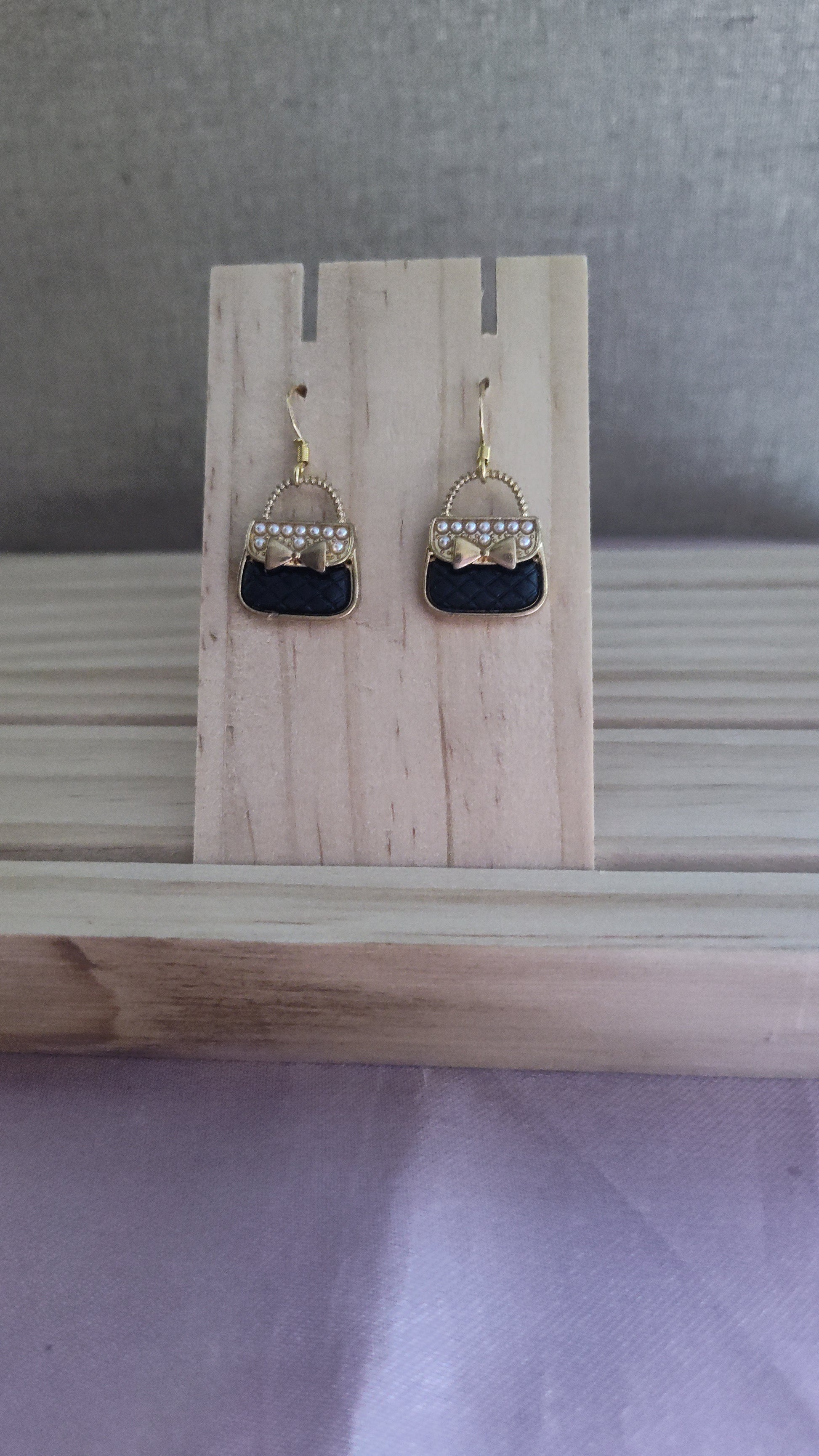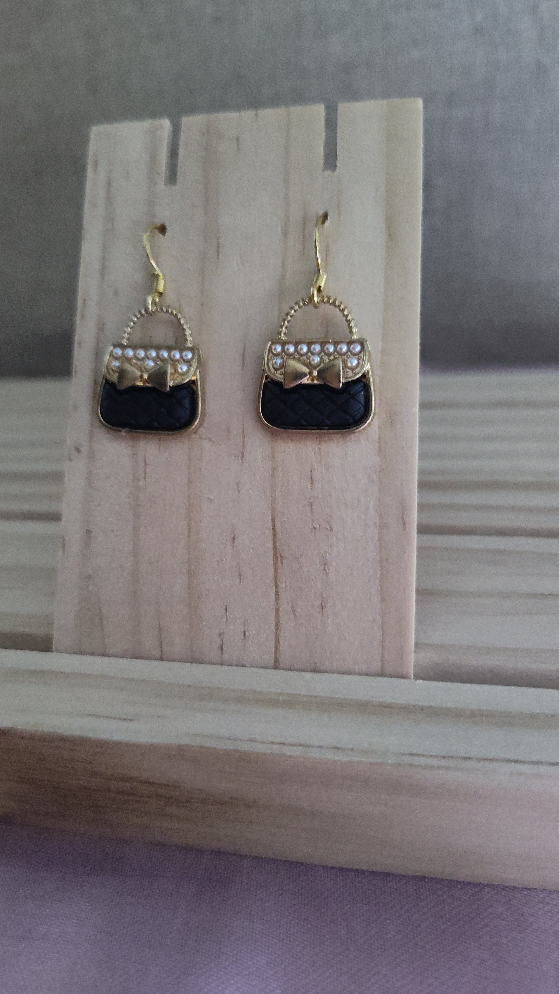 Adorable black and gold handbag earrings. Made with 18k gold sterling silver plated hooks and hypoallergenic as well.