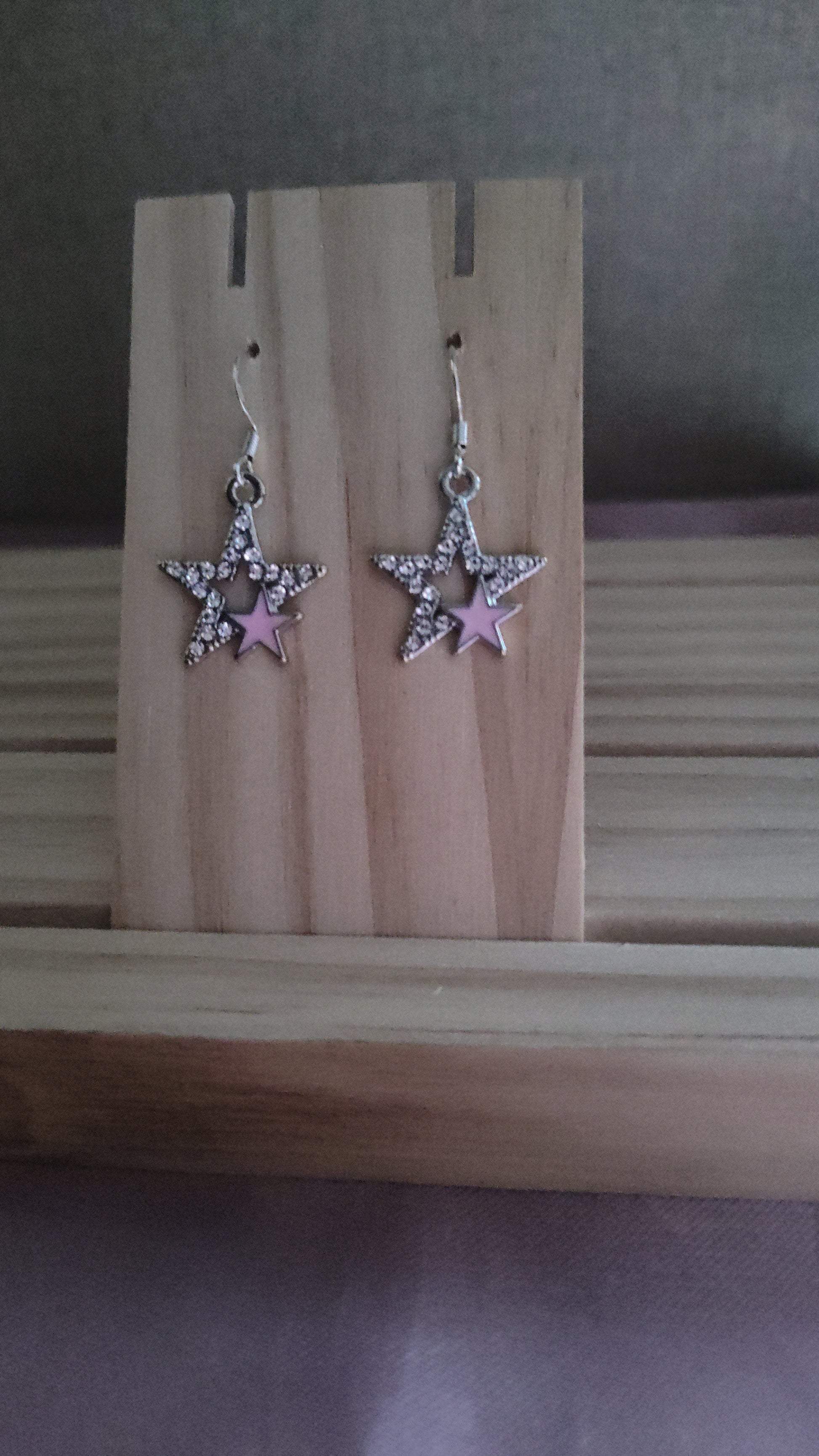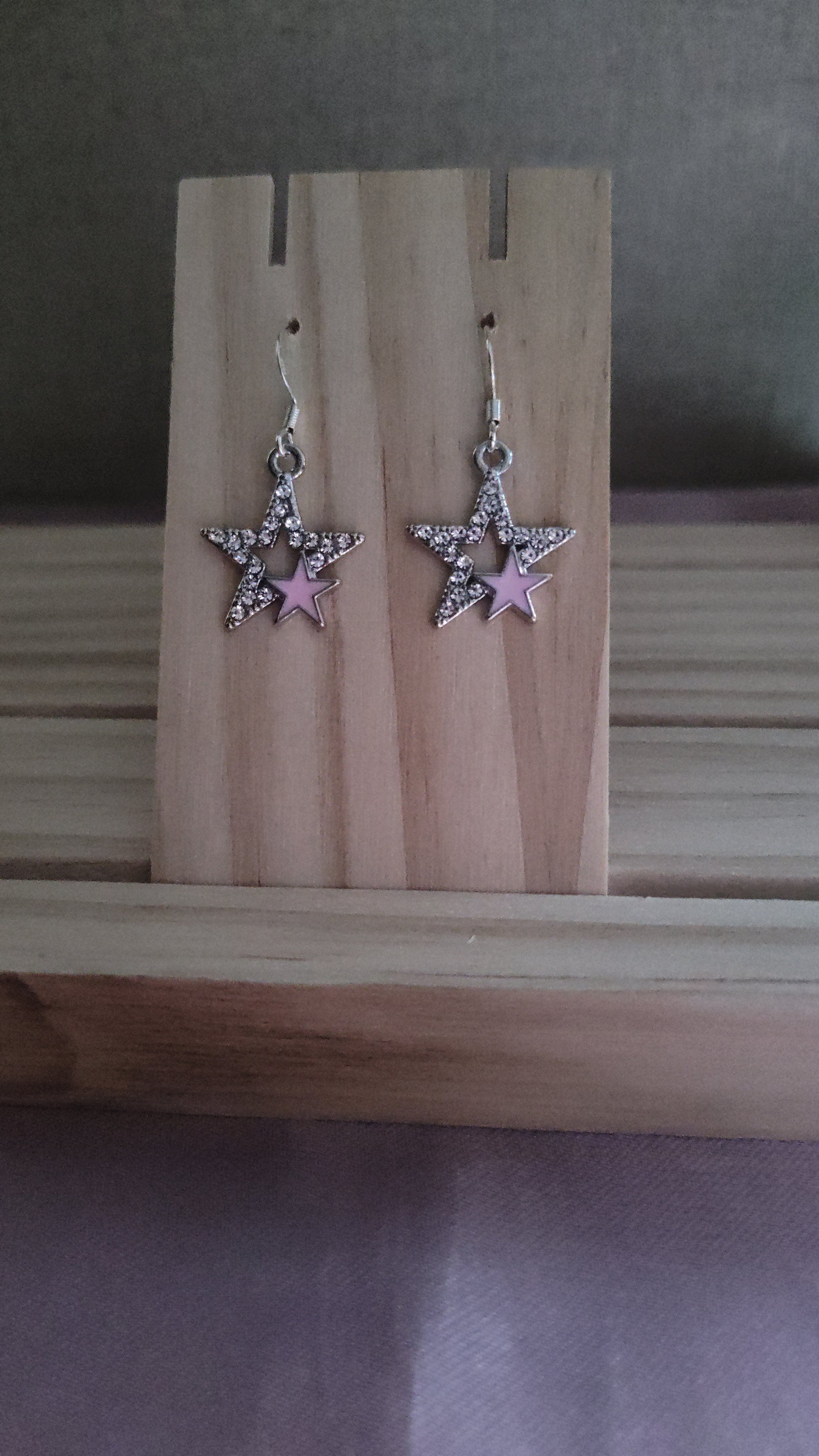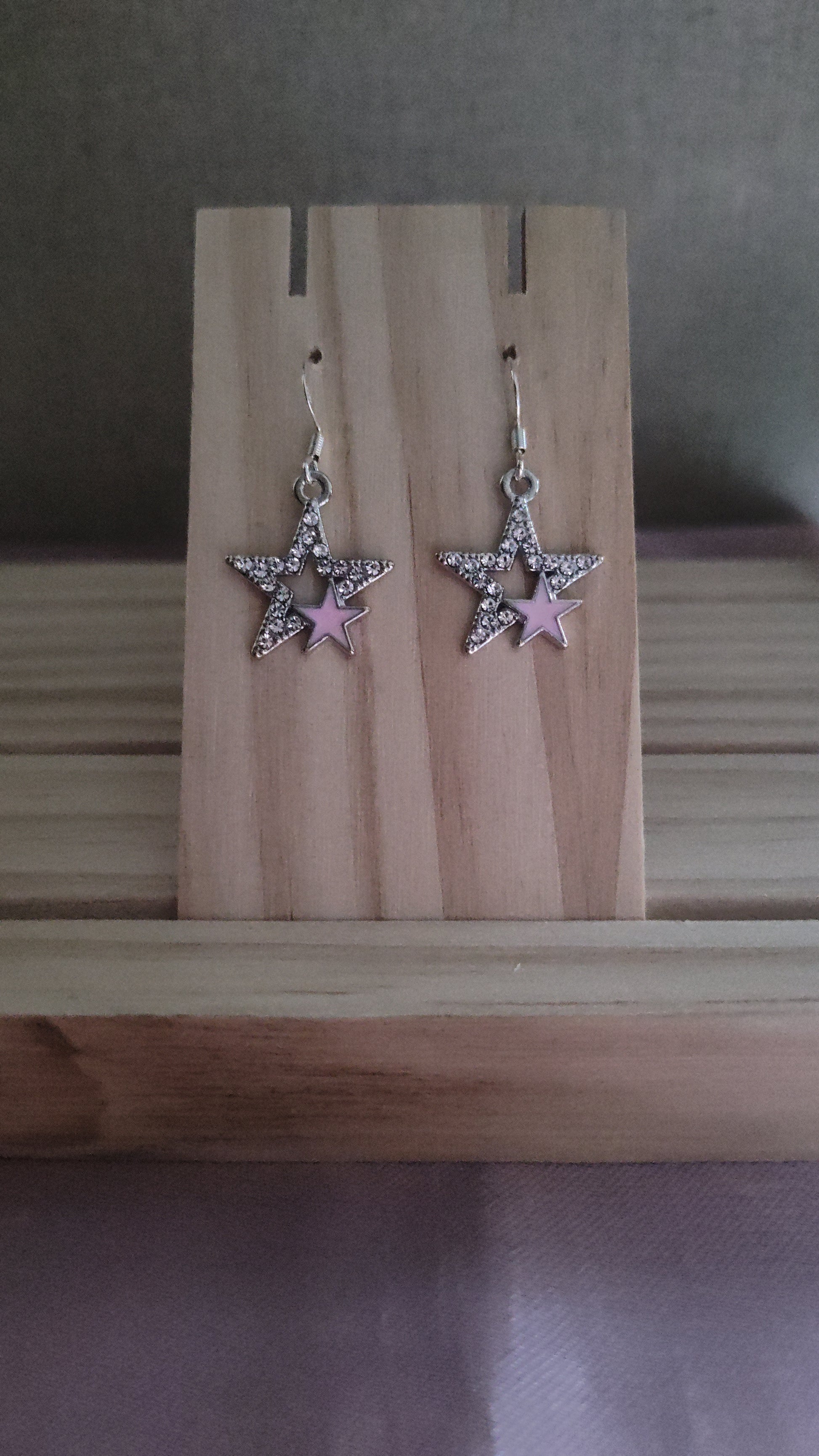 Beautiful silver star earrings with rhinestones and small pink star. Made with sterling silver plated hooks and hypoallergenic as well.