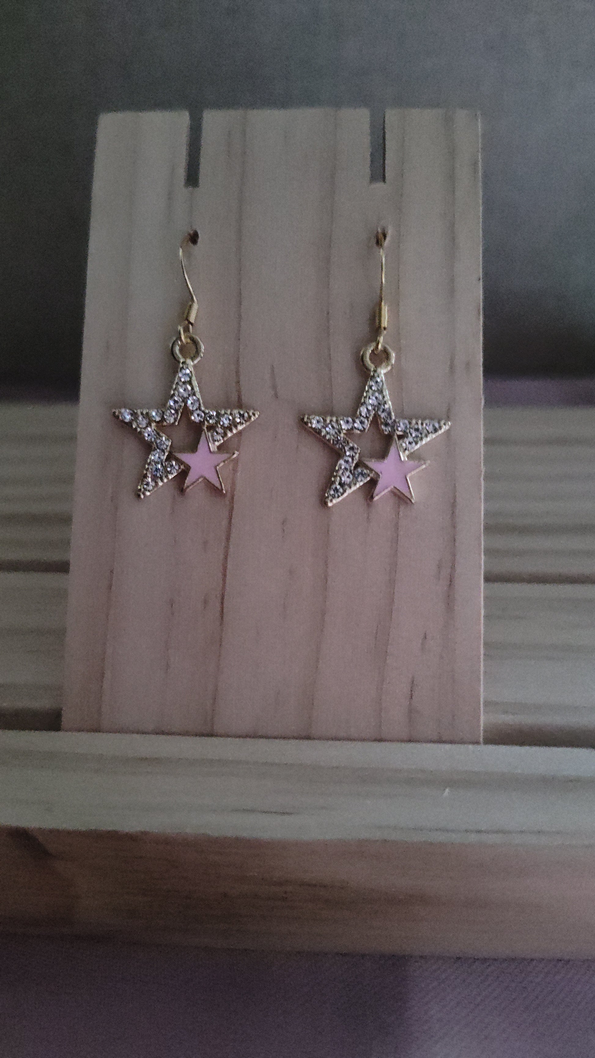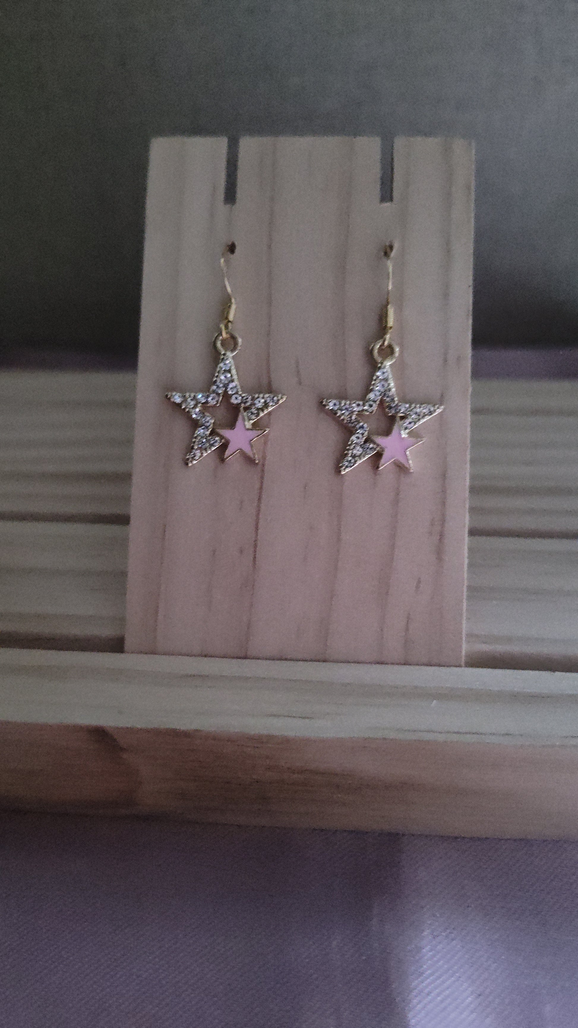 Beautiful gold star earrings with rhinestones and small pink star. Made with 18k gold sterling silver plated hooks and hypoallergenic as well.