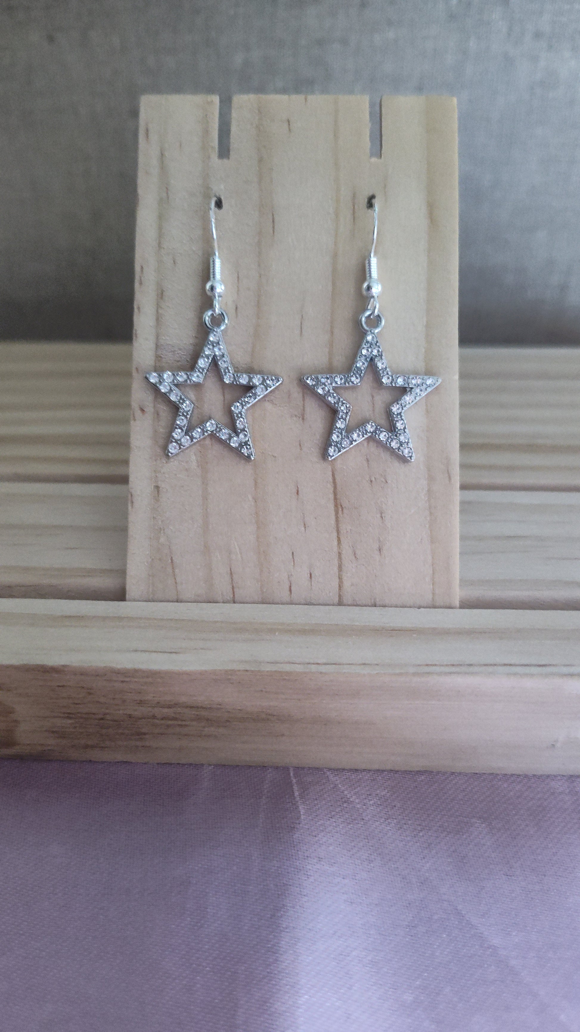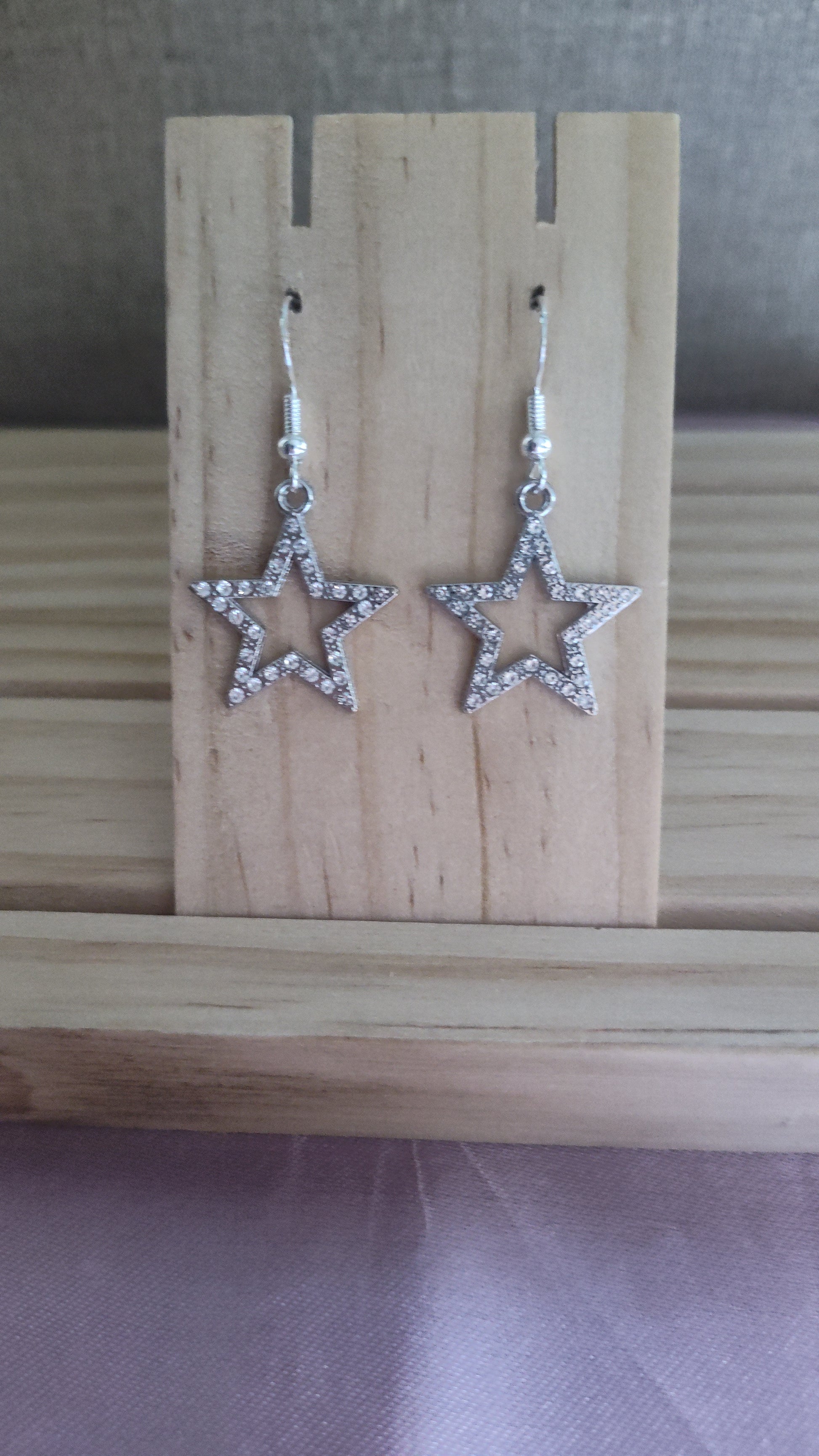 Beautiful silver star earrings with rhinestones. Made with sterling silver plated hooks and hypoallergenic as well.