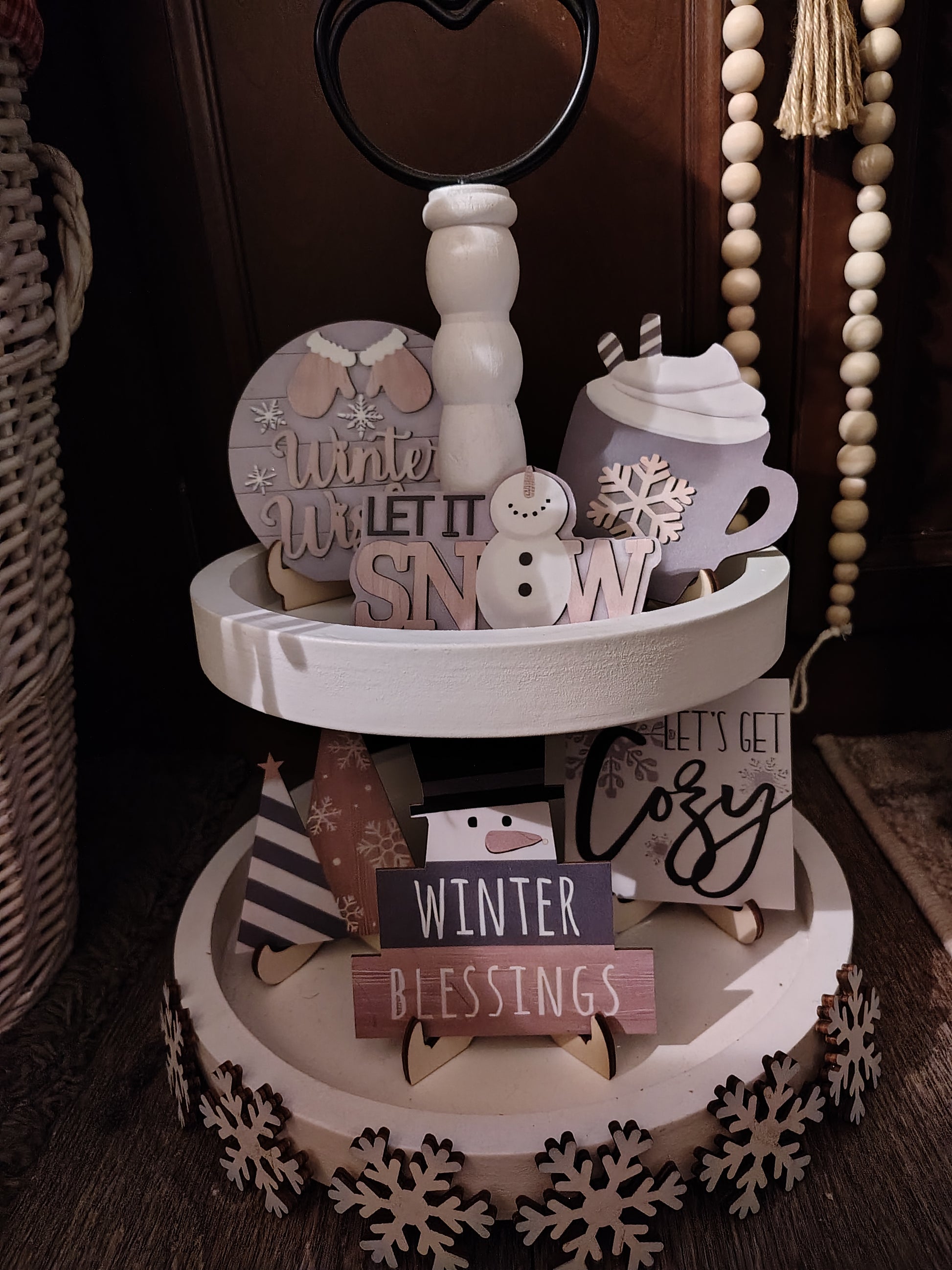 Super cute and fun tiered tray decor for Winter time. Set does not include the tray. I purchased mine on Amazon, they have some nice ones.