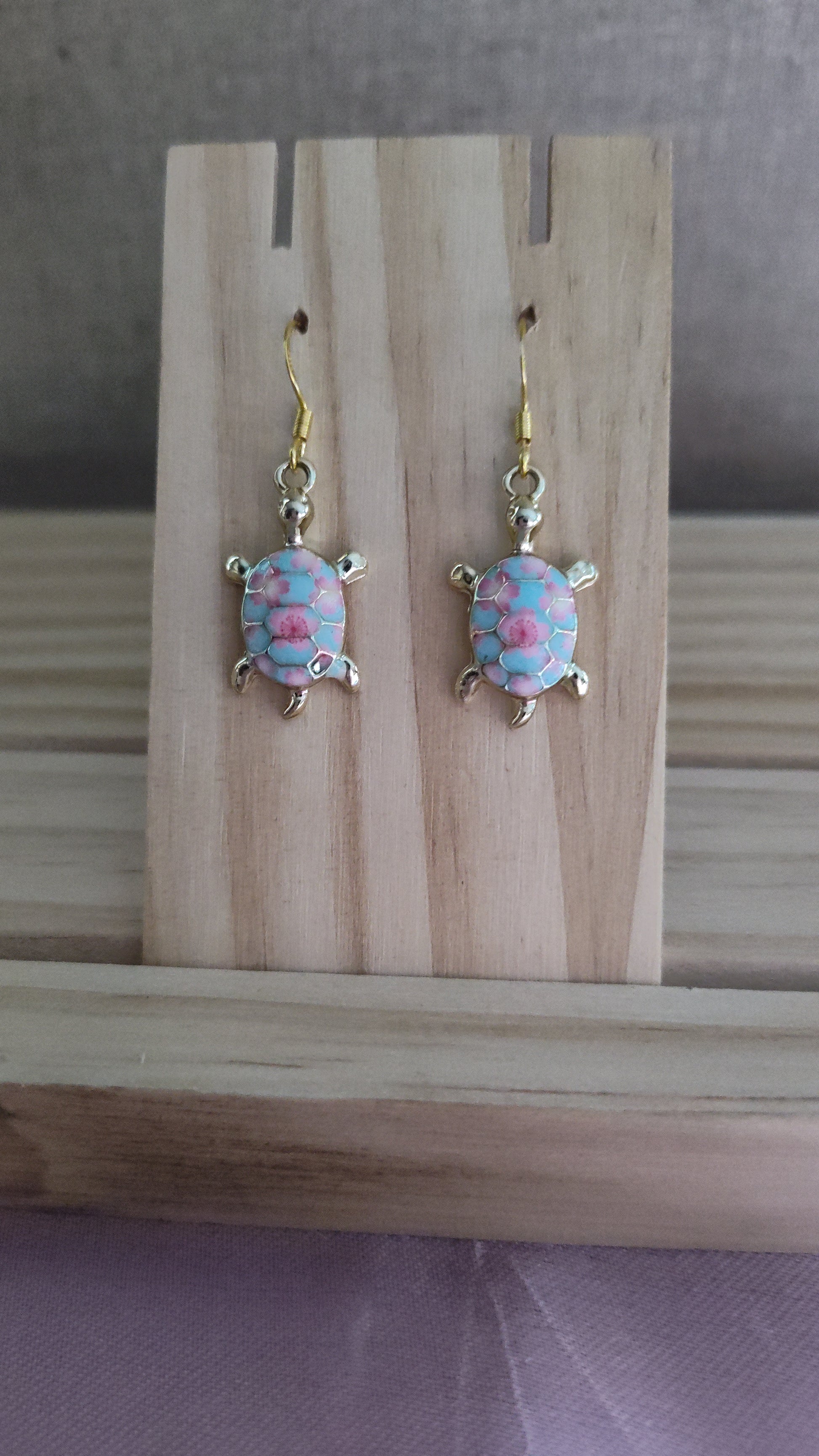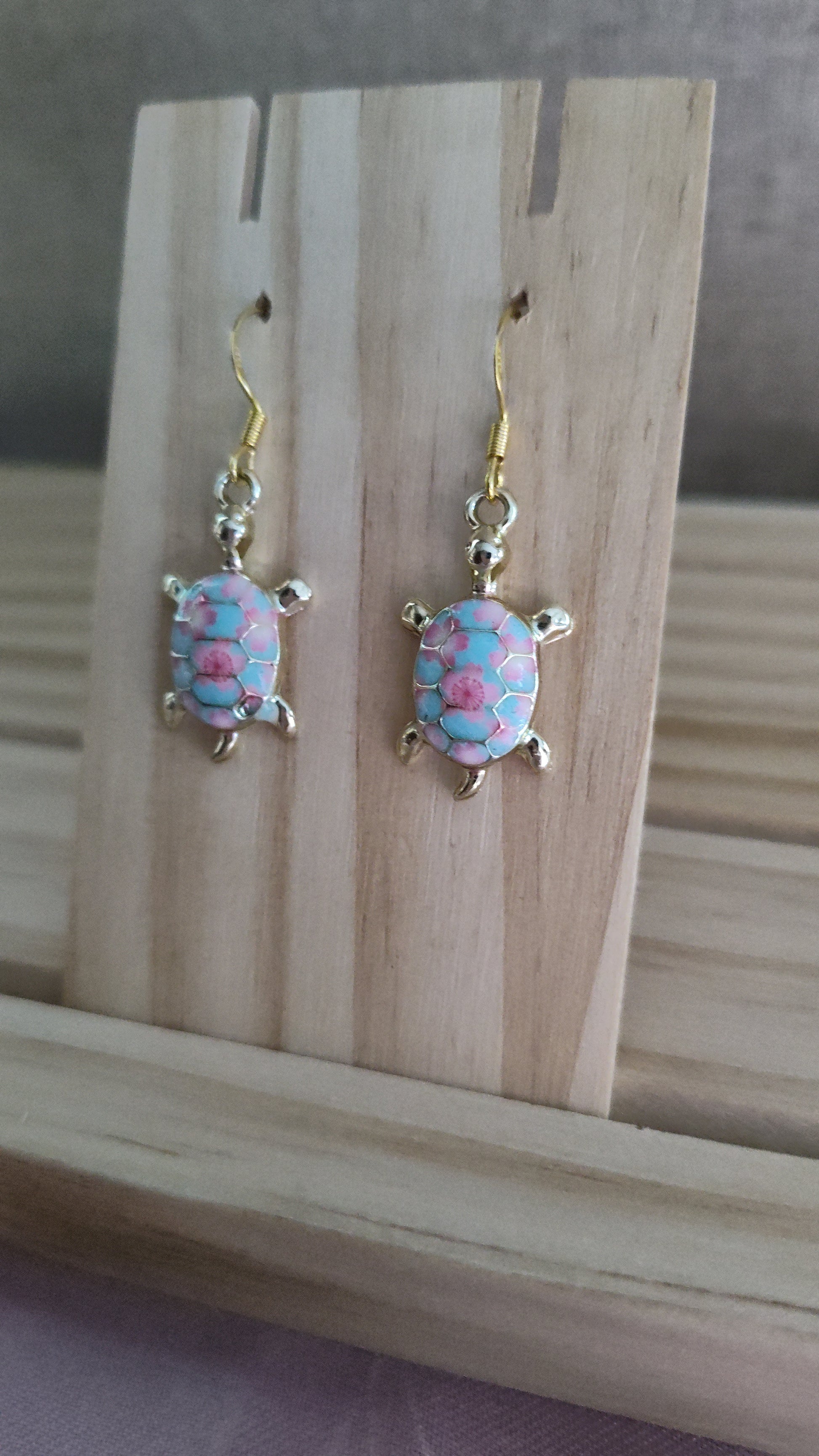 Cute pink, blue, and gold turtle earrings. Made with 18k gold sterling silver plated hooks and hypoallergenic as well.