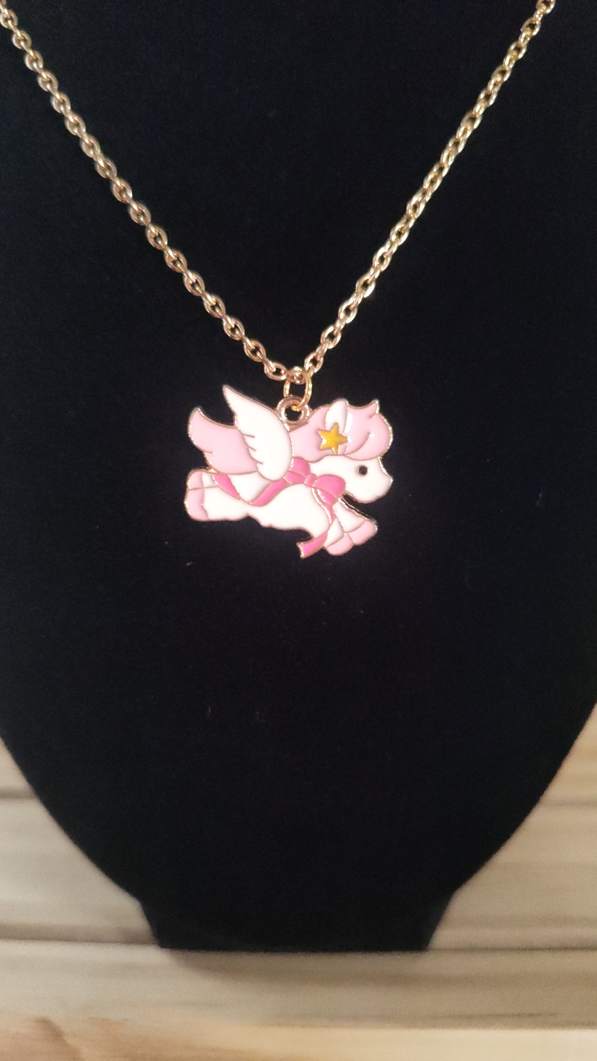 Cute pink and gold unicorn necklace.
